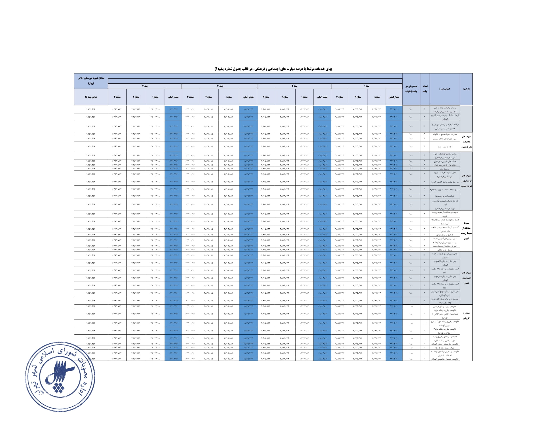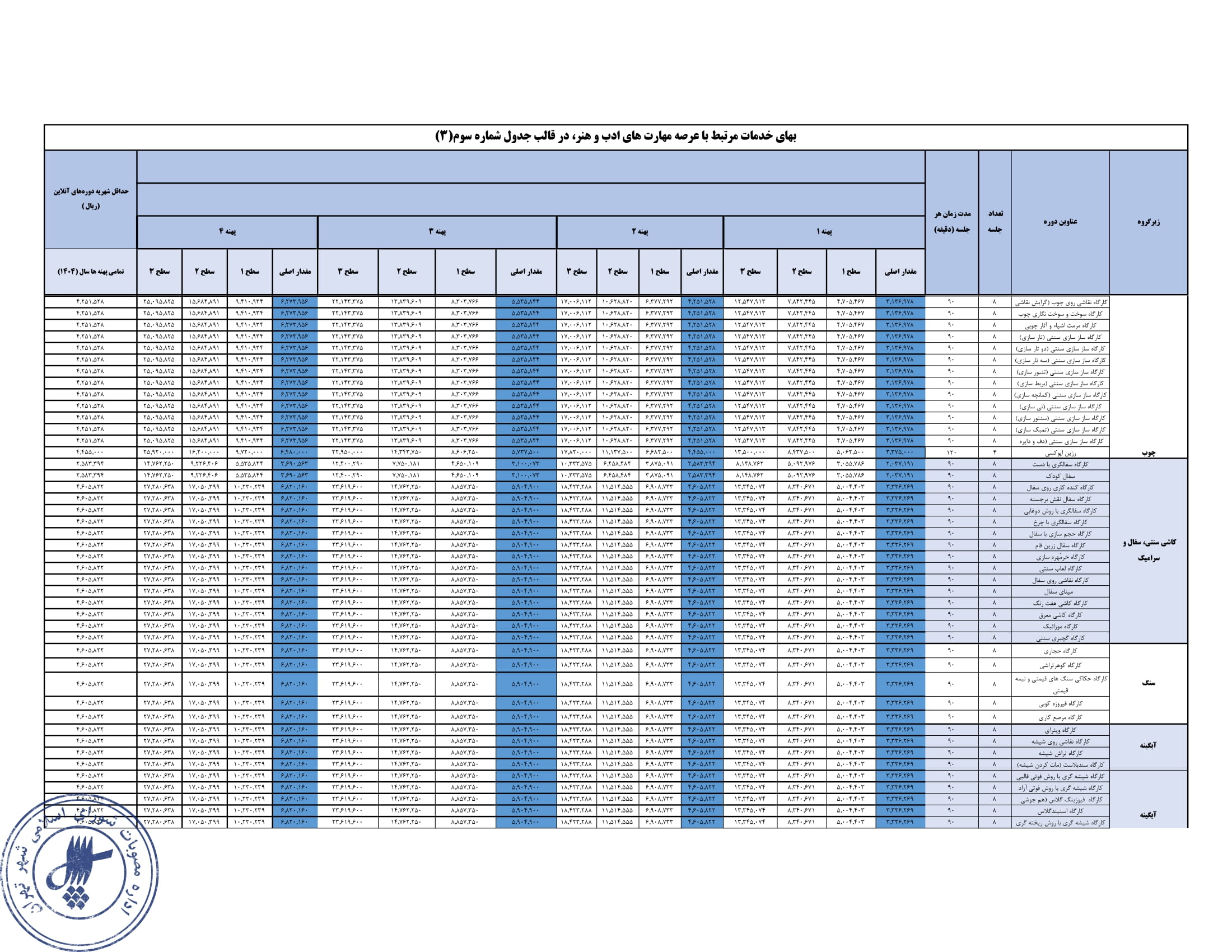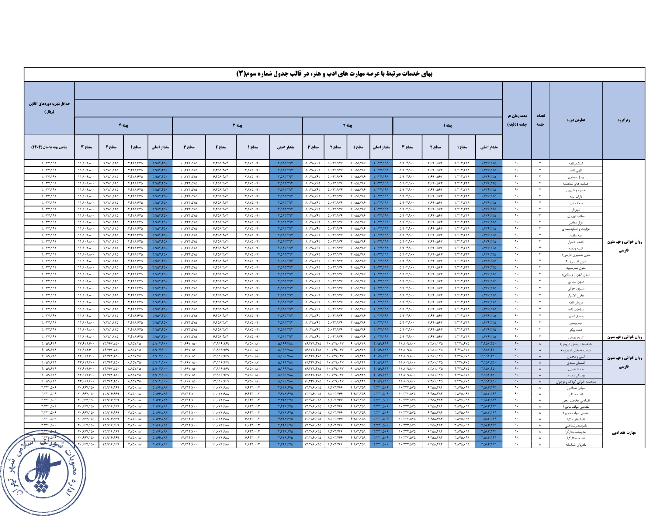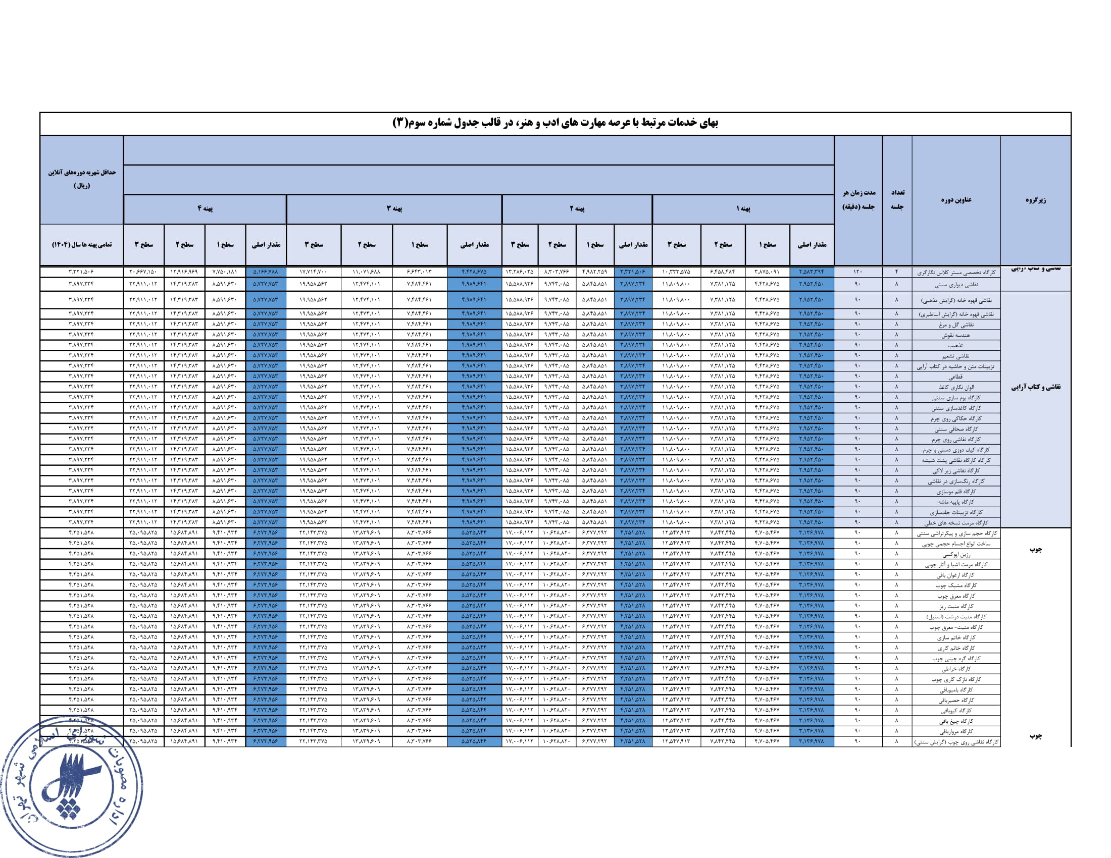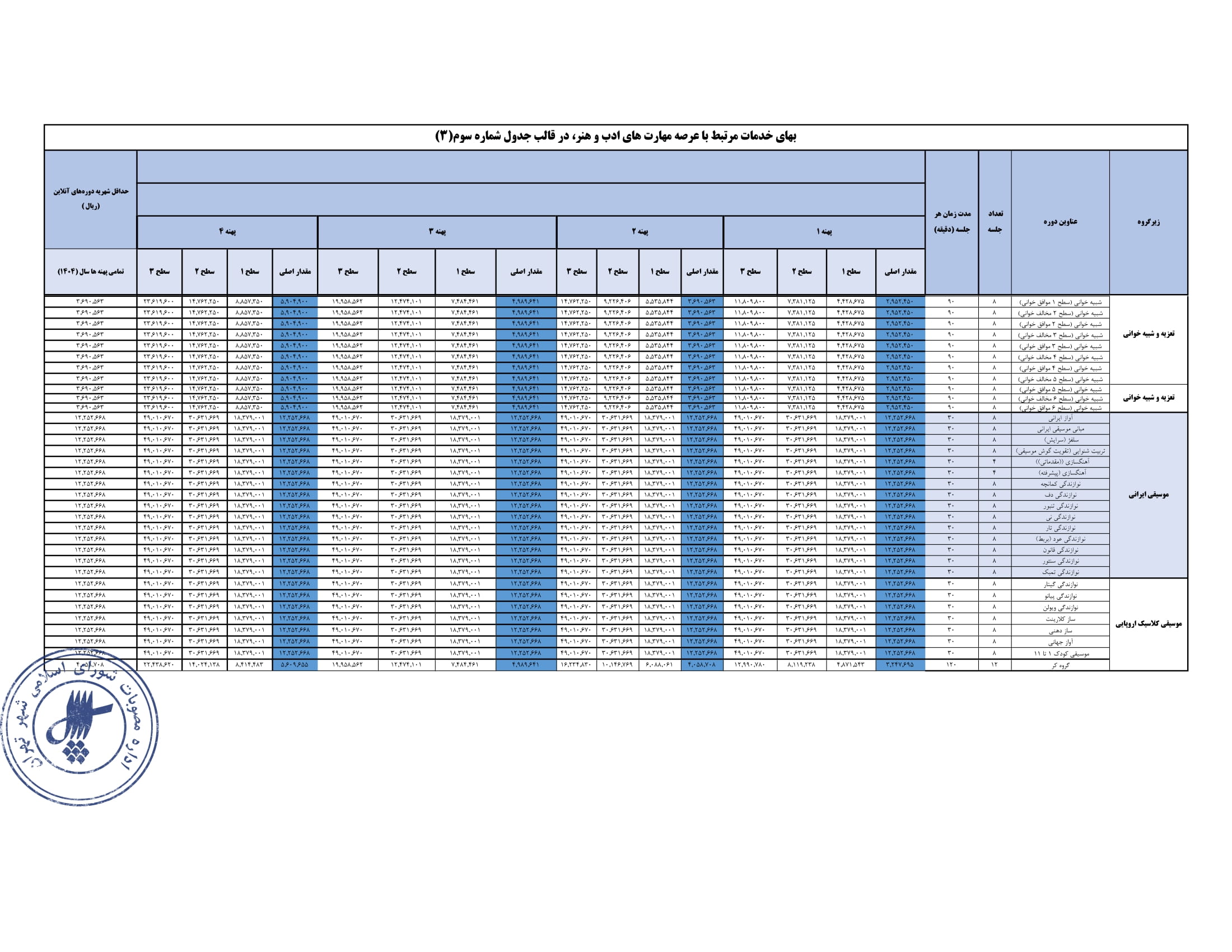تعيين بهاي خدمات استفاده از مراكز فرهنگي و هنري - سازمان فرهنگي هنري شهرداري تهران در سال 1404