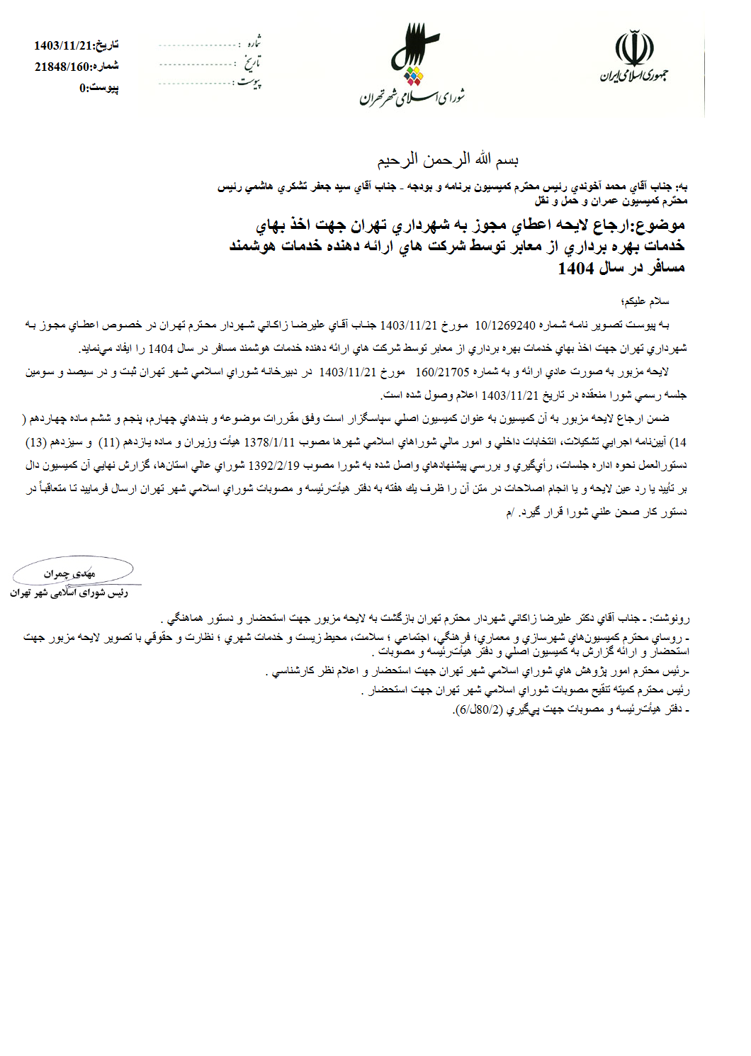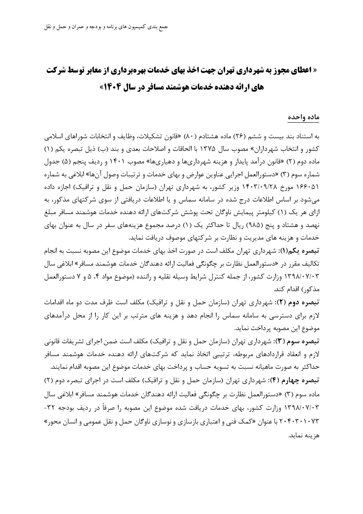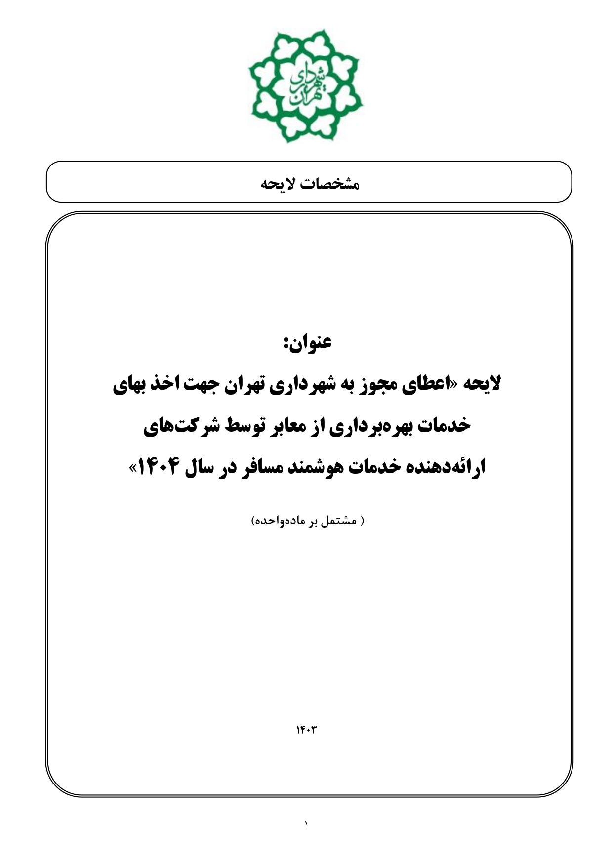 تعيين بهاي خدمات اعطاي مجوز به شهرداري تهران جهت اخذ بهاي خدمات بهرهبرداري از معابر توسط شركتهاي ارائهدهنده خدمات هوشمند مسافر در سال 1404