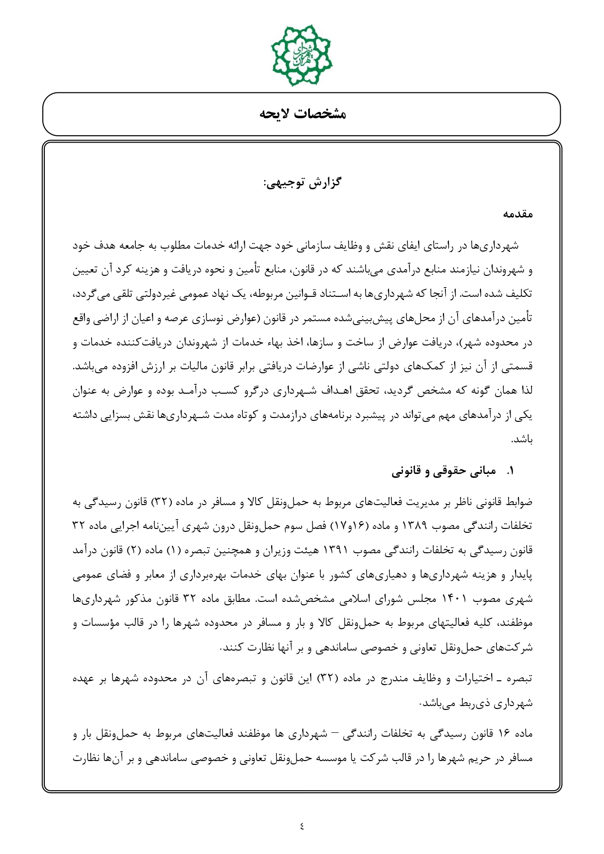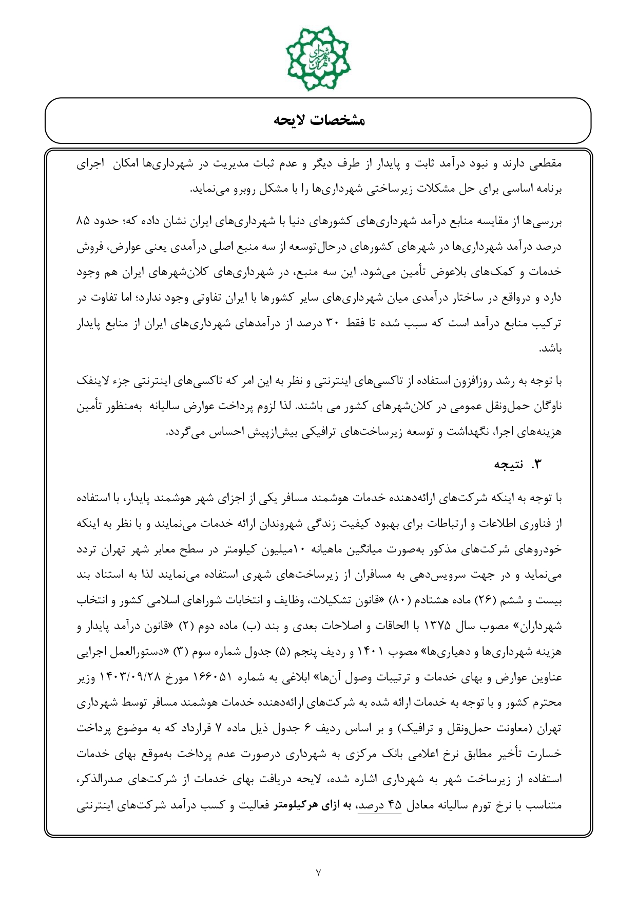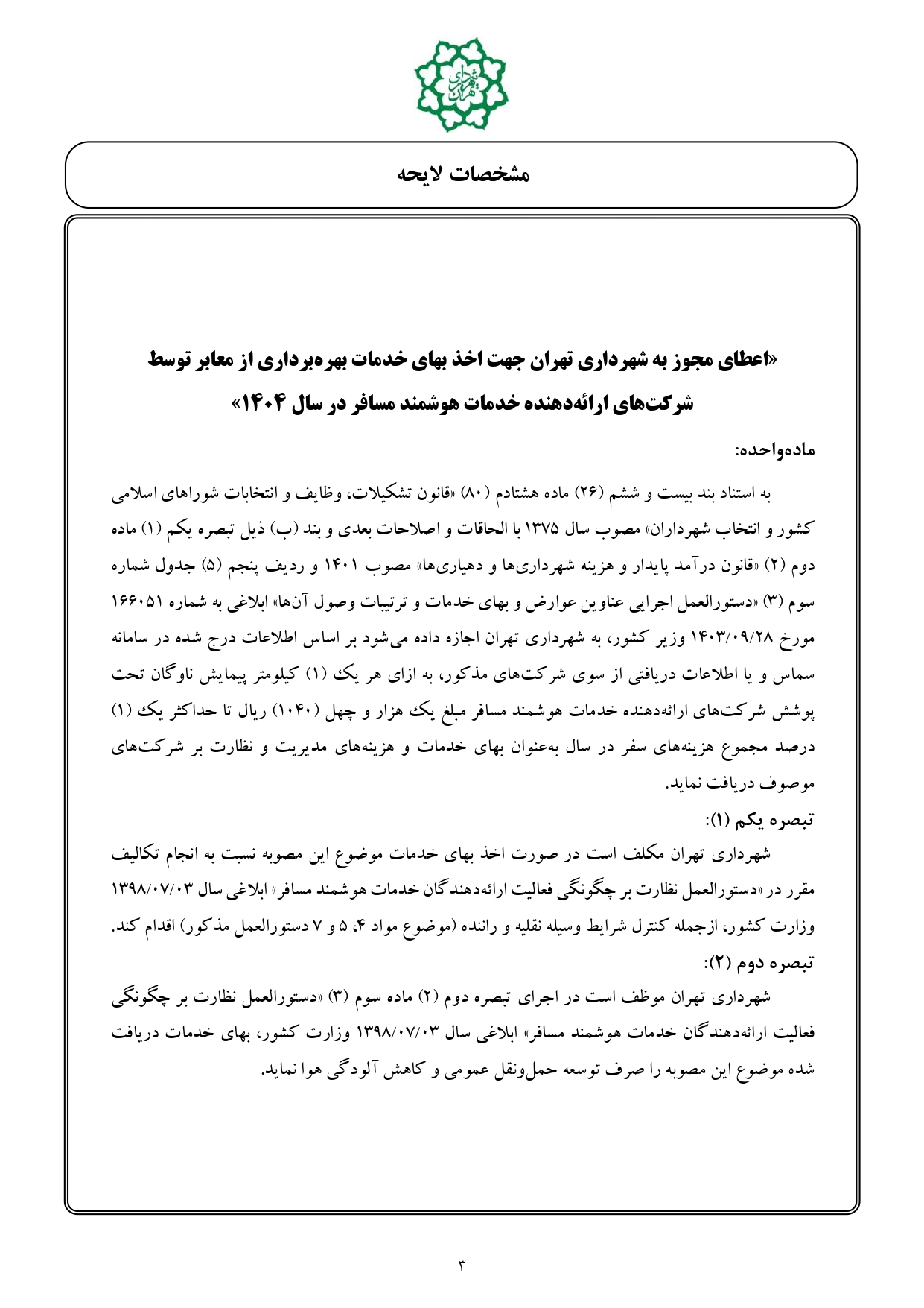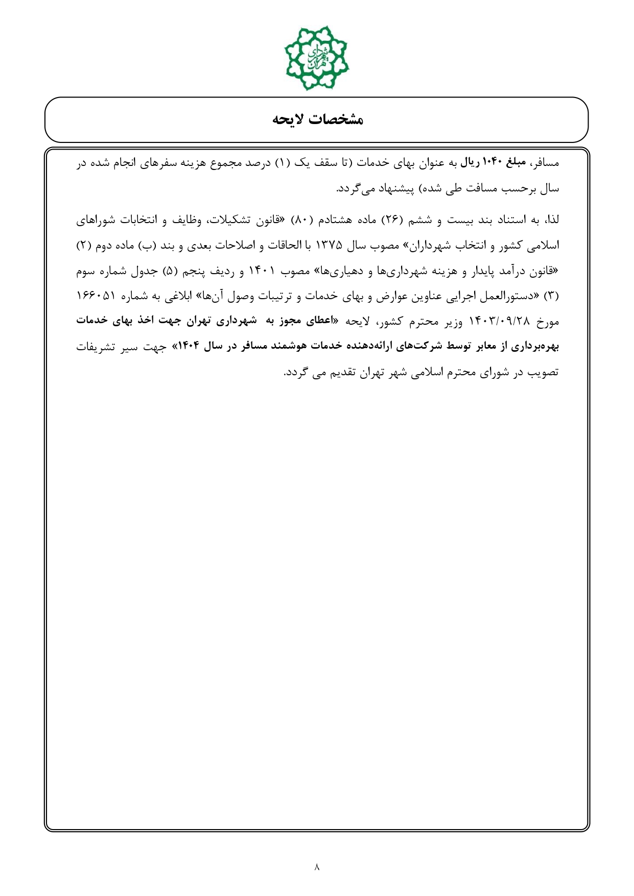 تعيين بهاي خدمات اعطاي مجوز به شهرداري تهران جهت اخذ بهاي خدمات بهرهبرداري از معابر توسط شركتهاي ارائهدهنده خدمات هوشمند مسافر در سال 1404