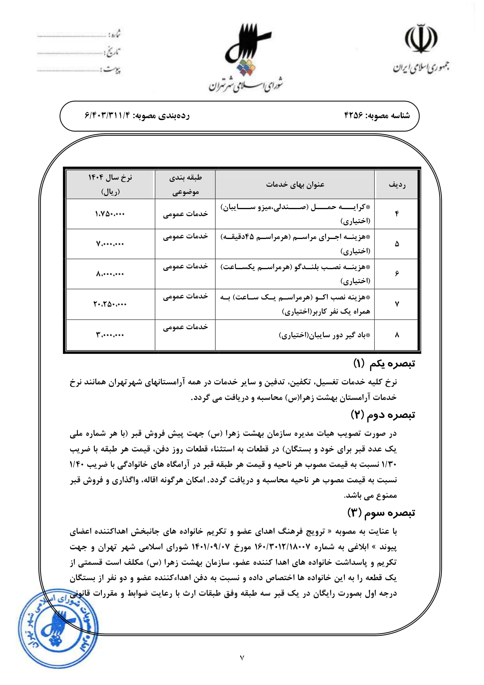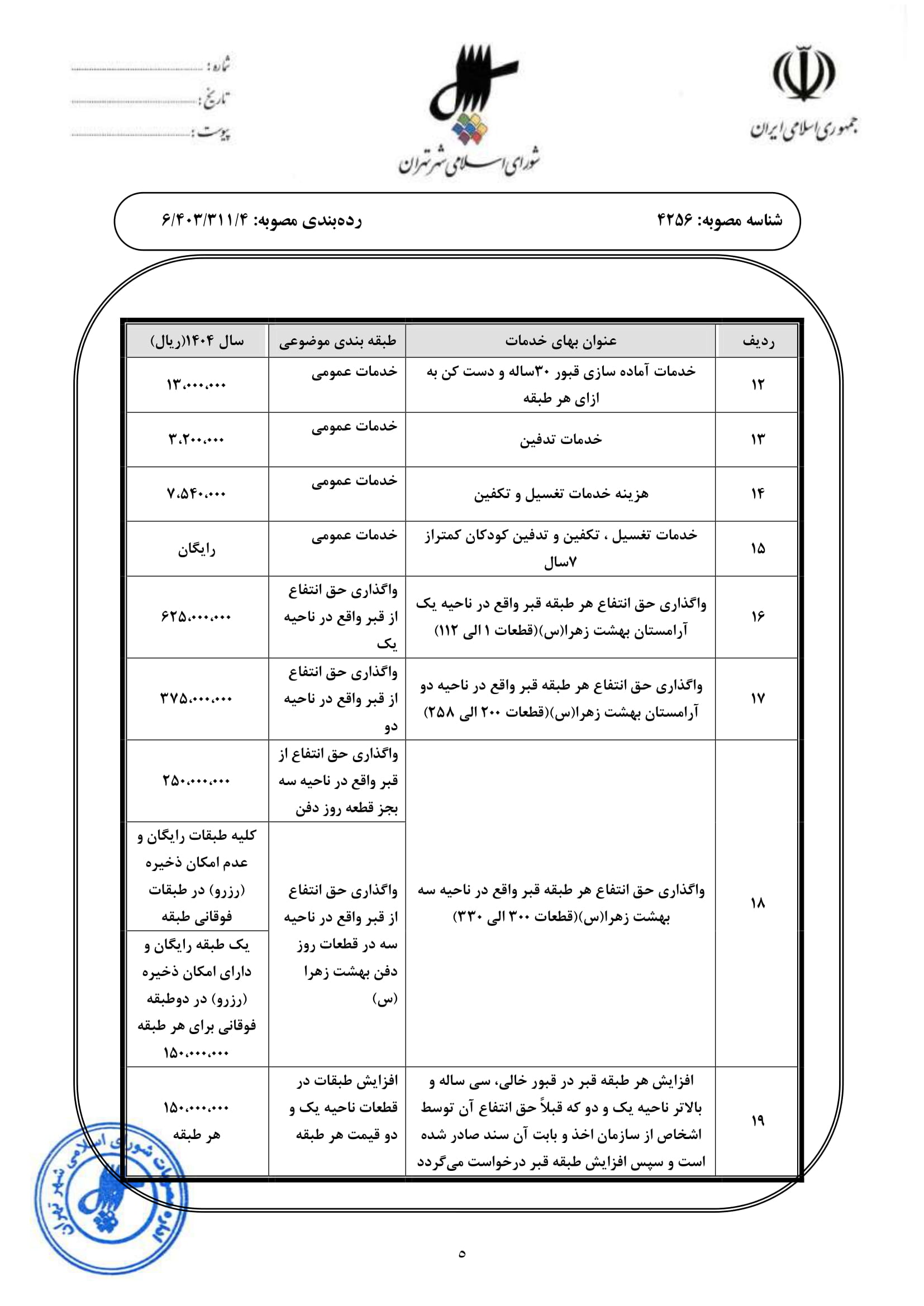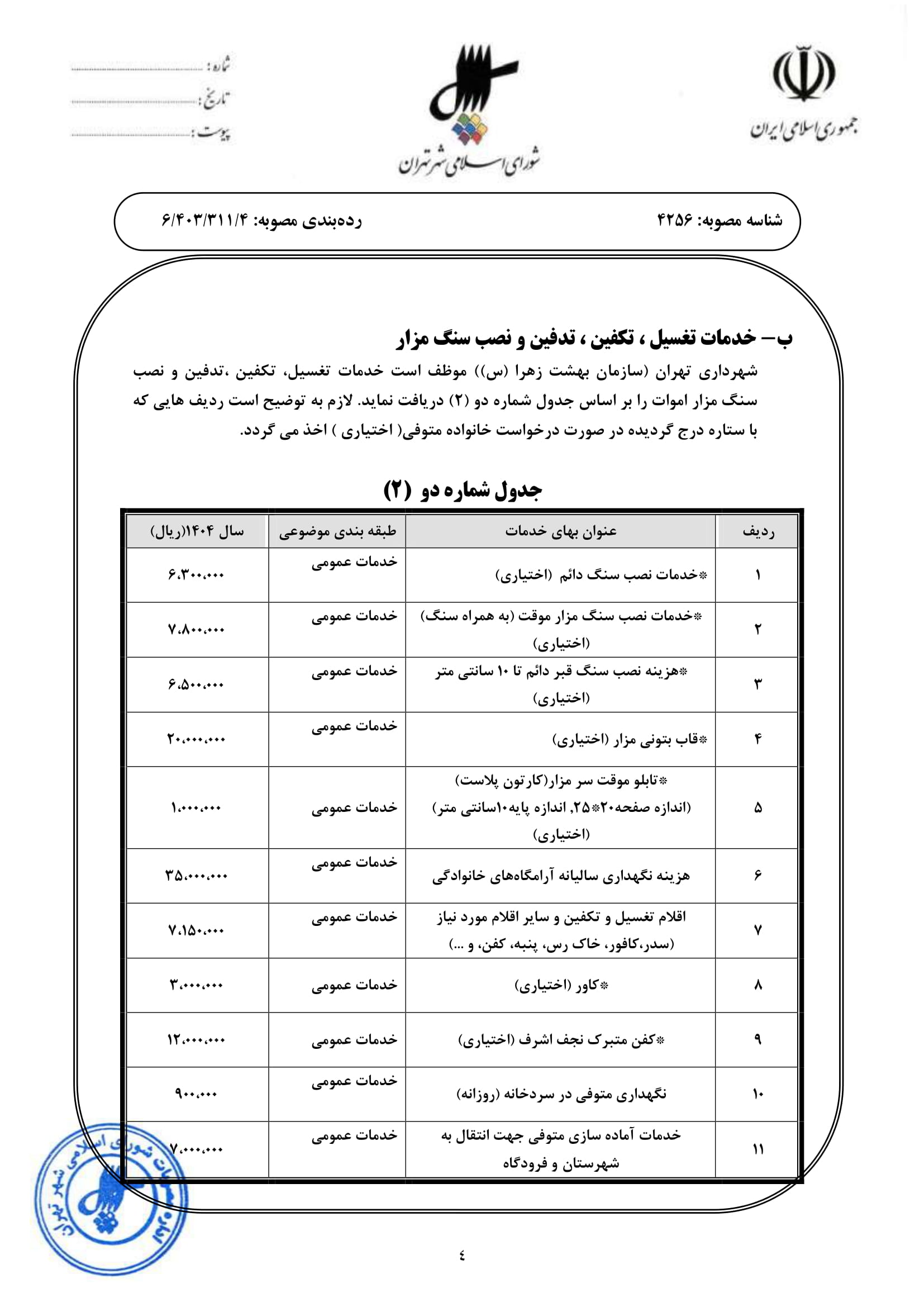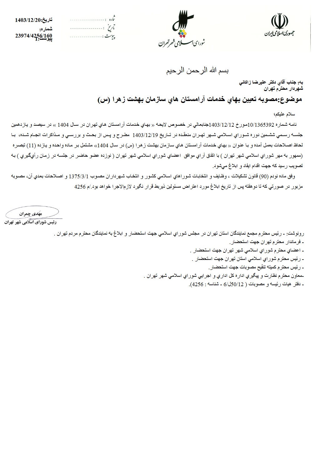 بهاي خدمات آرامستانهاي سازمان بهشت زهرا (س) در سال 1404