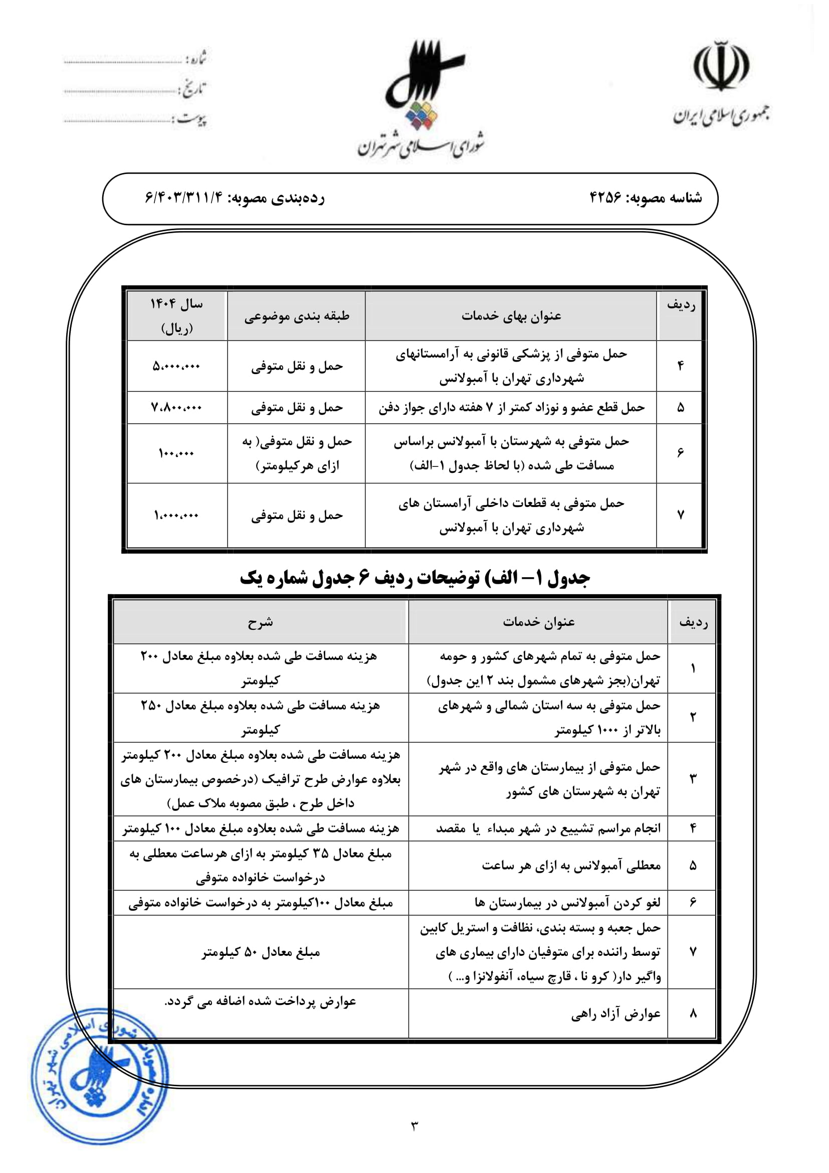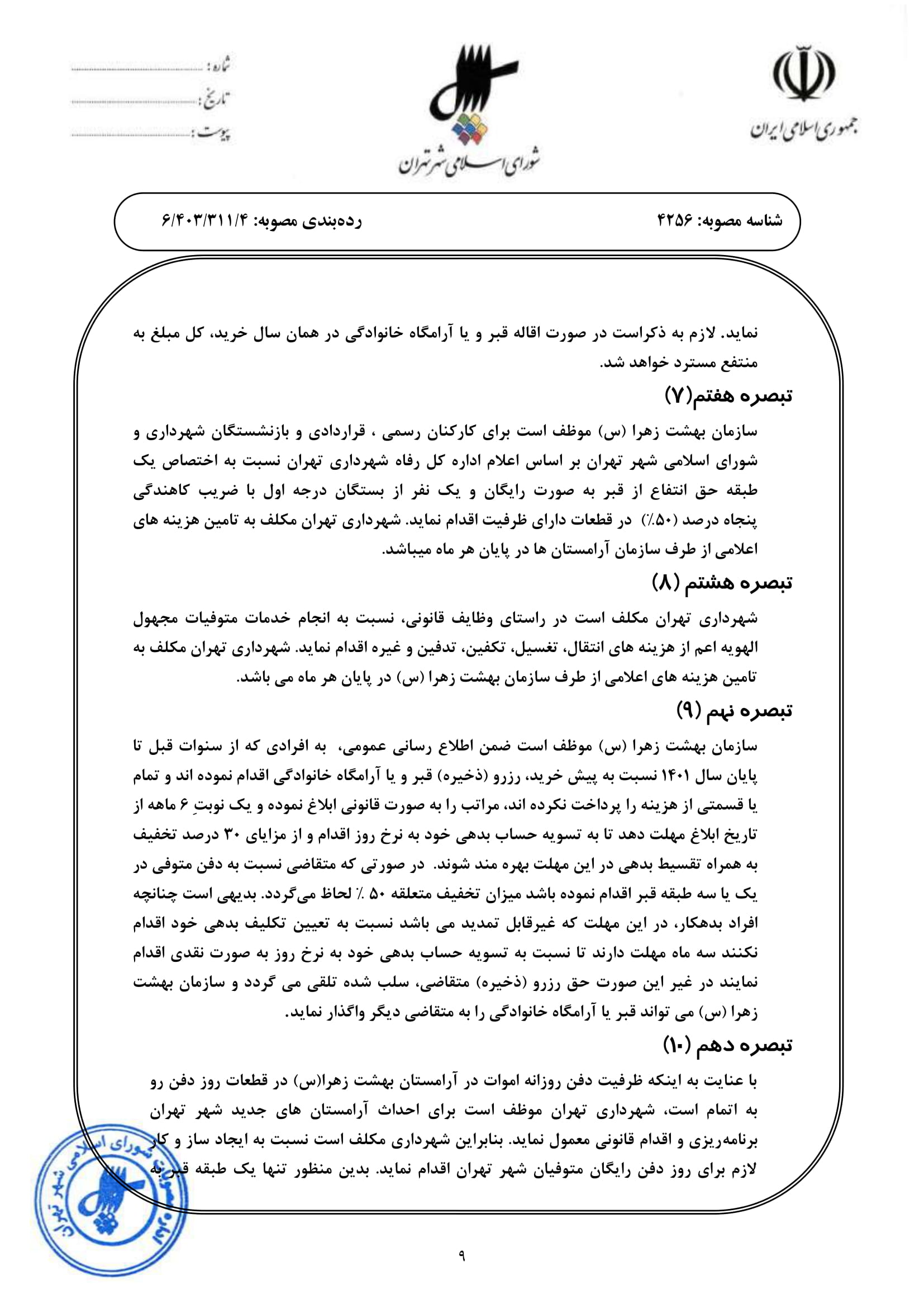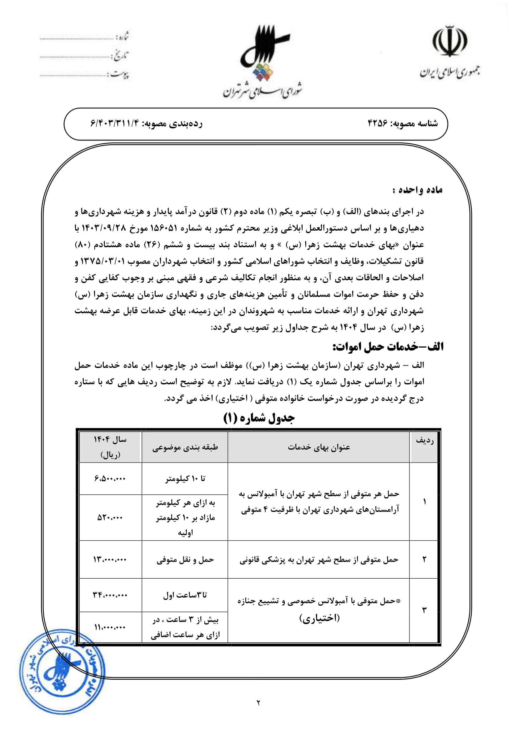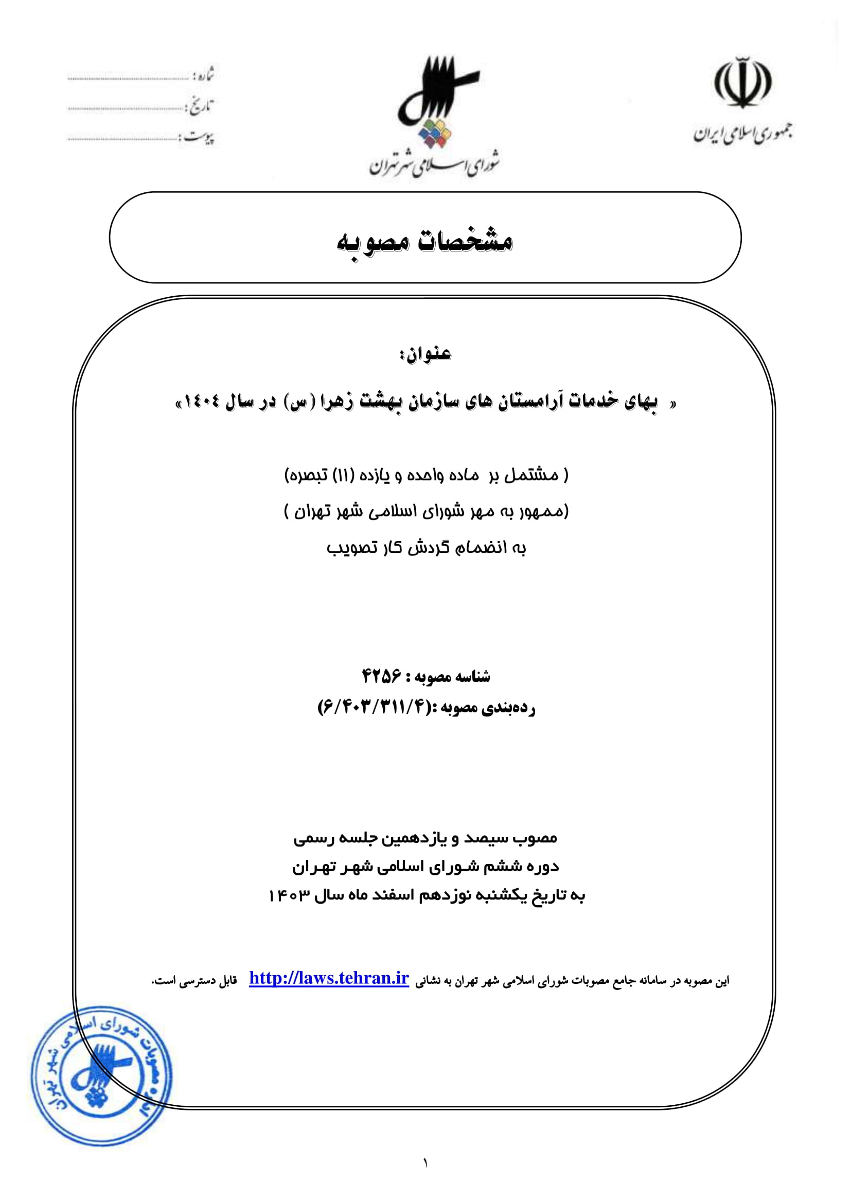بهاي خدمات آرامستانهاي سازمان بهشت زهرا (س) در سال 1404