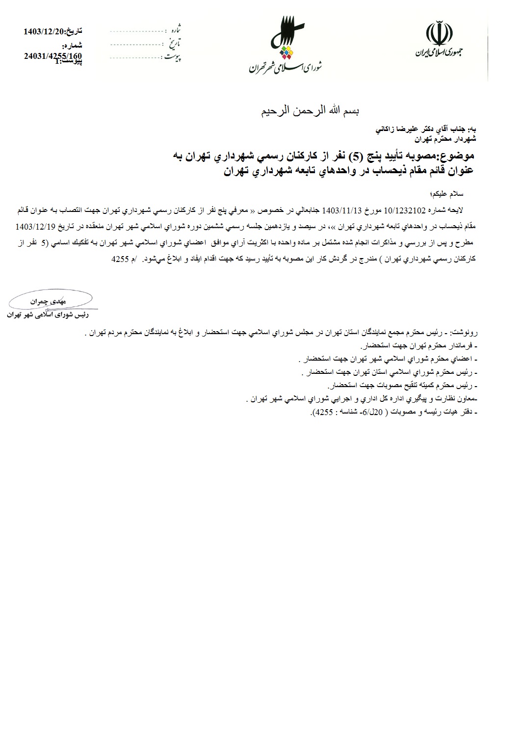 تأييد پنج (5) نفر از كاركنان رسمي شهرداري تهران به عنوان قائممقام ذيحساب در واحدهاي تابعه شهرداري تهران