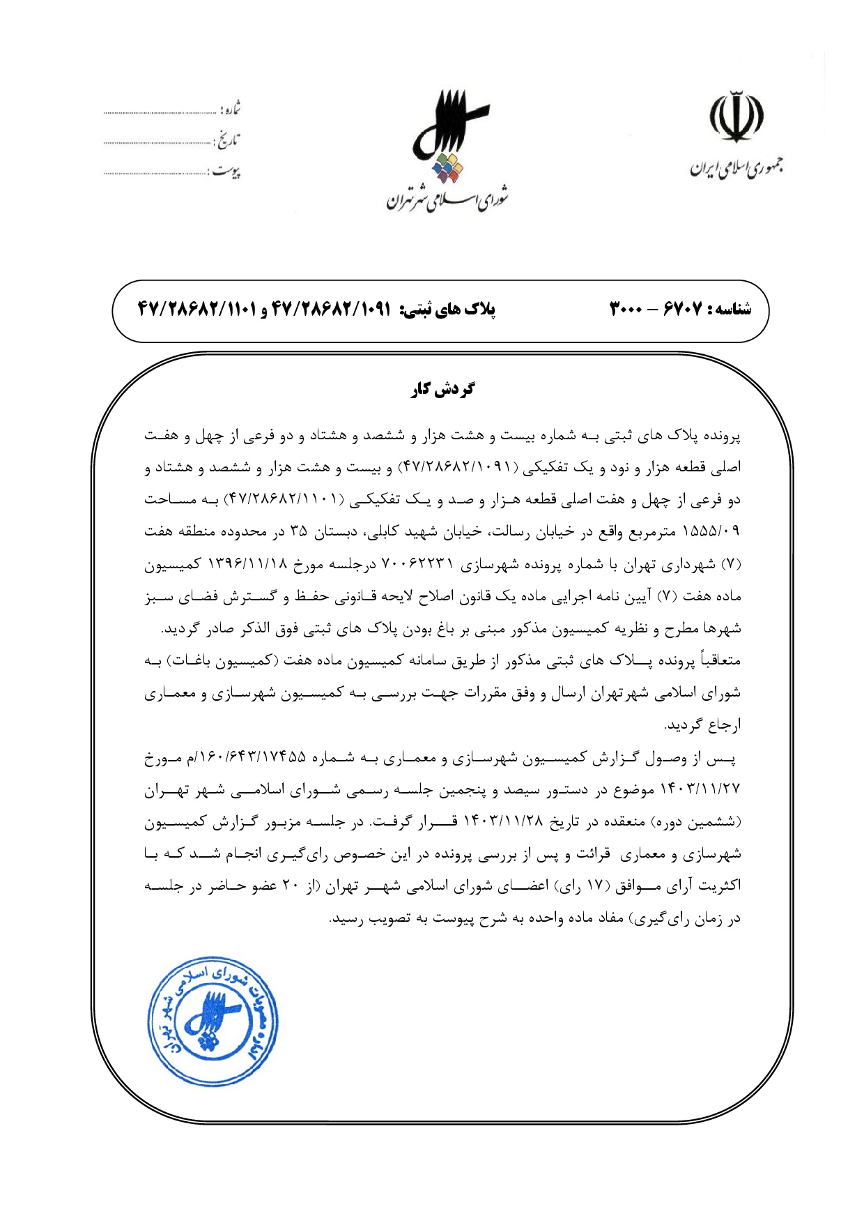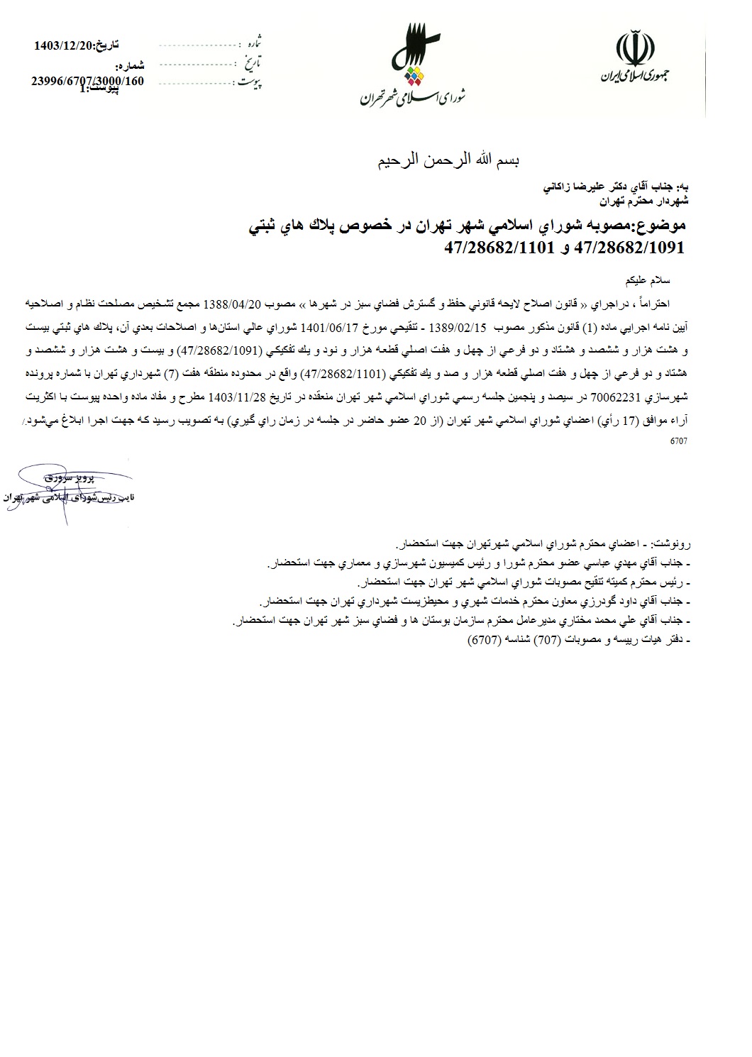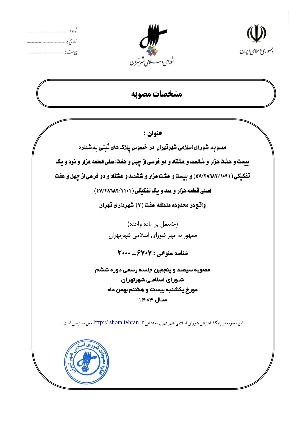 مصوبه شوراي اسلامي شهر تهران درخصوص پلاكهاي ثبتي به شماره بيست و هشت هزار و ششصد و هشتاد و دو فرعي از چهل و هفت اصلي قطعه هزار و نود و يك تفكيكي (47/28682/1091) و بيست و هشت هزار و ششصد و هشتاد و دو فرعي از چهل و هفت اصلي قطعه هزار و صد و يك تفكيكي (47/28682/1101) واقع در محدوده منطقه هفت (7) شهرداري تهران