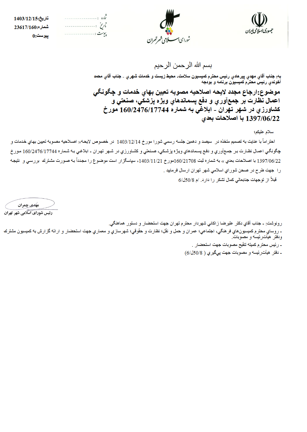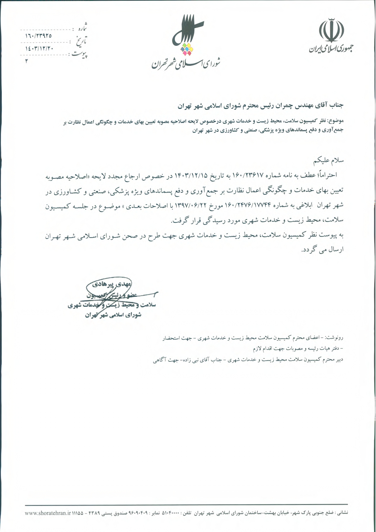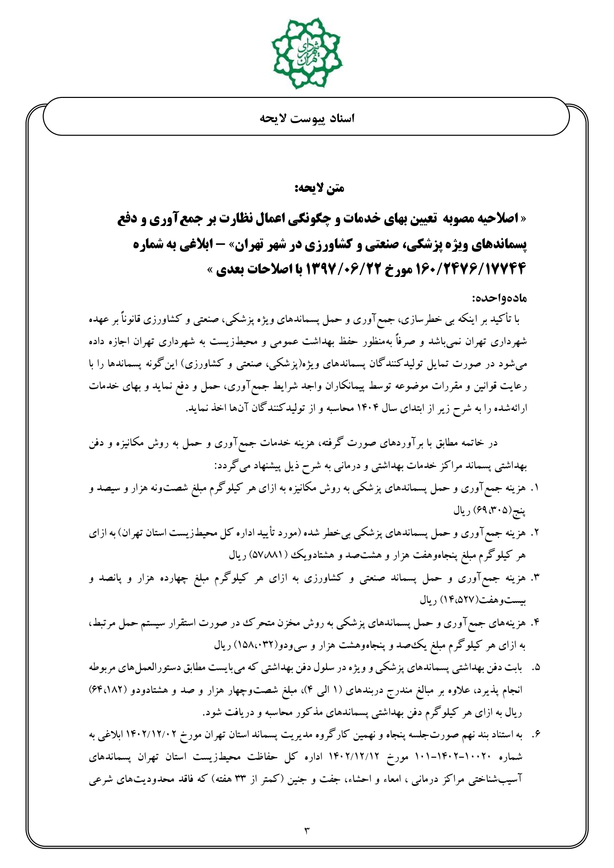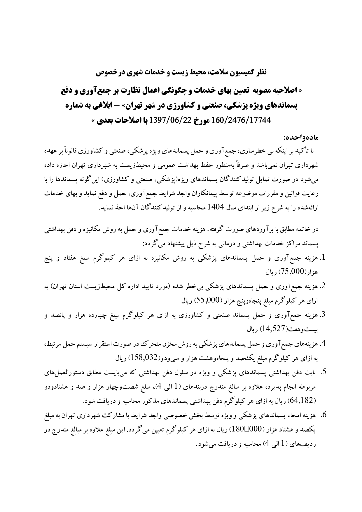اصلاحيه مصوبه تعيين بهاي خدمات و چگونگي اعمال نظارت بر جمعآوري و دفع پسماندهاي ويژه پزشكي، صنعتي و كشاورزي در شهر تهران» - ابلاغي به شماره 160/2476/17744 مورخ 1397/06/22 با اصلاحات بعدي
