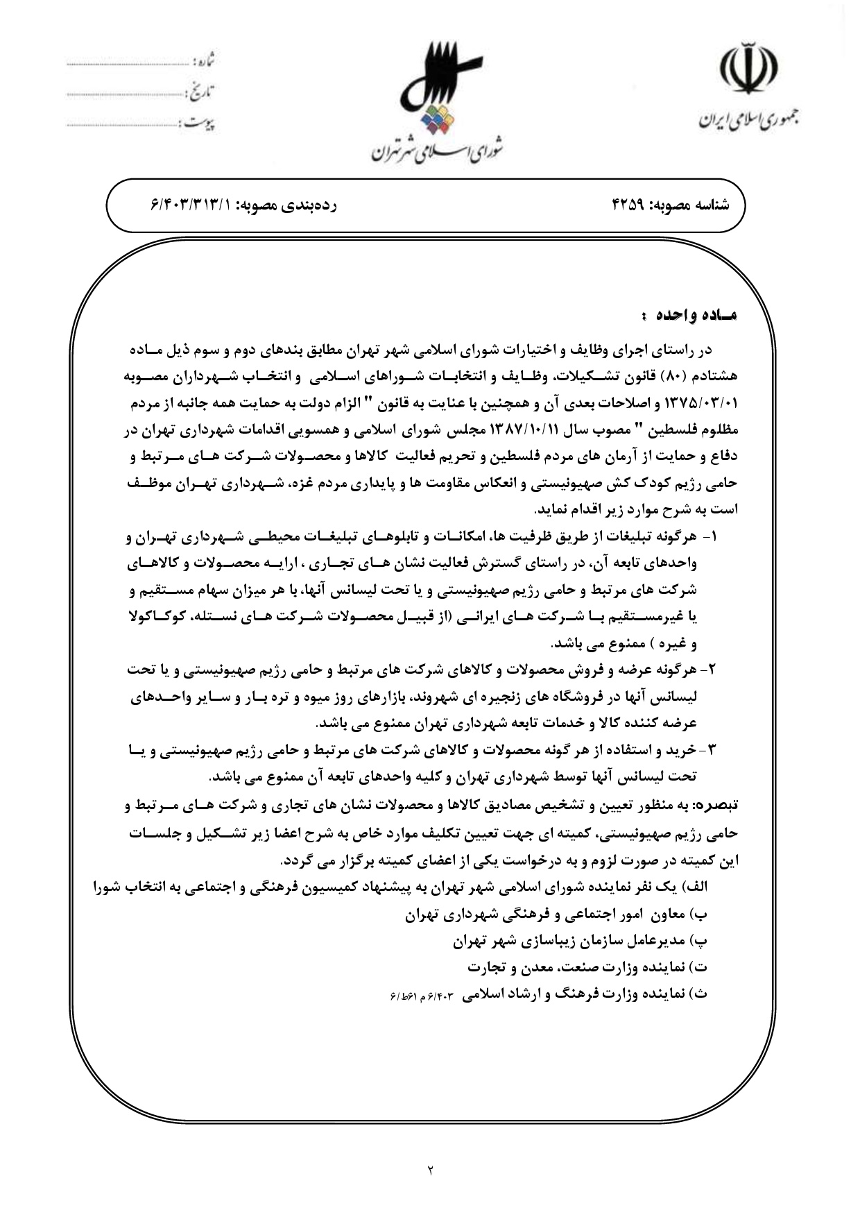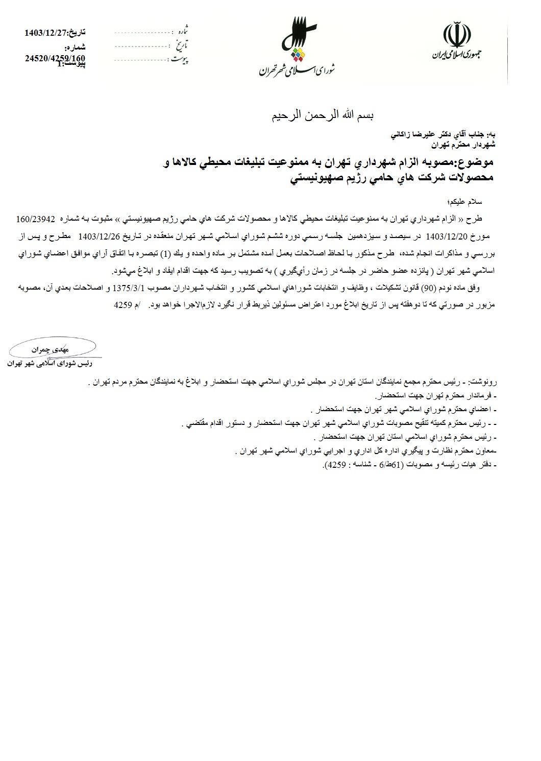 الزام شهرداري تهران به ممنوعيت تبليغات محيطي كالاها و محصولات شركتهاي حامي رژيم صهيونيستي