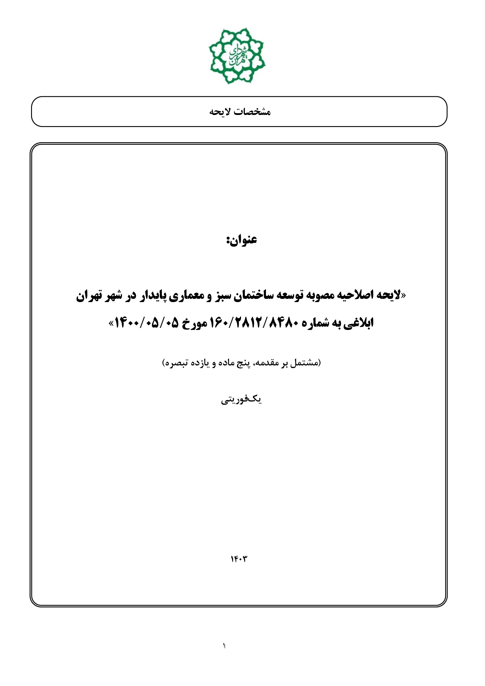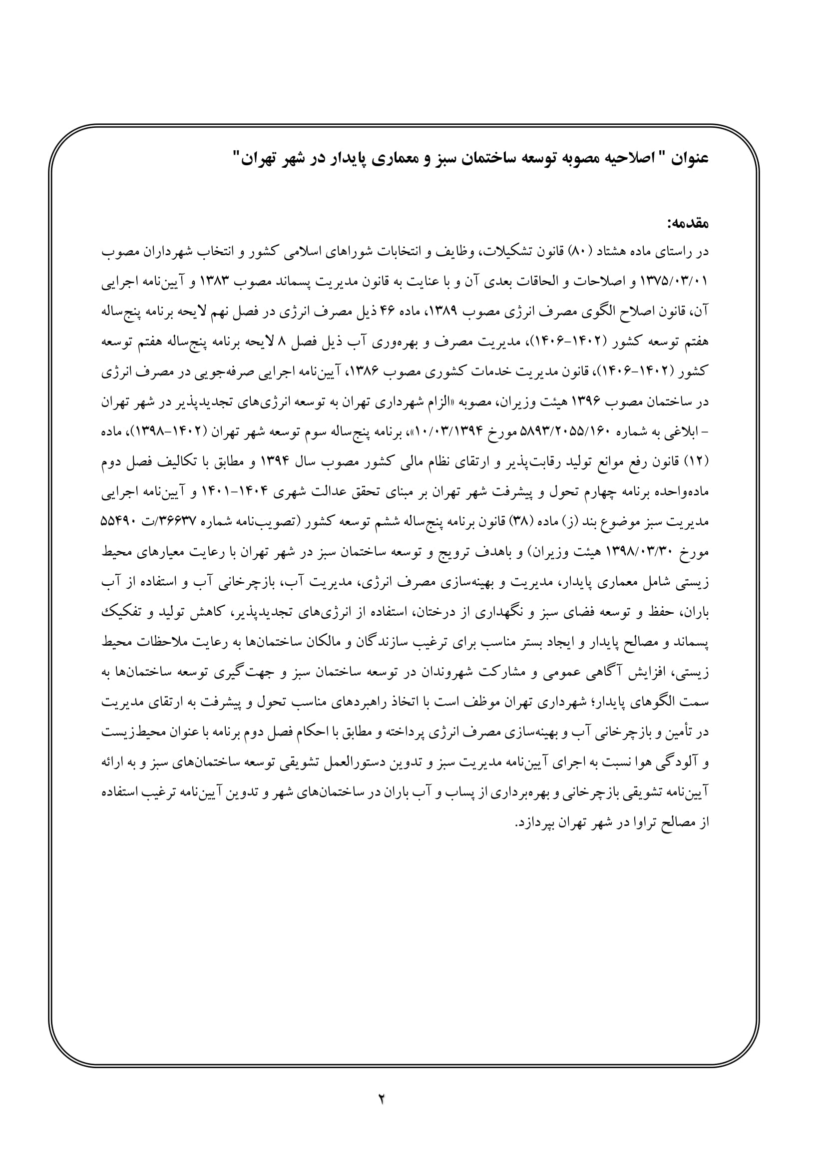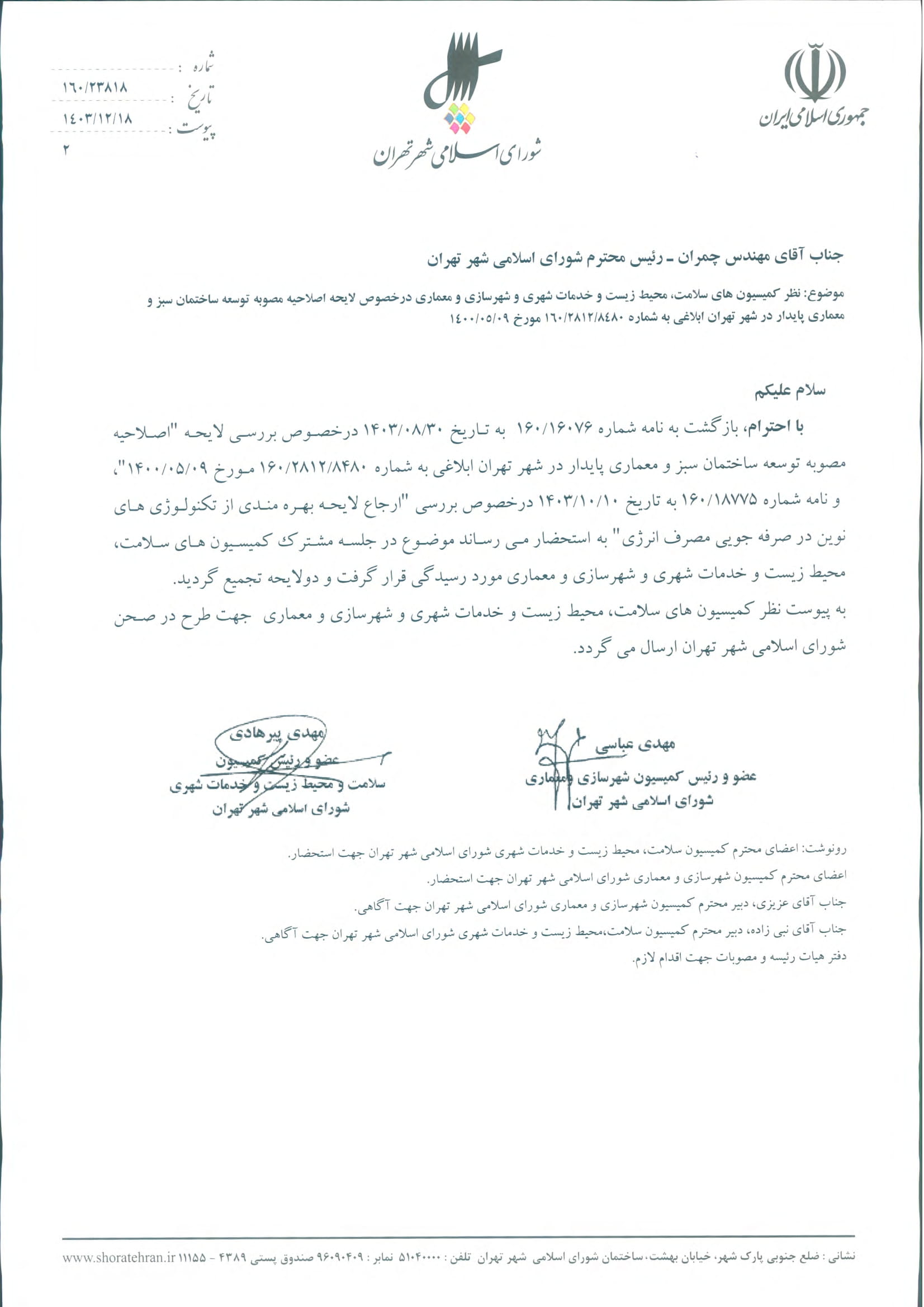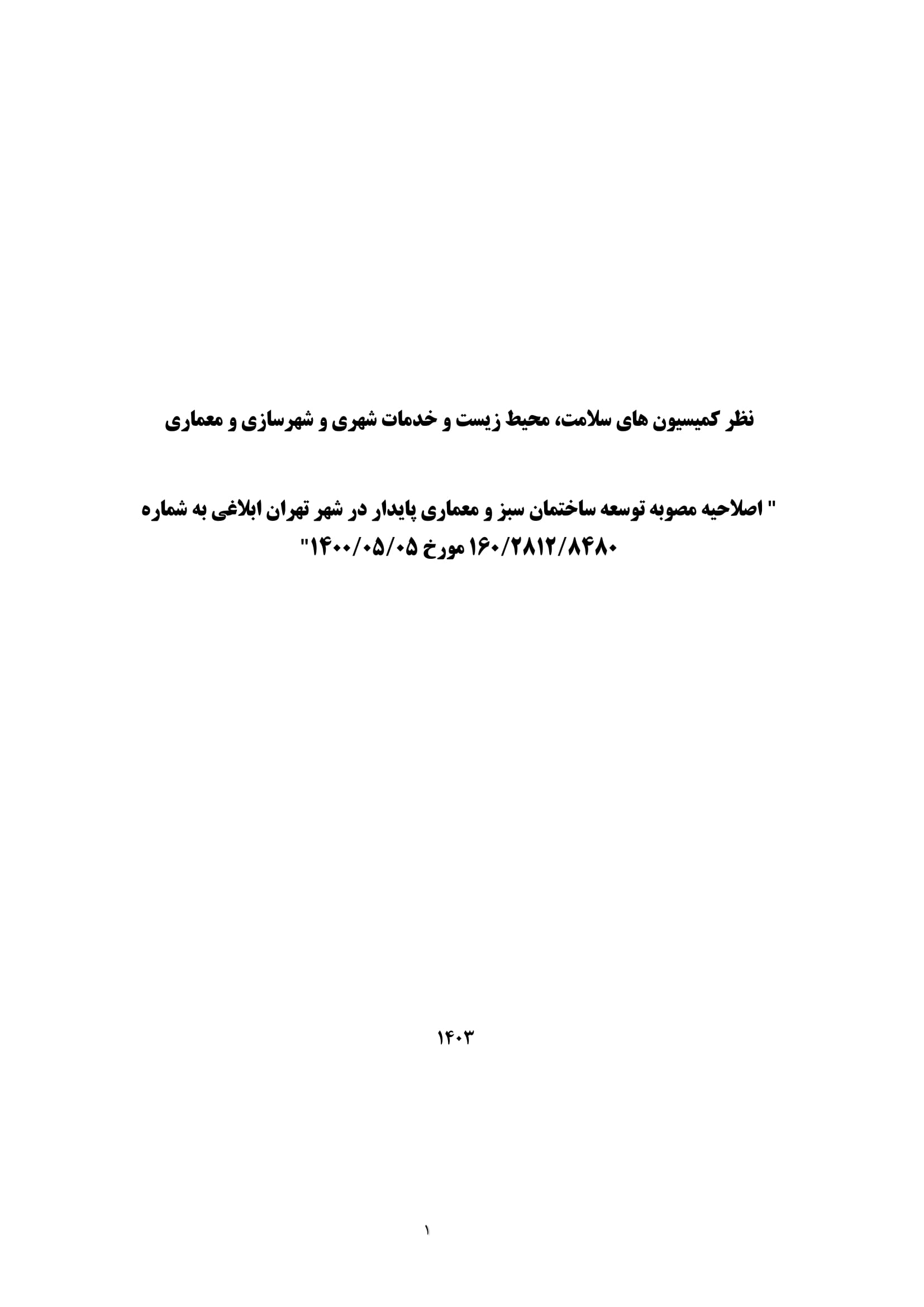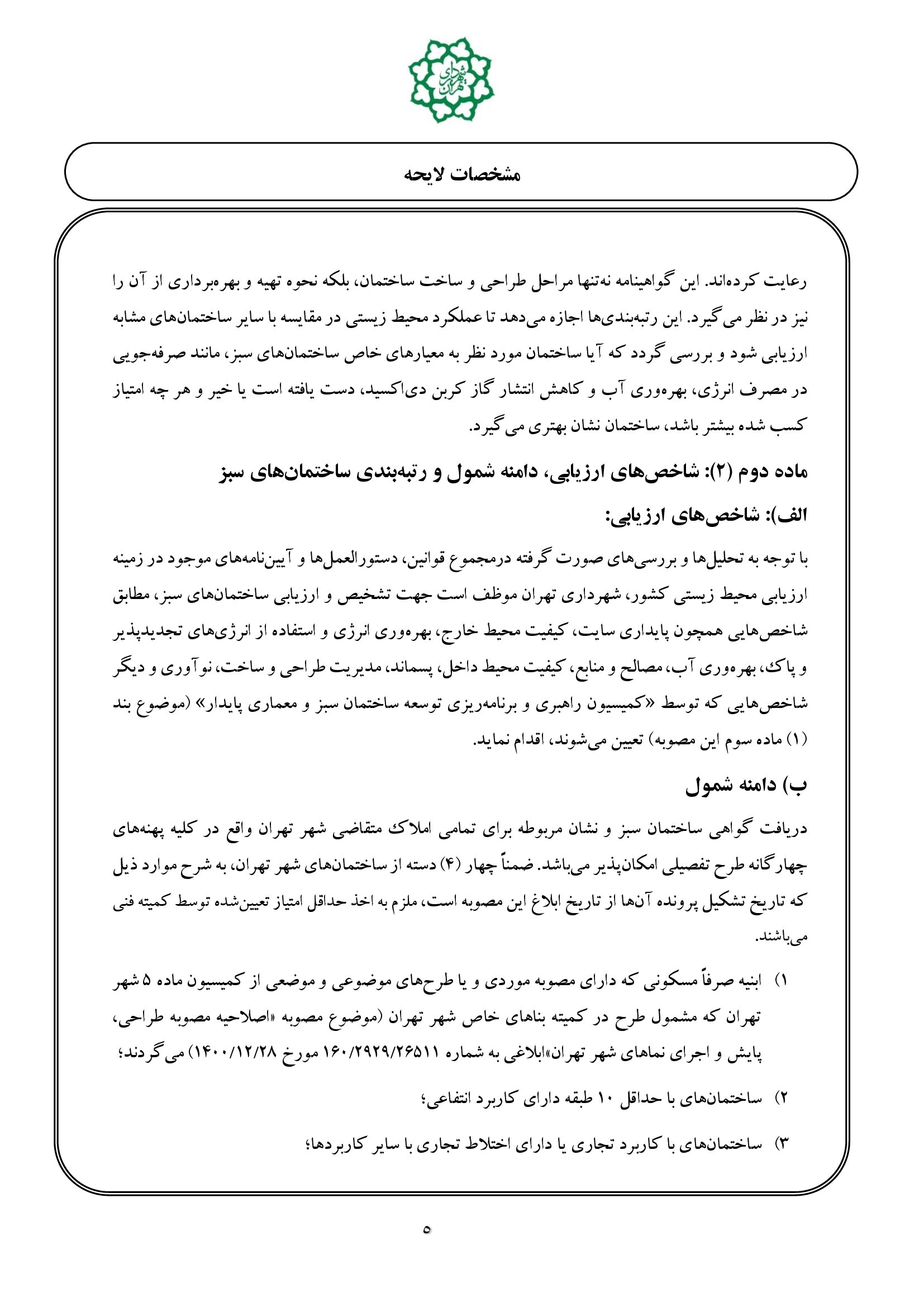 اصلاحيه مصوبه «توسعه ساختمان سبز و معماري پايدار در شهر تهران» - ابلاغي به شماره 160/2812/8480 مورخ 1400/05/05