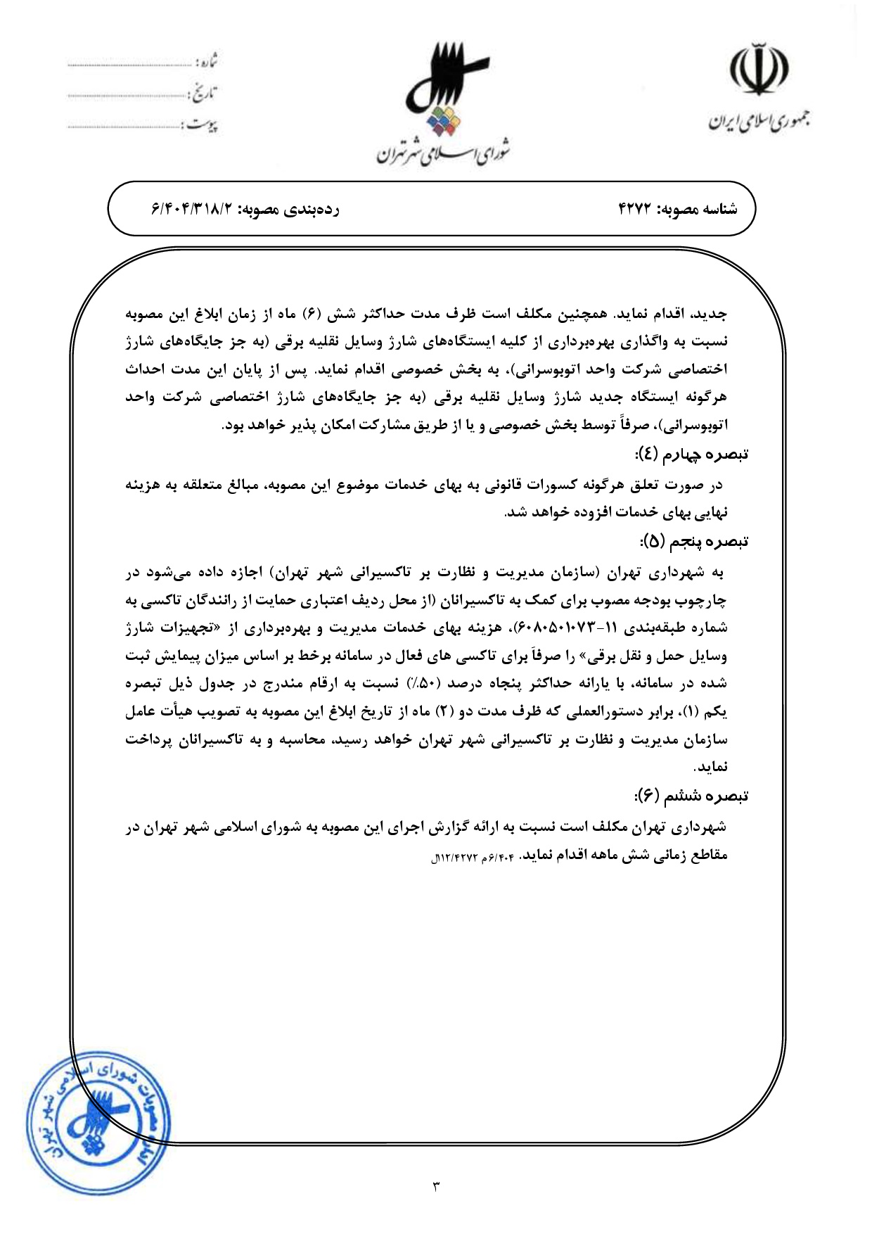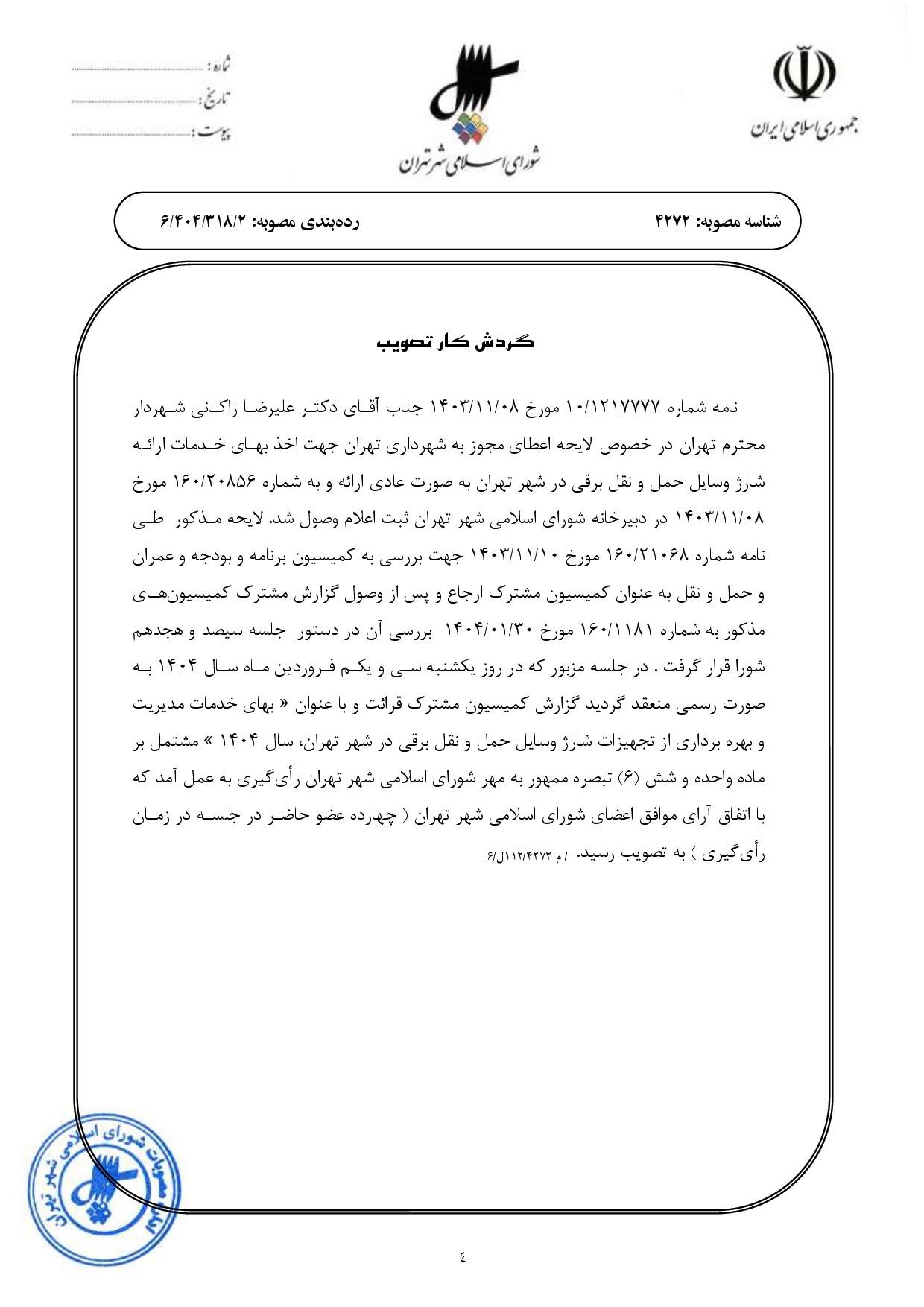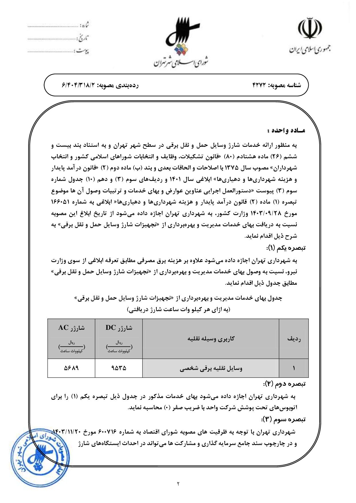 بهاي خدمات مديريت و بهرهبرداري از تجهيزات شارژ وسايل حمل و نقل برقي در شهر تهران، سال 1404