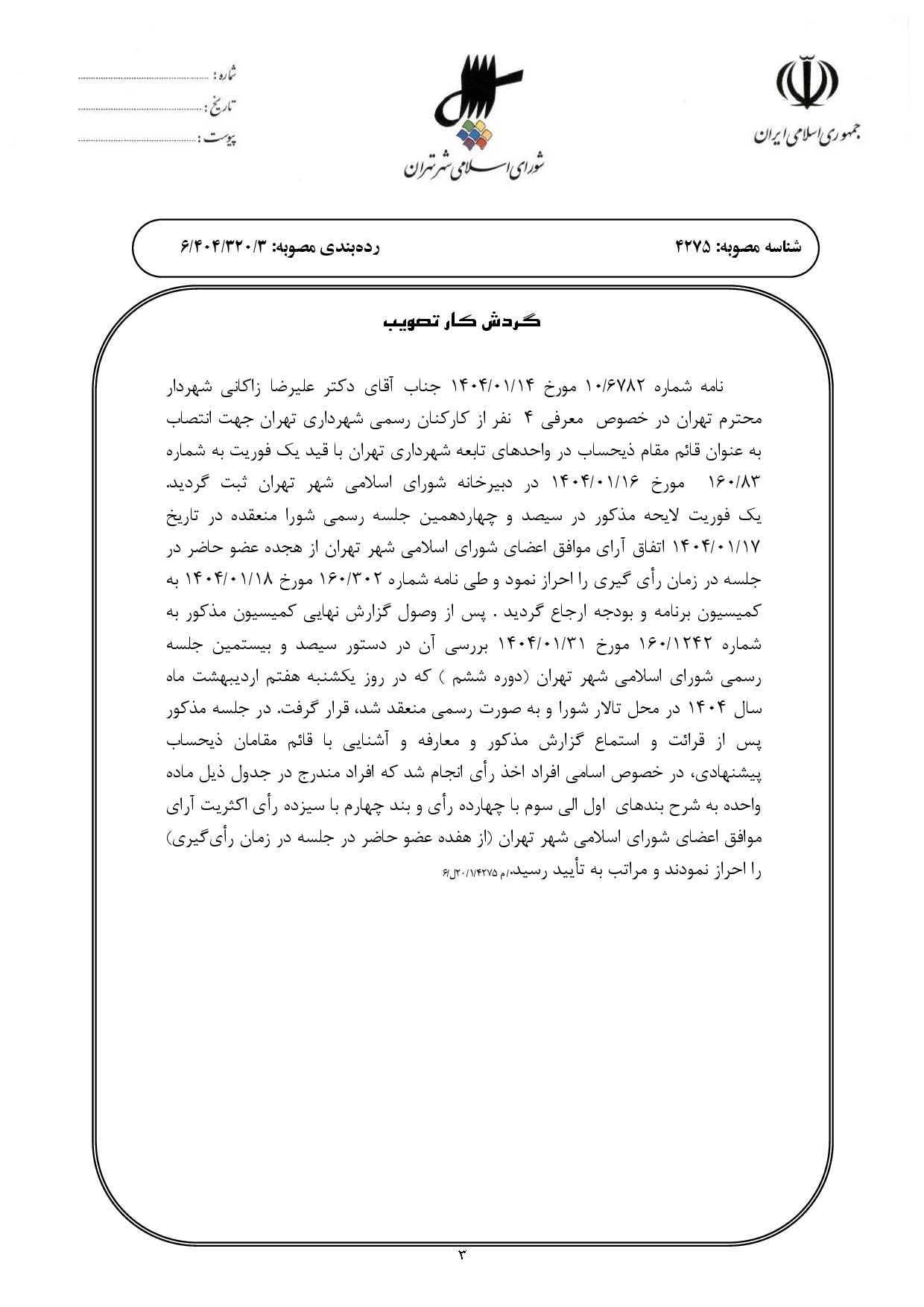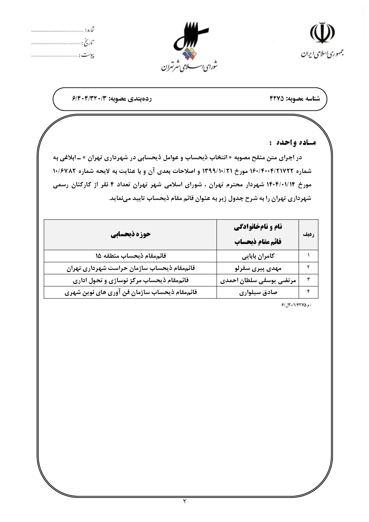 تأييد چهار (4) نفر از كاركنان رسمي شهرداري تهران به عنوان قائممقام ذيحساب در واحدهاي تابعه شهرداري تهران