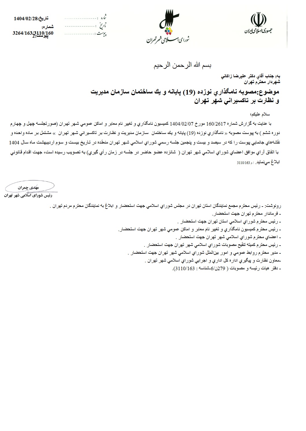 نامگذاري نوزده (19) پايانه و يك ساختمان سازمان مديريت و نظارت بر تاكسيراني شهر تهران