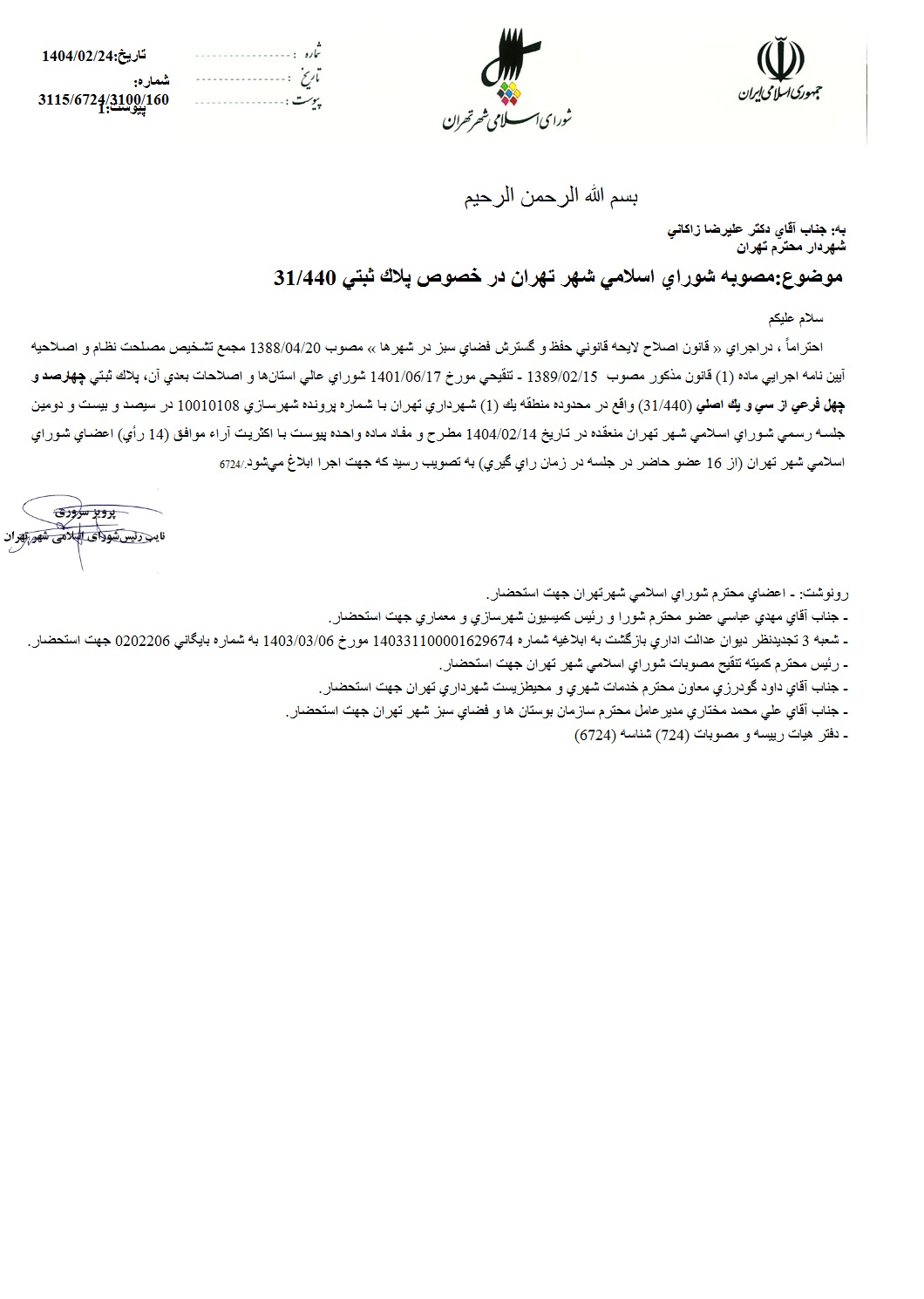 مصوبه شوراي اسلامي شهر تهران درخصوص پلاك ثبتي به شماره چهارصد و چهل فرعي از سي و يك اصلي (31/440) واقع در محدوده منطقه يك (1) شهرداري تهران
