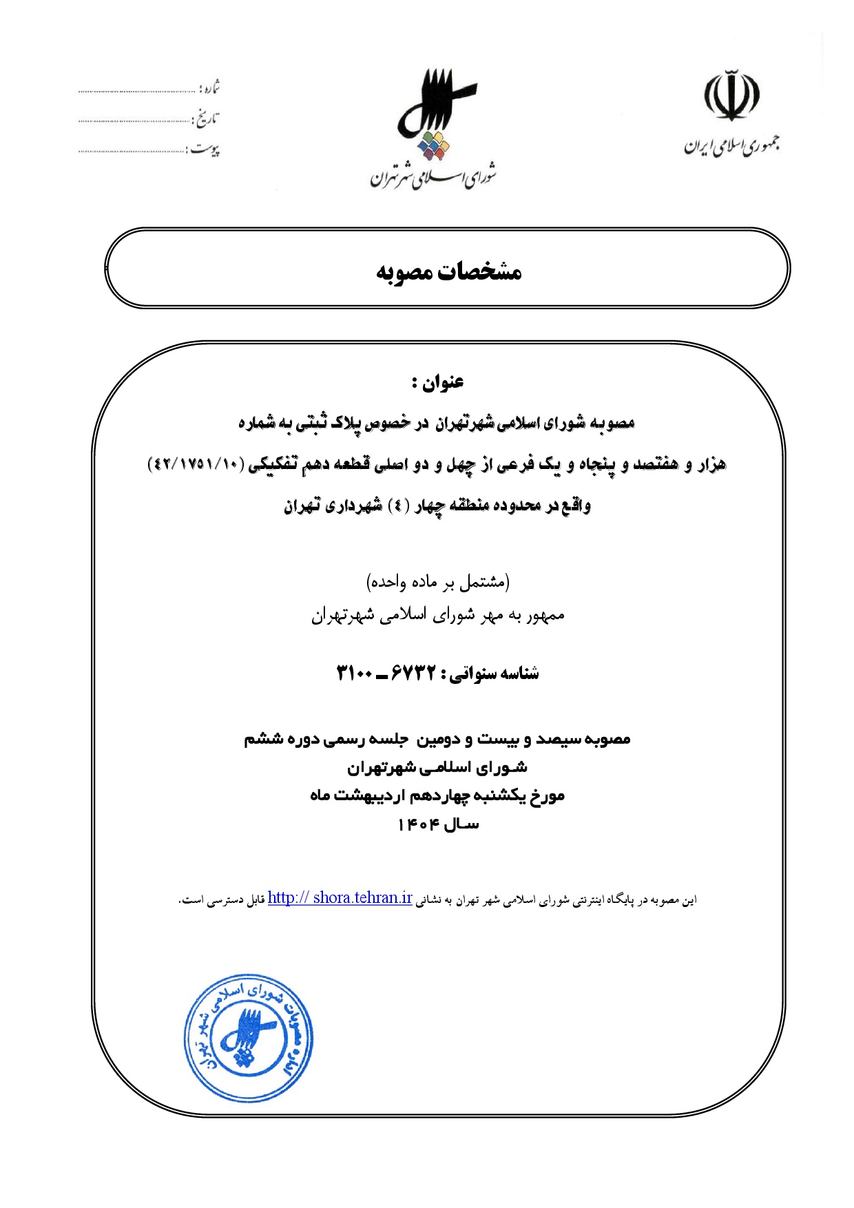مصوبه شوراي اسلامي شهر تهران درخصوص پلاك ثبتي به شماره هزار و هفتصد و پنجاه و يك فرعي از چهل و دو اصلي قطعه دهم تفكيكي (42/1751/10) واقع در محدوده منطقه چهار (4) شهرداري تهران
