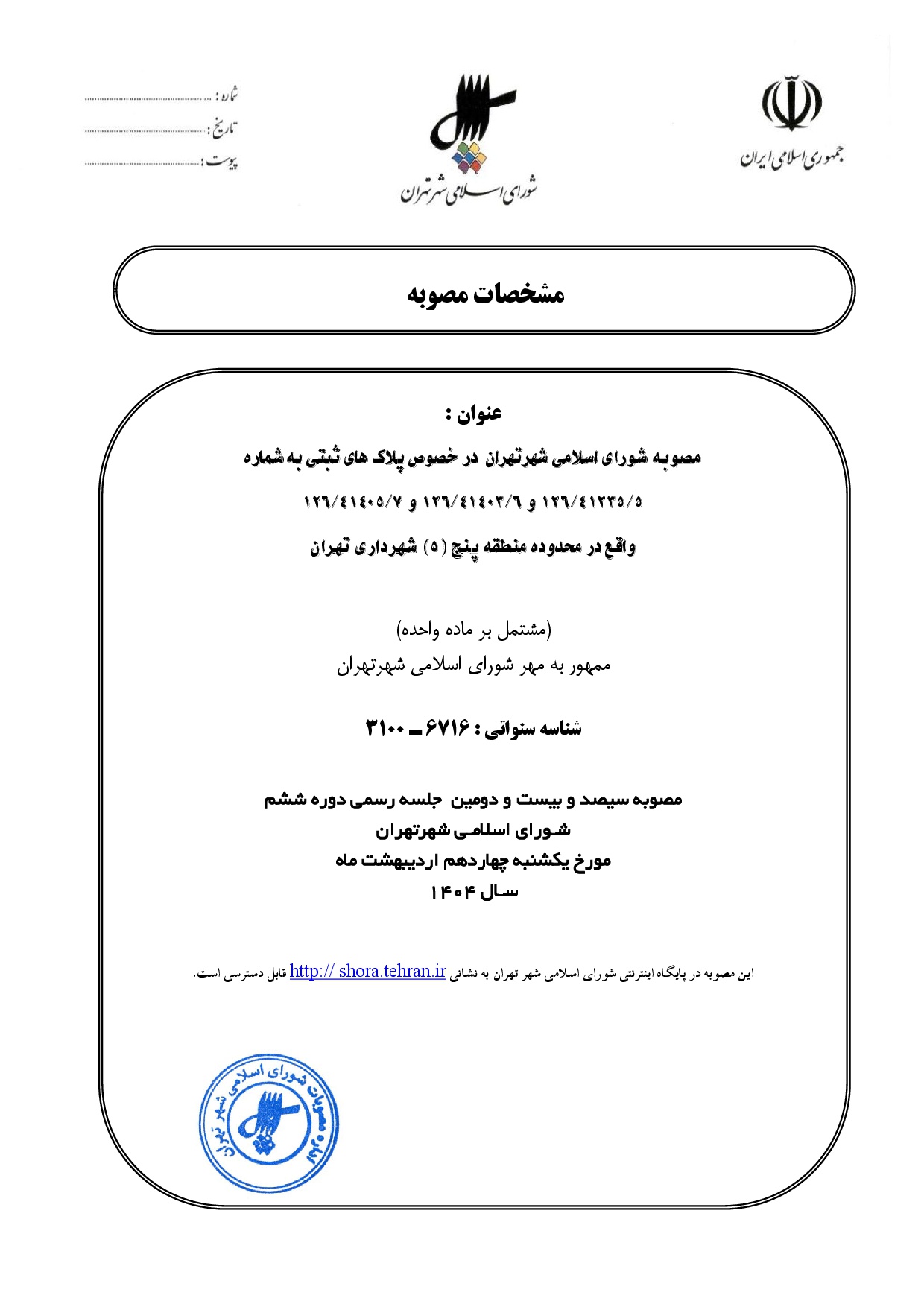 مصوبه شوراي اسلامي شهر تهران درخصوص پلاكهاي ثبتي به شماره 126/41235/5 و 126/41403/6 و 126/41405/7 واقع در محدوده منطقه پنج (5) شهرداري تهران