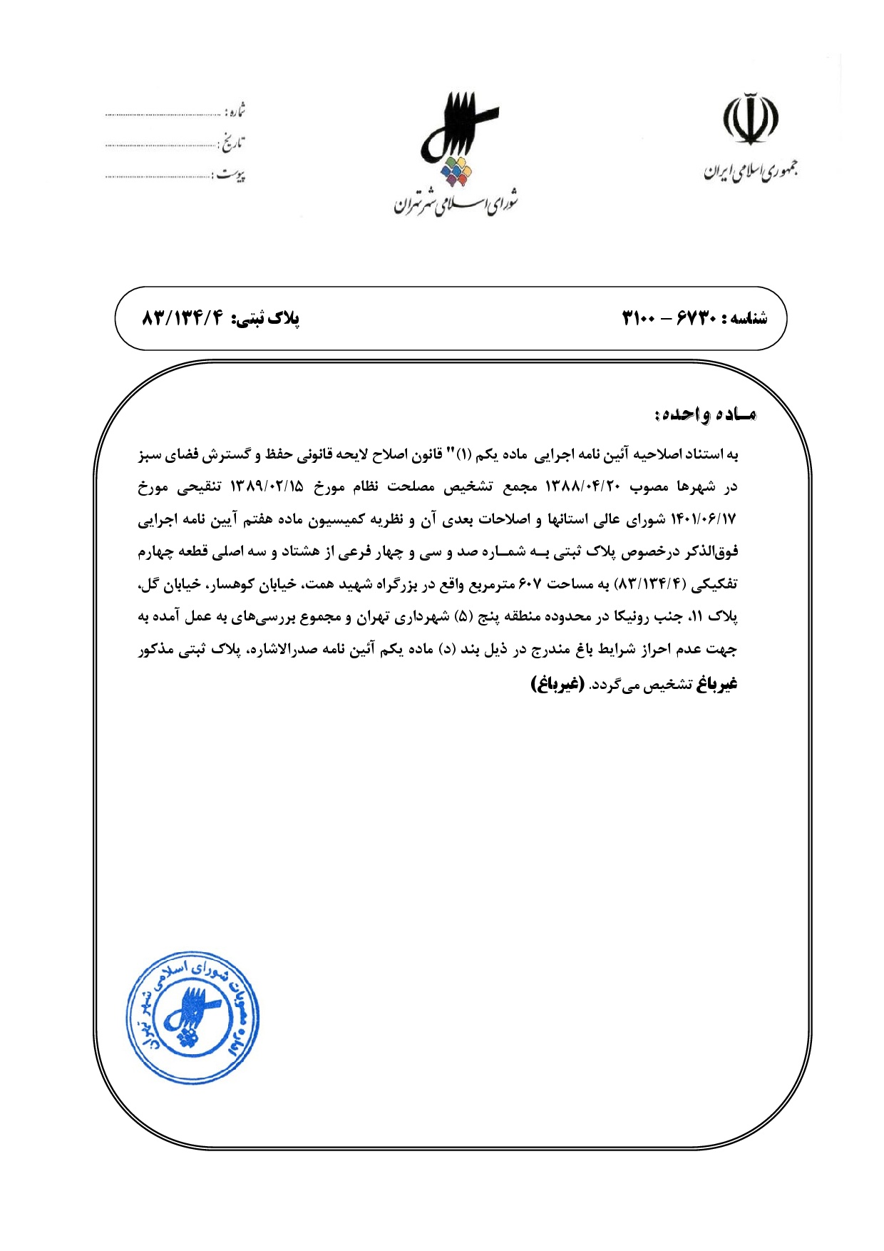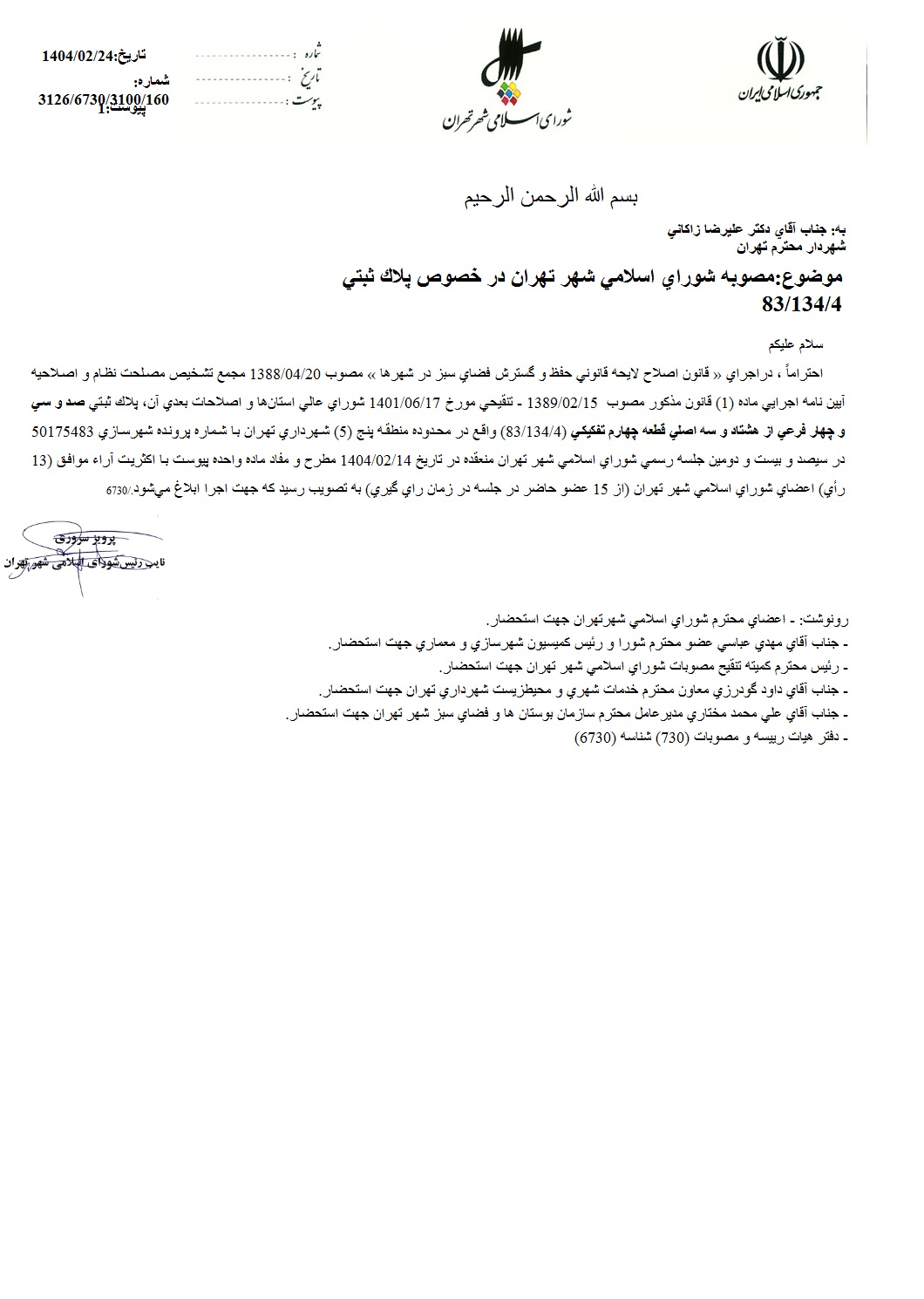 مصوبه شوراي اسلامي شهر تهران درخصوص پلاك ثبتي به شماره صد و سي و چهار فرعي از هشتاد و سه اصلي قطعه چهارم تفكيكي (83/134/4) واقع در محدوده منطقه پنج (5) شهرداري تهران