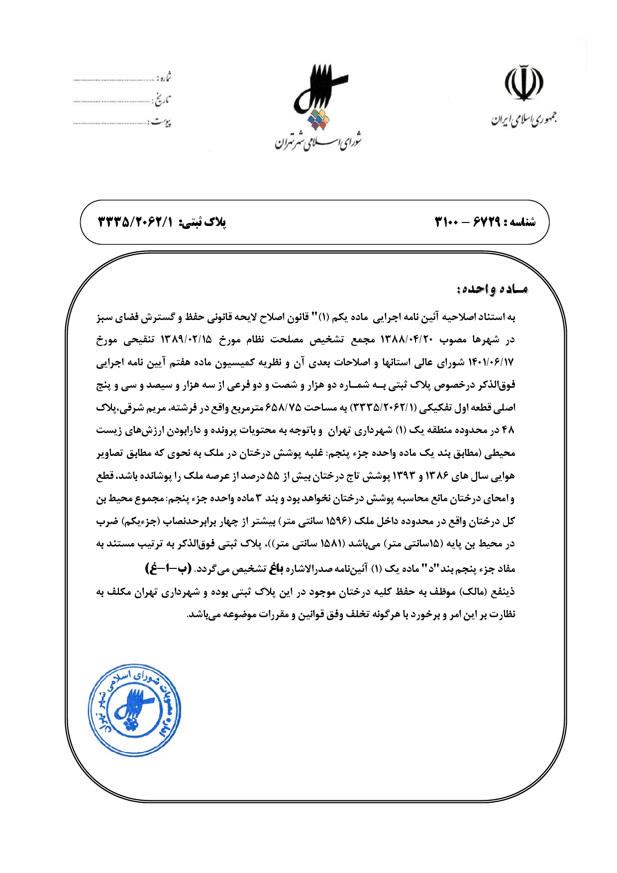 مصوبه شوراي اسلامي شهر تهران درخصوص پلاك ثبتي به شماره دو هزار و شصت و دو فرعي از سه هزار و سيصد و سي و پنج اصلي قطعه اول تفكيكي (3335/2062/1) واقع در محدوده منطقه يك (1) شهرداري تهران