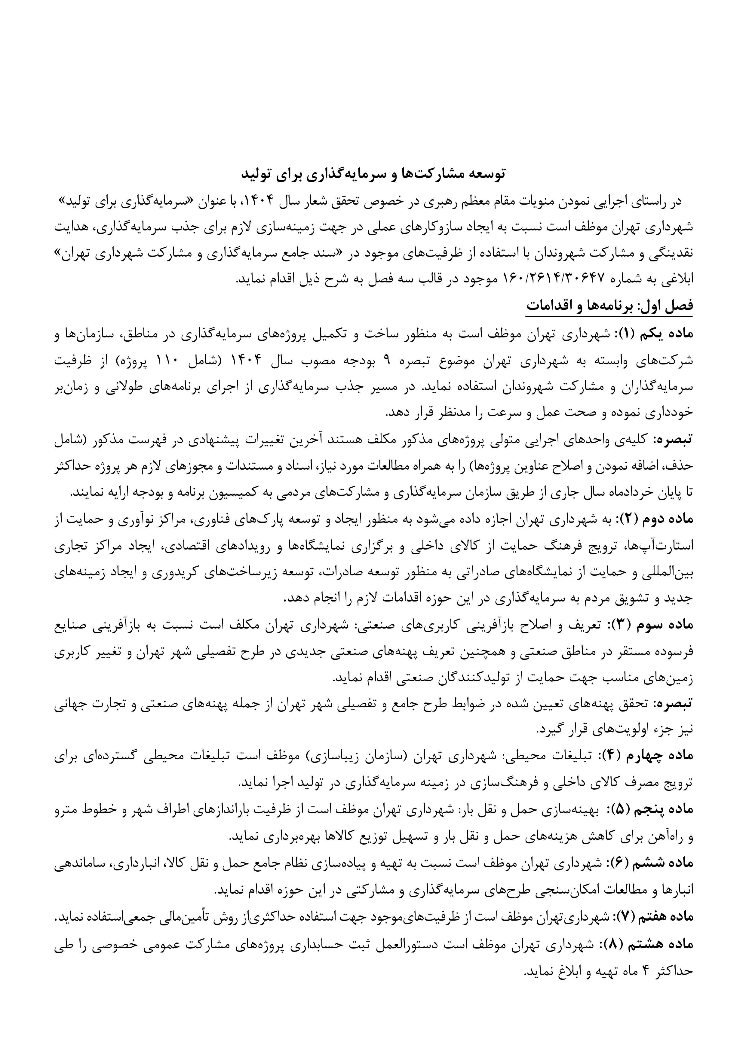 توسعه مشاركتها و سرمايهگذاري براي توليد