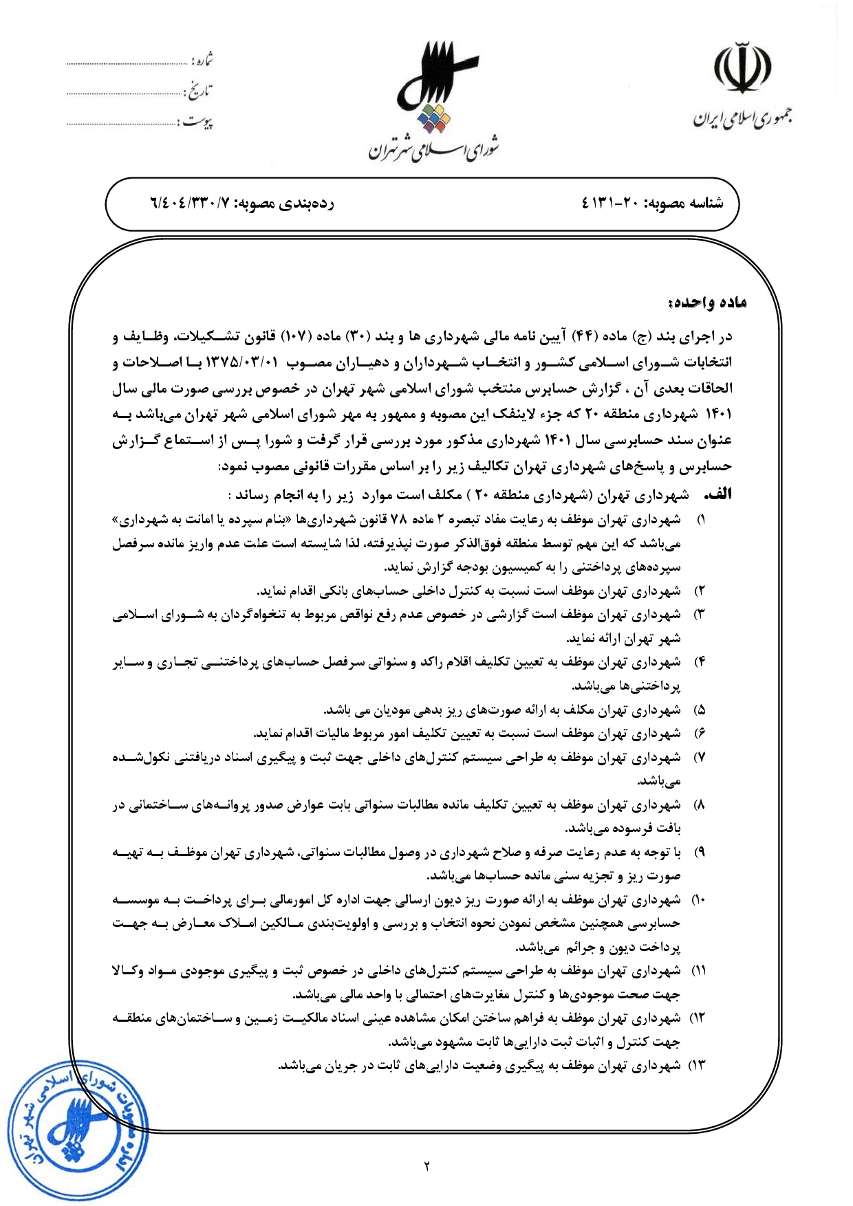 گزارش حسابرسي سال مالي 1401 شهرداري منطقه 20