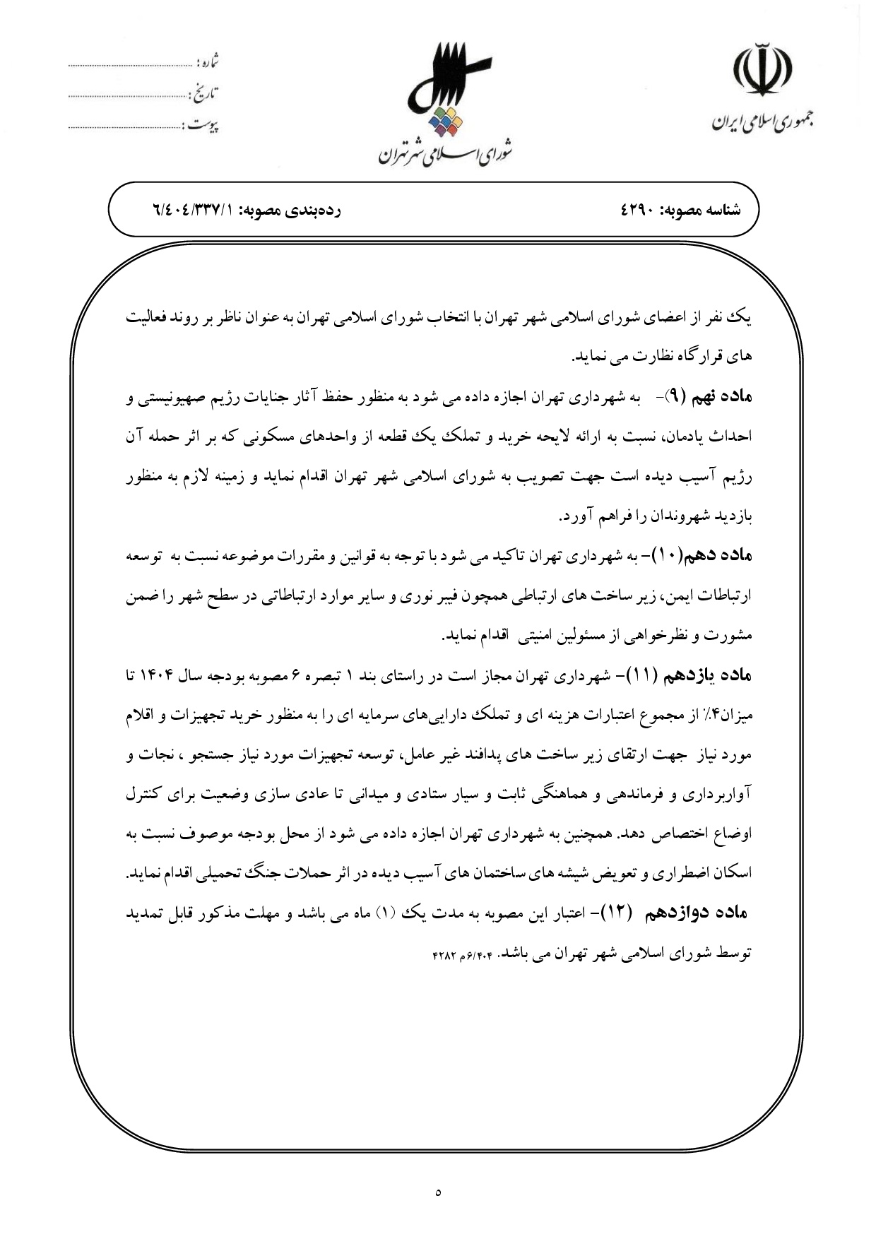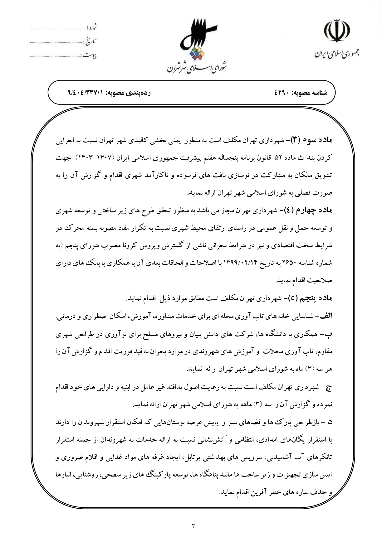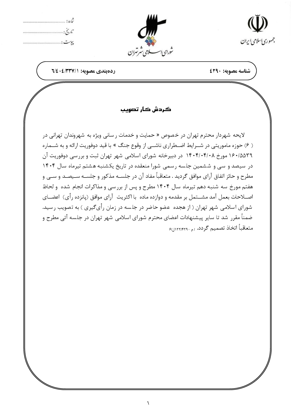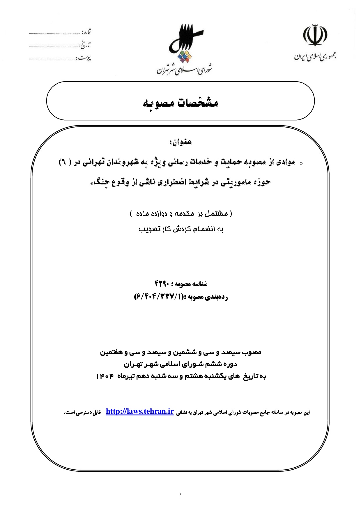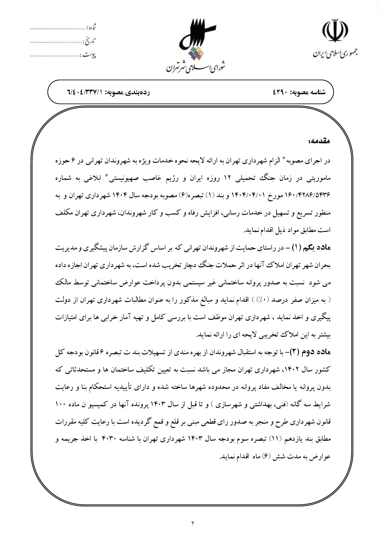 موادي از مصوبه «حمايت و خدماترساني ويژه به شهروندان تهراني در (6) حوزه مأموريتي در شرايط اضطراري ناشي از وقوع جنگ»