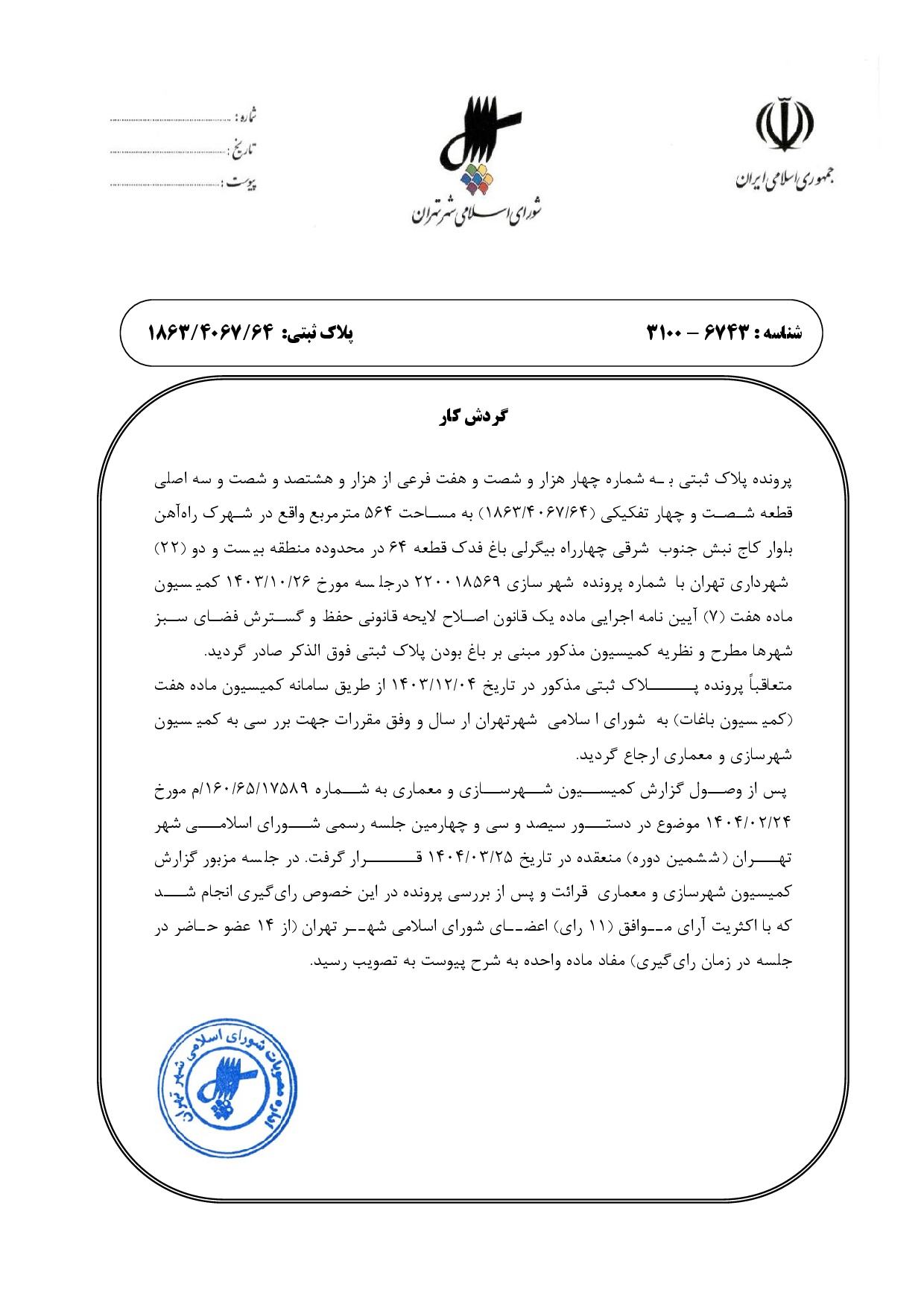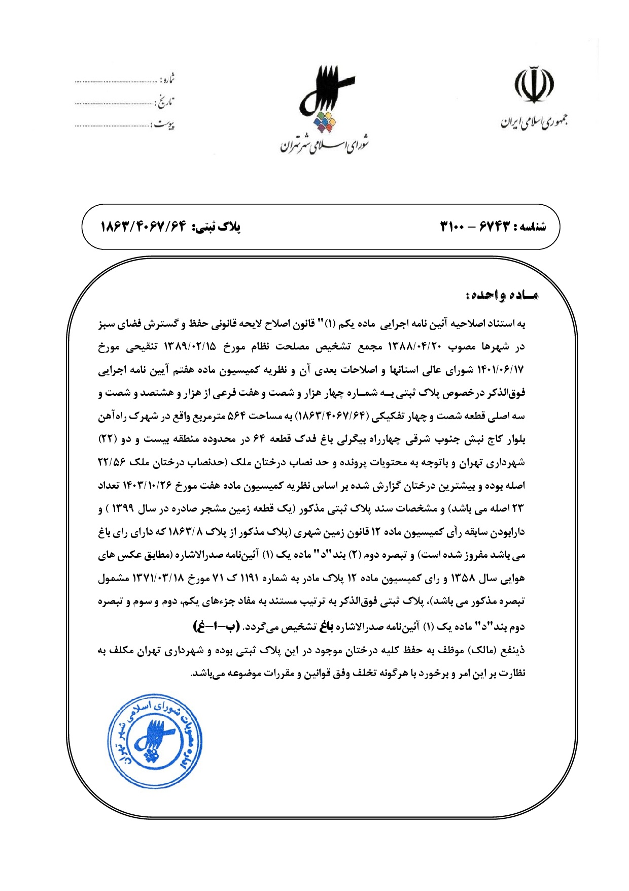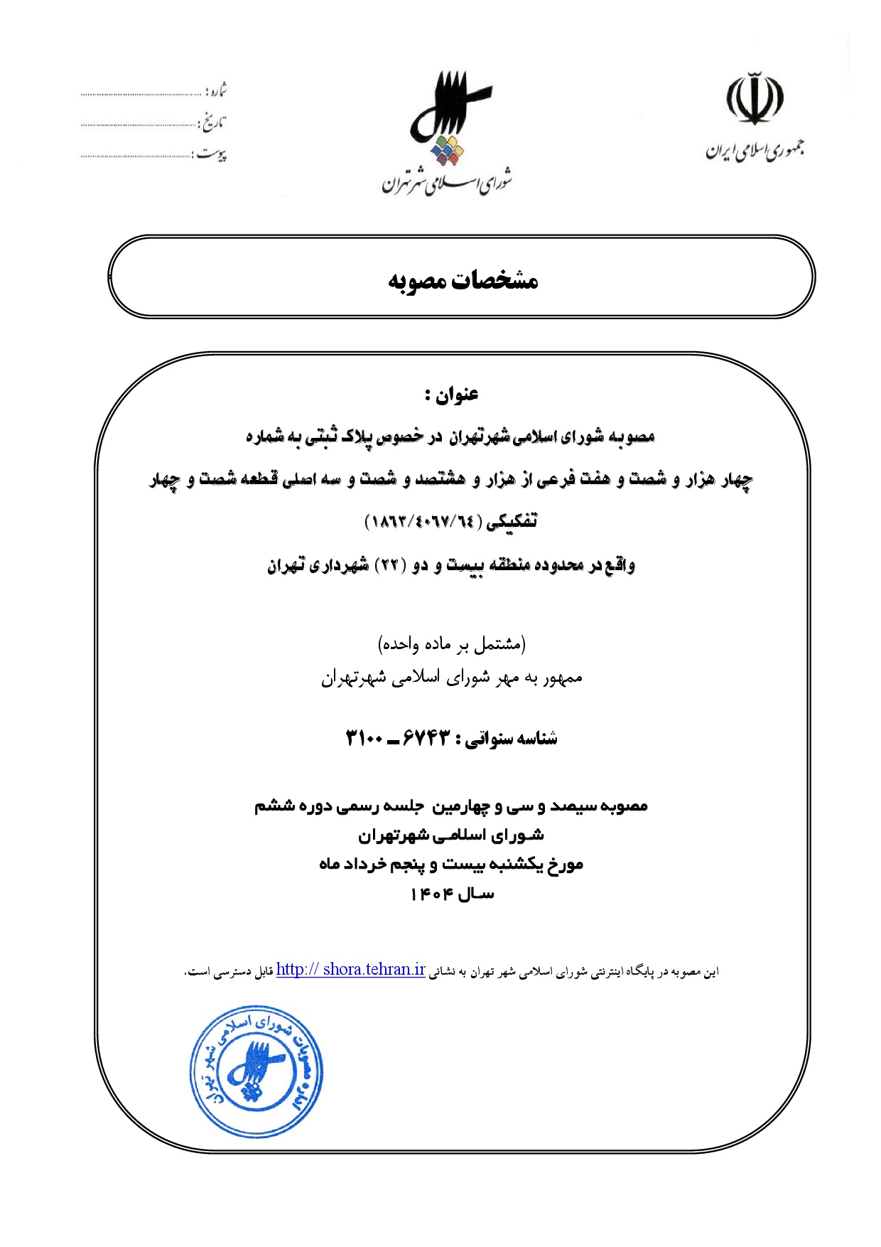 مصوبه شوراي اسلامي شهر تهران در خصوص پلاك ثبتي به شماره چهار هزار و شصت و هفت فرعي از هزار و هشتصد و شصت و سه اصلي قطعه شصت و چهار تفكيكي (1863/4067/64) واقع در محدوده منطقه بيست و دو (22) شهرداري تهران