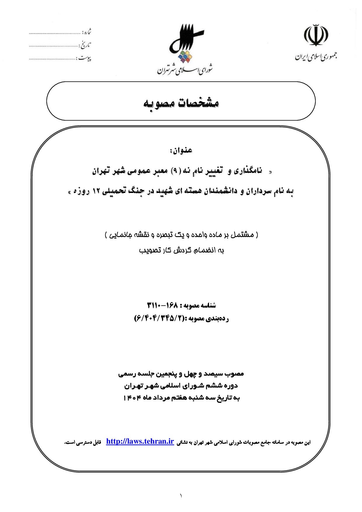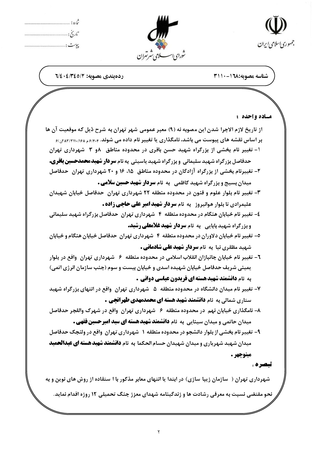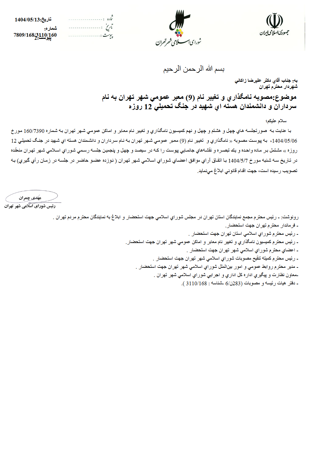 نامگذاري و تغيير نام نه (9) معبر عمومي شهر تهران به نام سرداران و دانشمندان هستهاي شهيد در جنگ تحميلي 12روزه