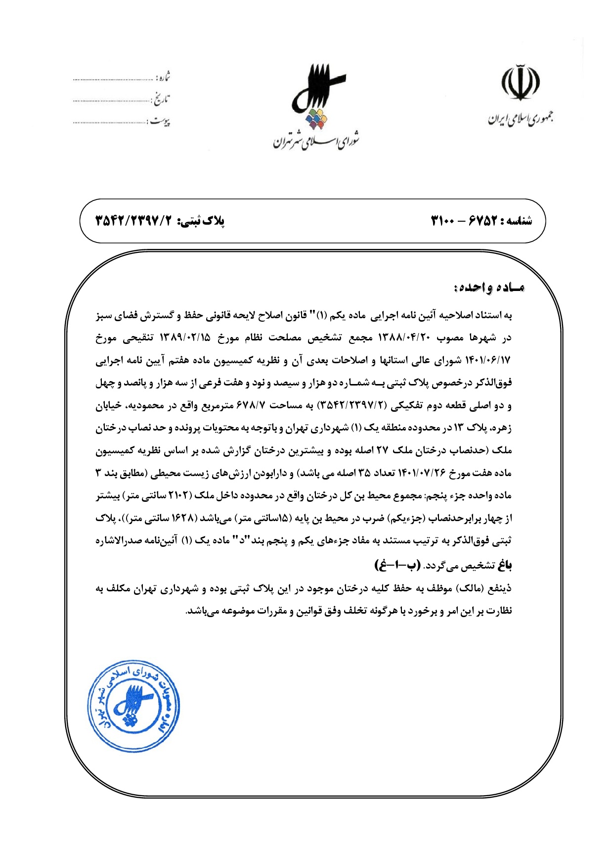 مصوبه شوراي اسلامي شهر تهران درخصوص پلاك ثبتي به شماره دو هزار و سيصد و نود و هفت فرعي از سه هزار و پانصد و چهل و دو اصلي قطعه دوم تفكيكي (3542/2397/2) واقع در محدوده منطقه يك (1) شهرداري تهران