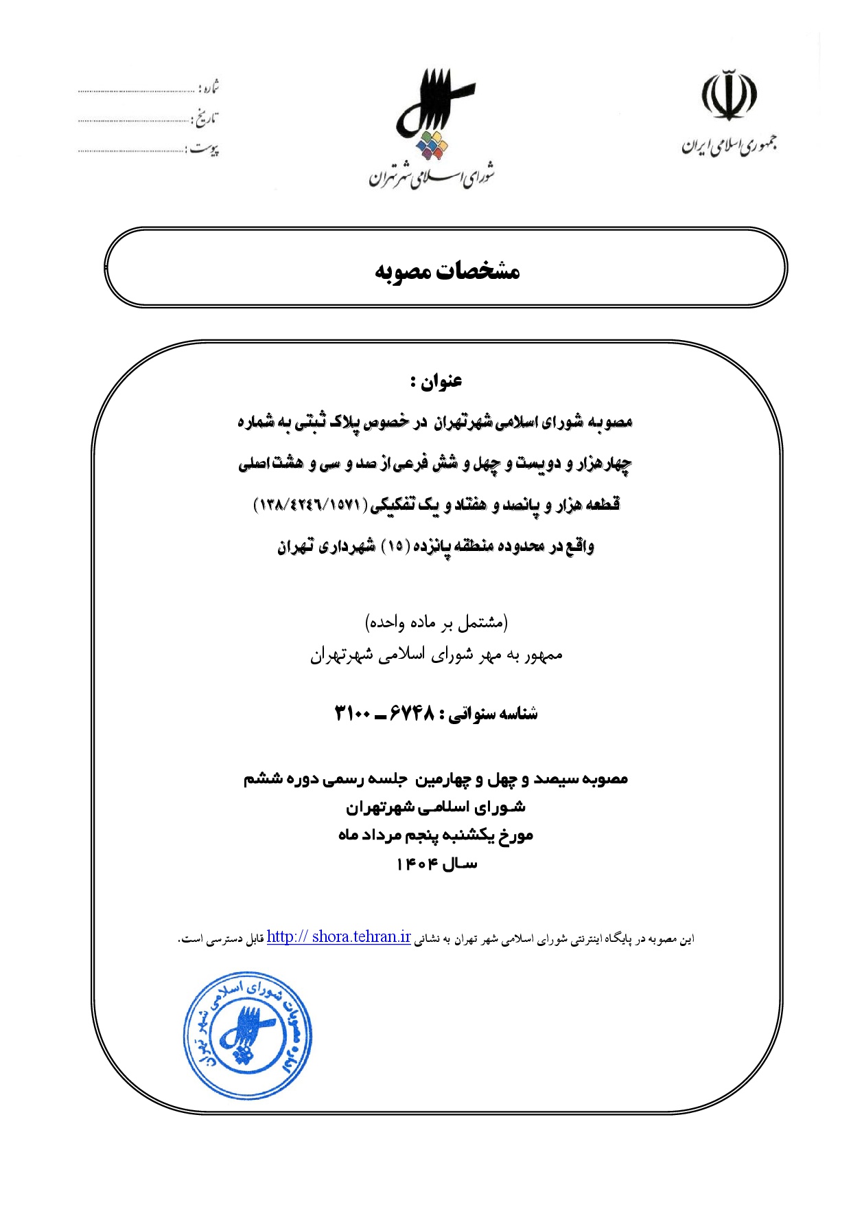 مصوبه شوراي اسلامي شهر تهران درخصوص پلاك ثبتي به شماره چهار هزار و دويست و چهل و شش فرعي از صد و سي و هشت اصلي قطعه هزار و پانصد و هفتاد و يك تفكيكي (138/4246/1571) واقع در محدوده منطقه پانزده (15) شهرداري تهران