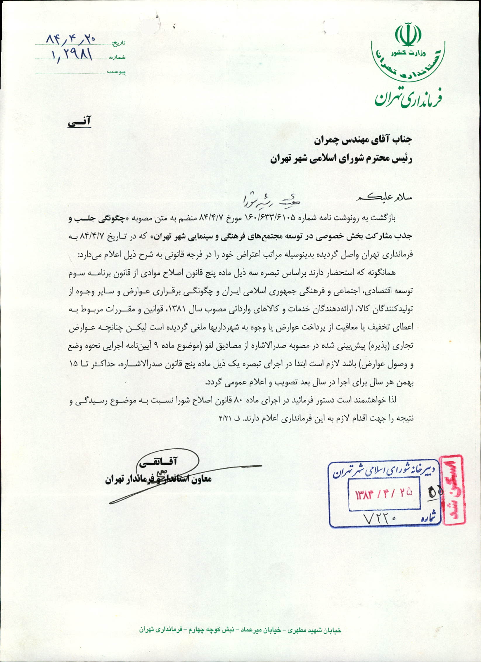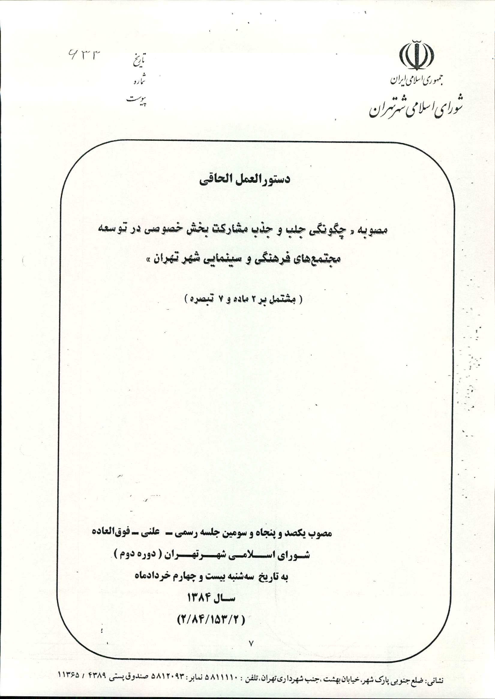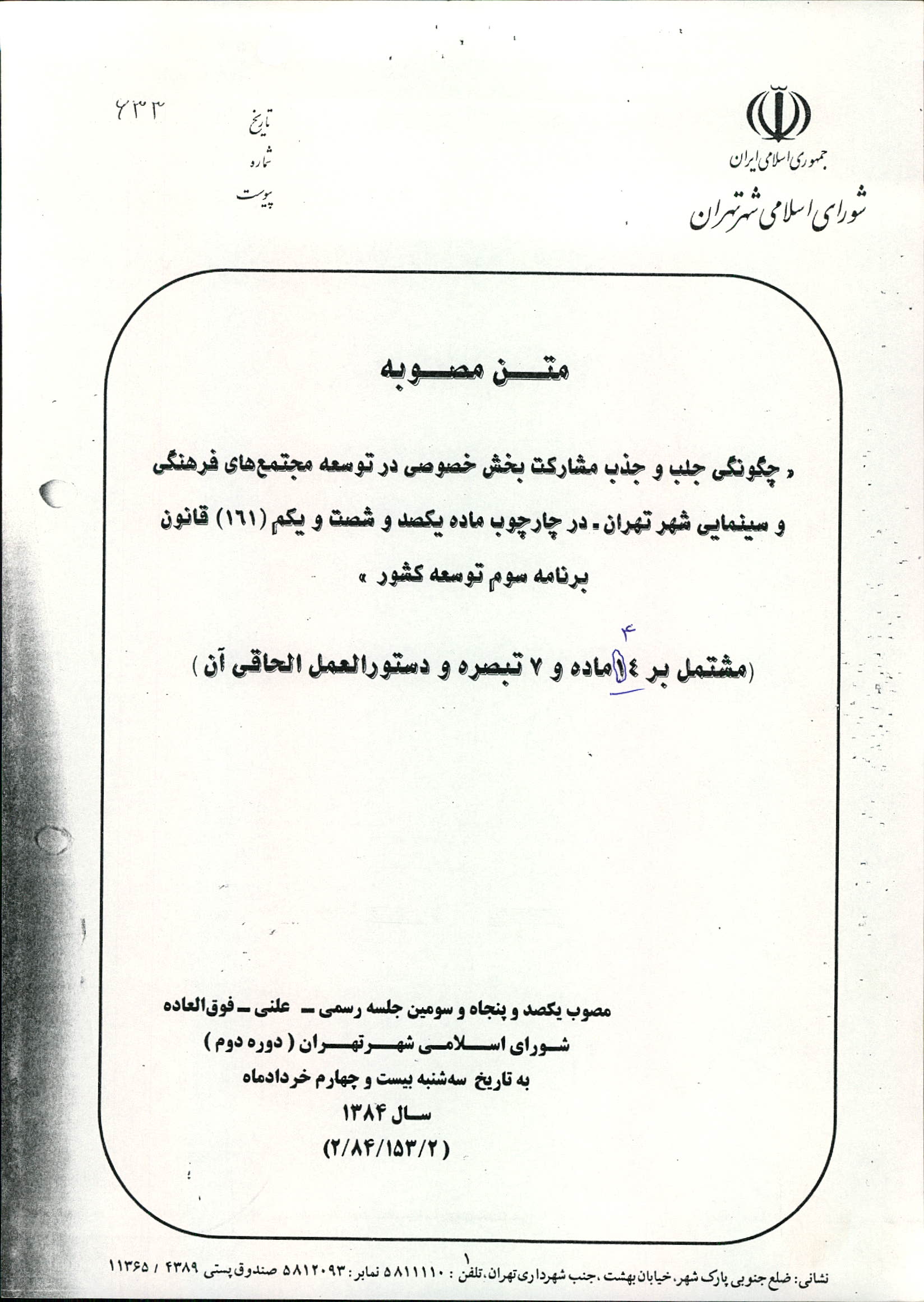 چگونگي جلب و جذب مشاركت بخش خصوصي در توسعه مجتمعهاي فرهنگي و سينمايي شهر تهران ـ در چارچوب ماده يكصد و شصت و يكم (161) قانون برنامه سوم توسعه كشور