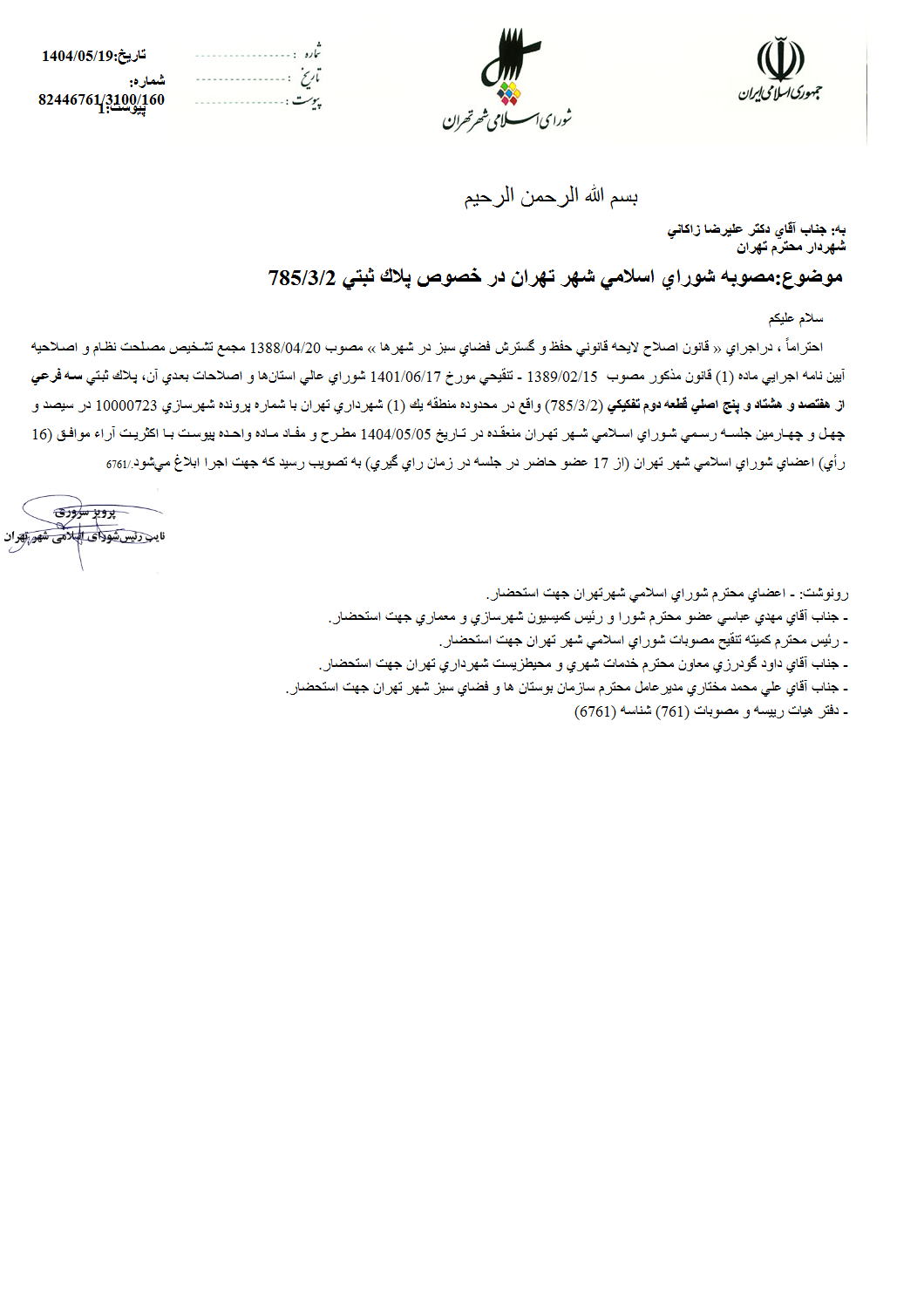 مصوبه شوراي اسلامي شهر تهران در خصوص پلاك ثبتي به شماره سه فرعي از هفتصد و هشتاد و پنج اصلي قطعه دوم تفكيكي (785/3/2) واقع در محدوده منطقه يك (1) شهرداري تهران