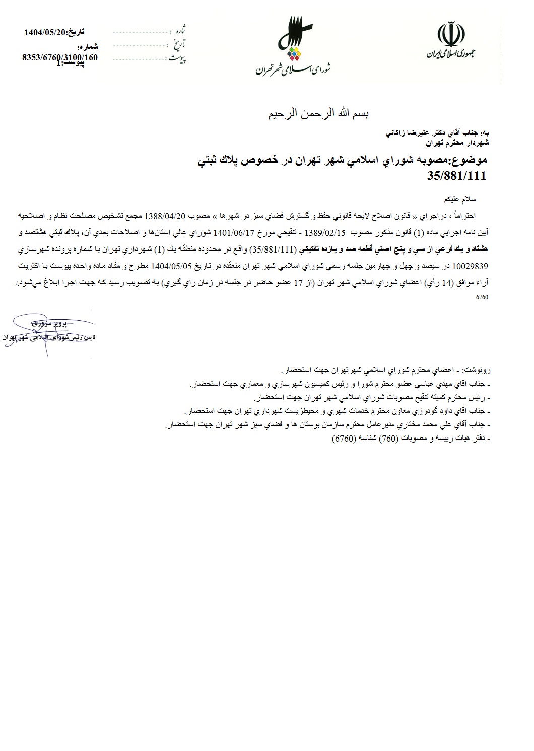 مصوبه شوراي اسلامي شهر تهران درخصوص پلاك ثبتي به شماره هشتصد و هشتاد و يك فرعي از سي و پنج اصلي قطعه صد و يازده تفكيكي (35/881/111) واقع در محدوده منطقه يك (1) شهرداري تهران
