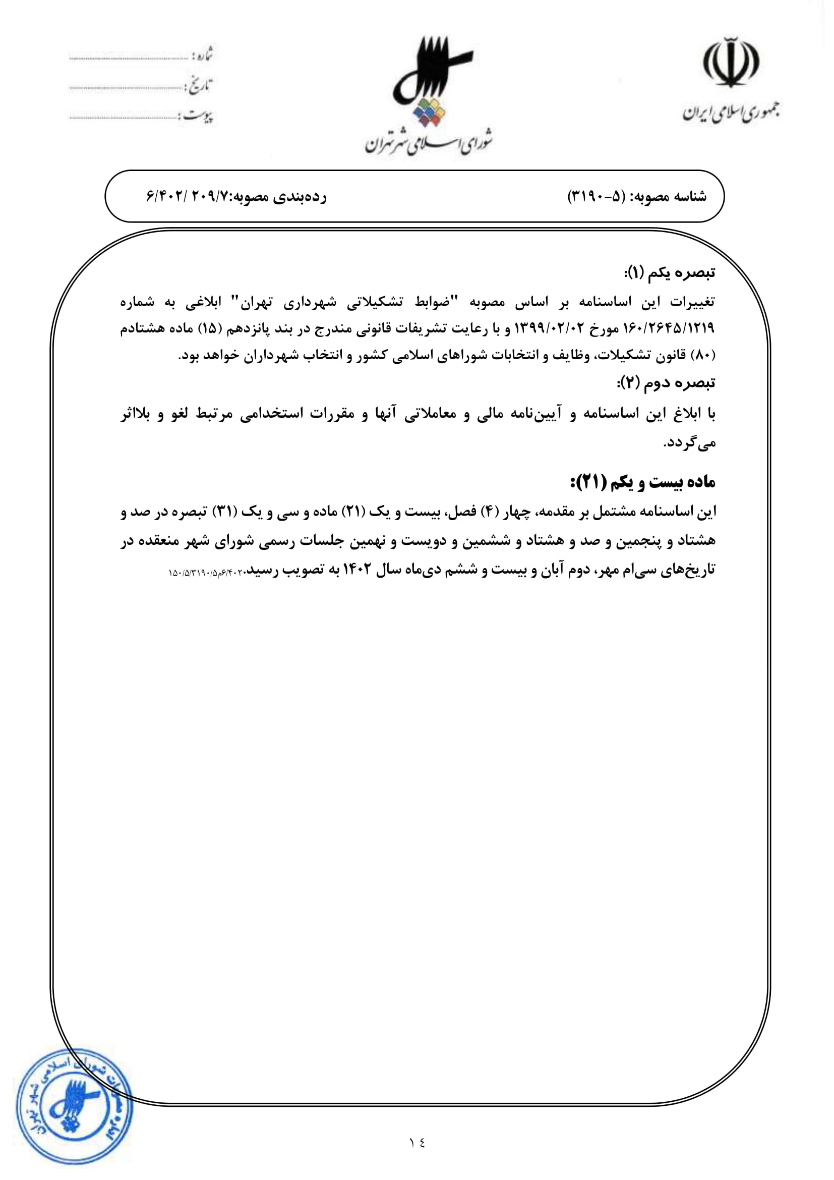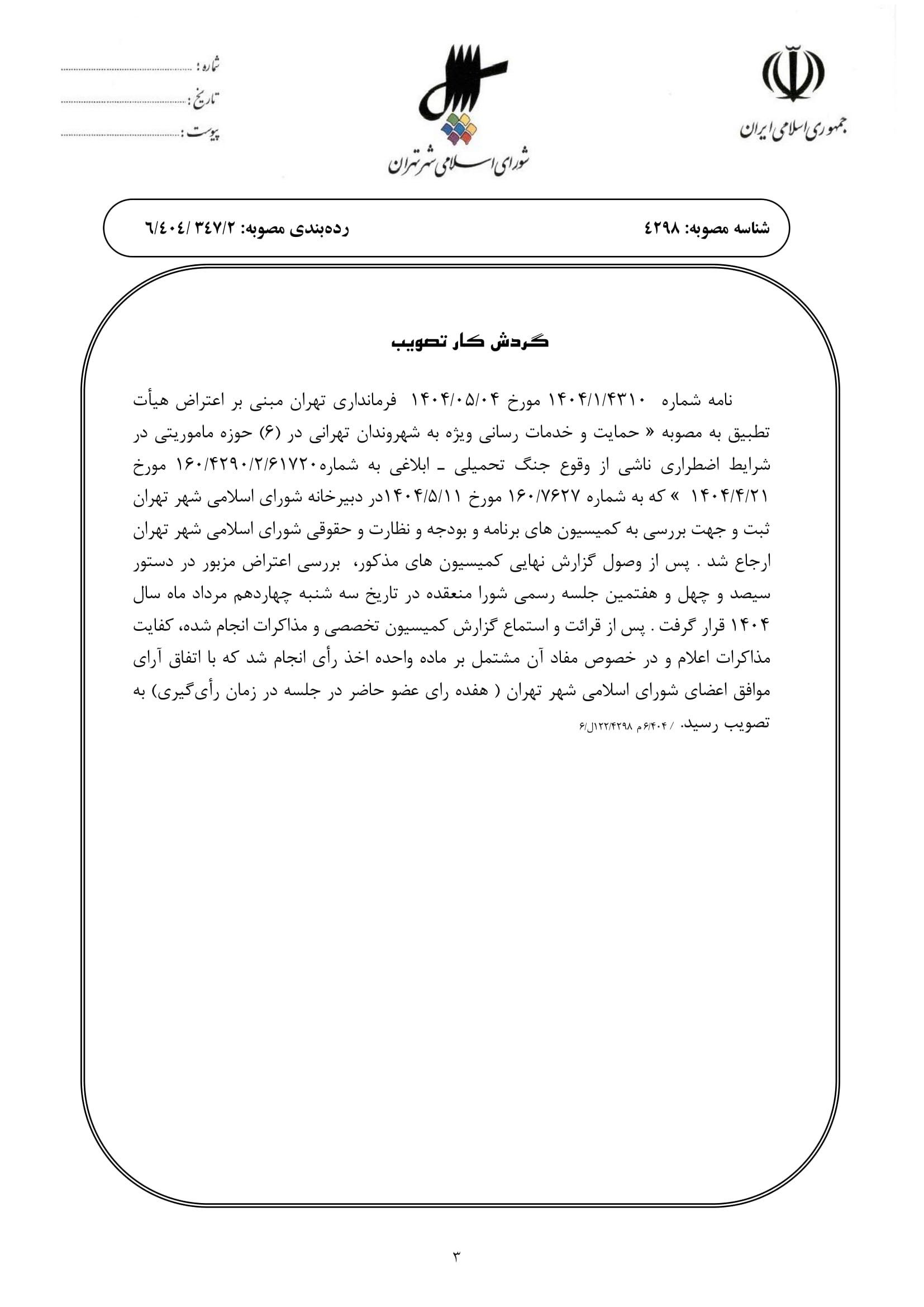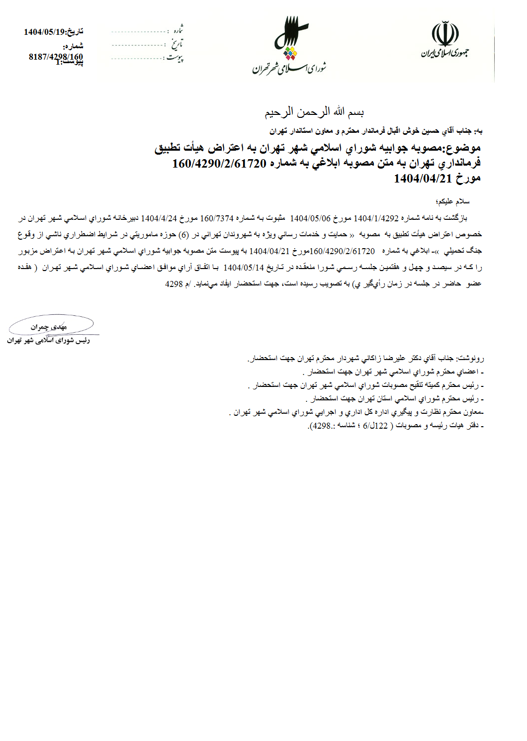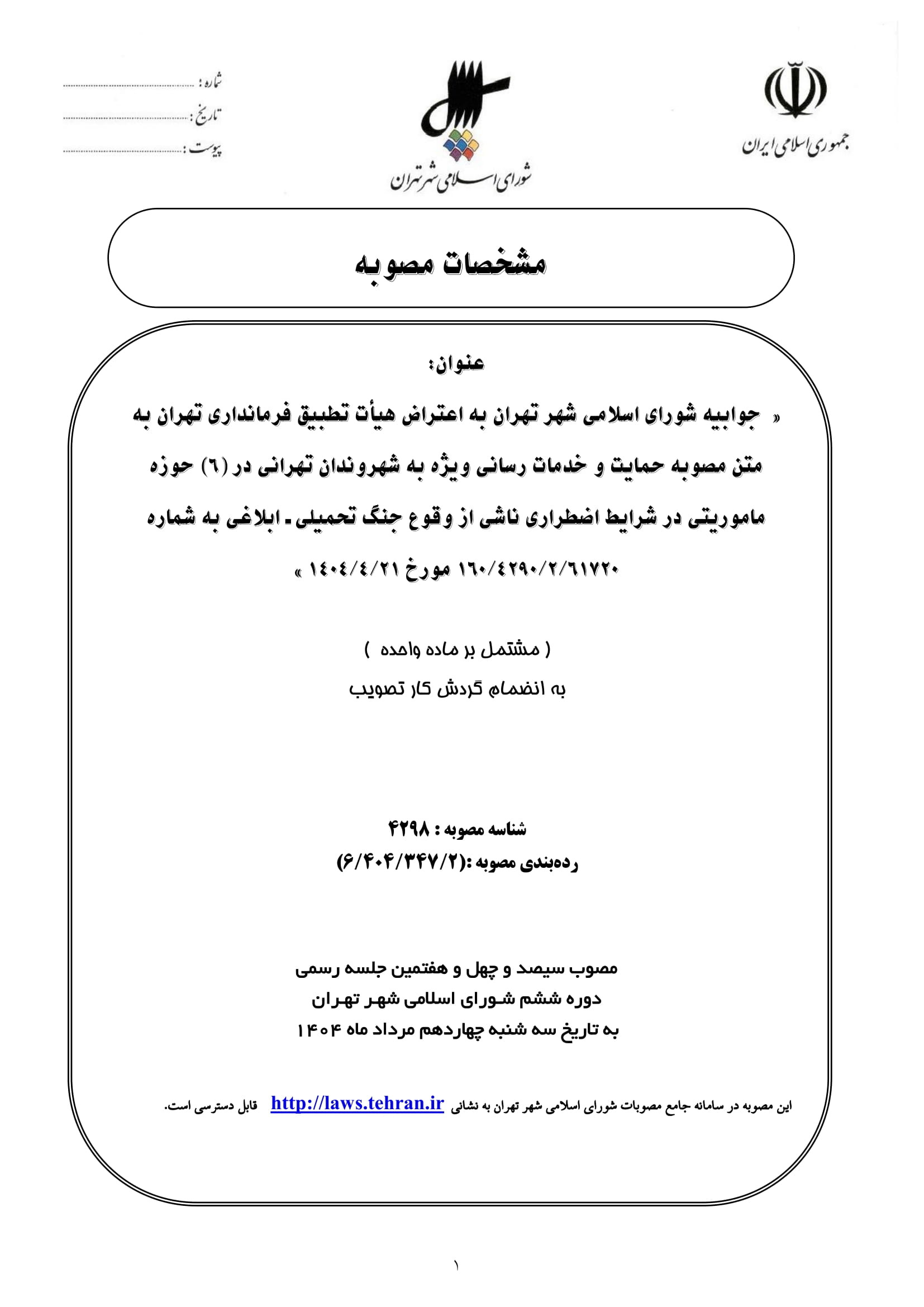 جوابيه شوراي اسلامي شهر تهران به اعتراض هيأت تطبيق فرمانداري تهران به متن مصوبه «حمايت و خدماترساني ويژه به شهروندان تهراني در (6) حوزه مأموريتي در شرايط اضطراري ناشي از وقوع جنگ تحميلي» ـ ابلاغي به شماره 160/4290/2/61720 مورخ 1404/04/21 مصوب 1404/05/14