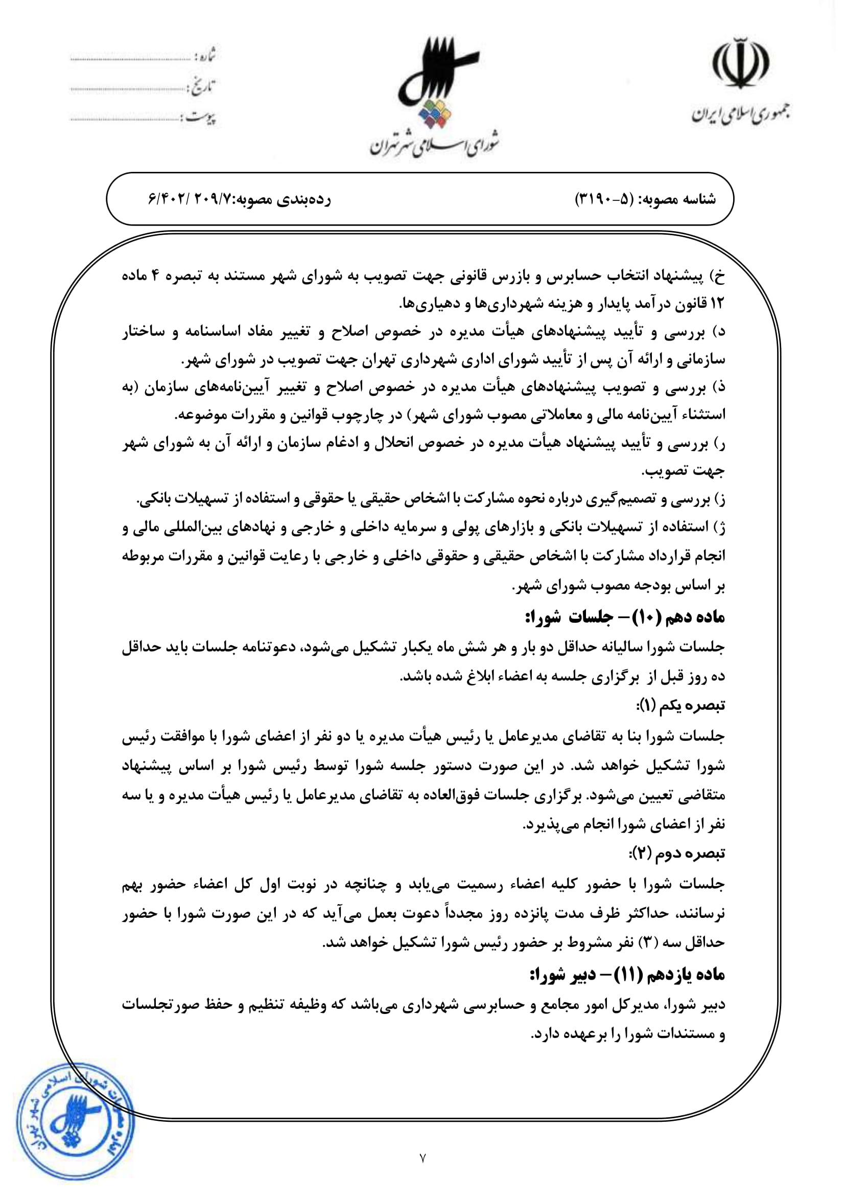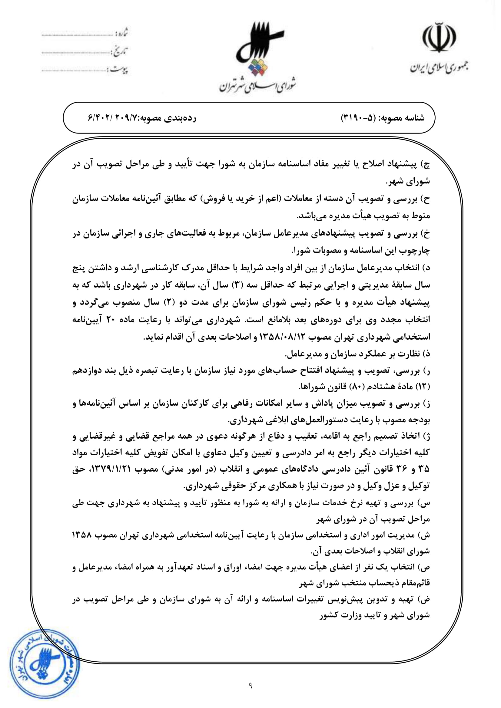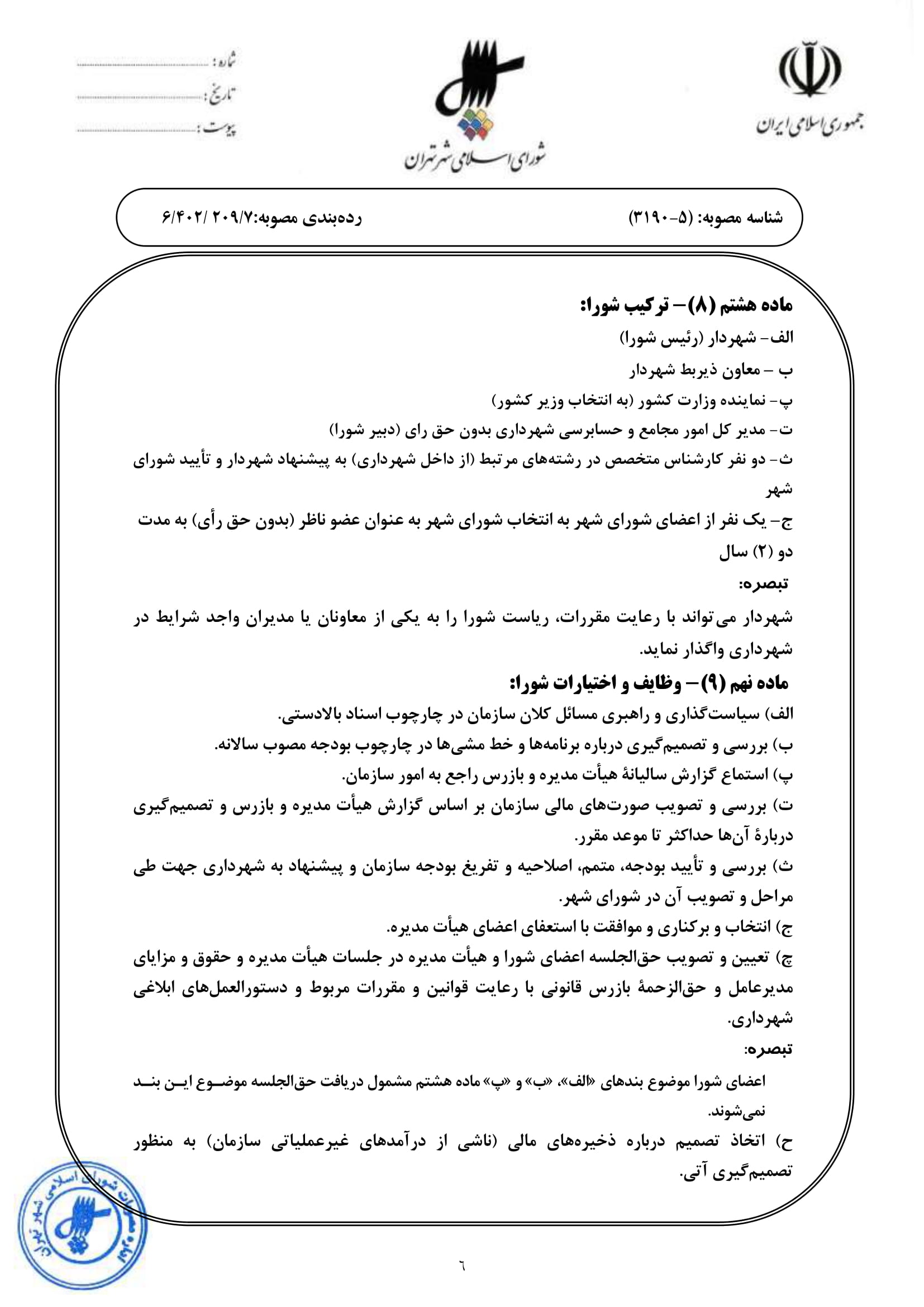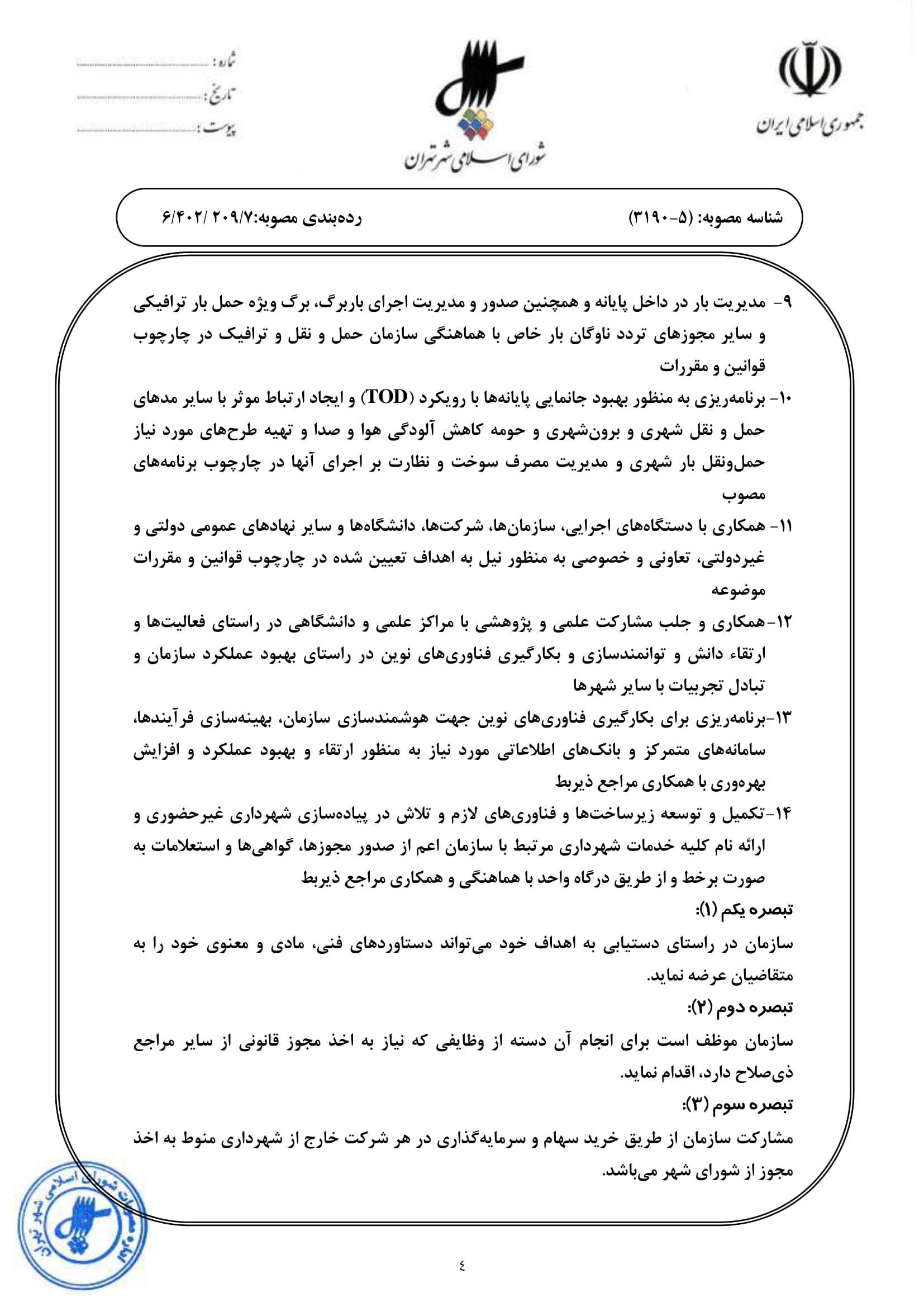 جوابيه شوراي اسلامي شهر تهران به اعتراض هيأت تطبيق فرمانداري تهران به متن مصوبه «حمايت و خدماترساني ويژه به شهروندان تهراني در (6) حوزه مأموريتي در شرايط اضطراري ناشي از وقوع جنگ تحميلي» ـ ابلاغي به شماره 160/4290/2/61720 مورخ 1404/04/21 مصوب 1404/05/14