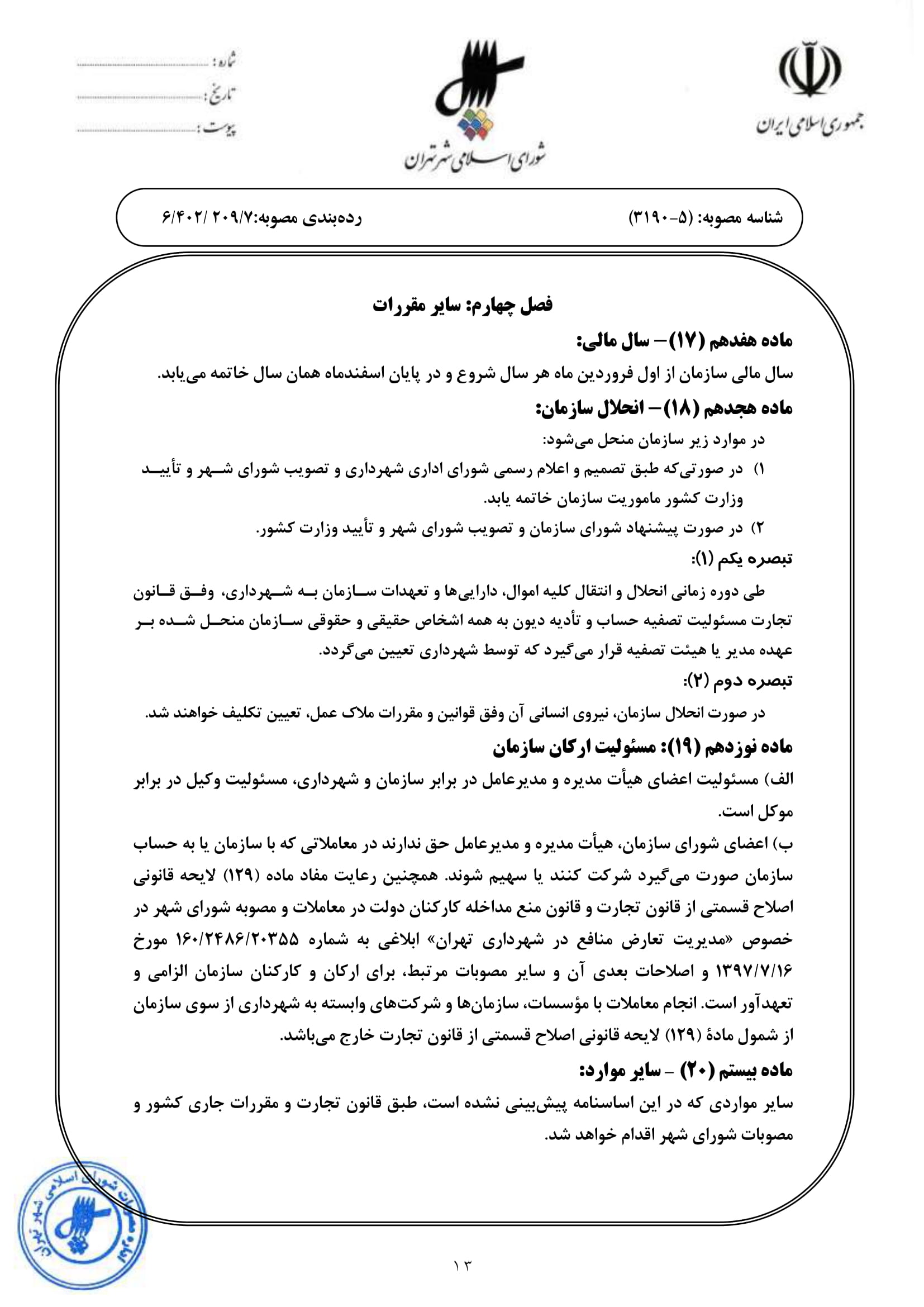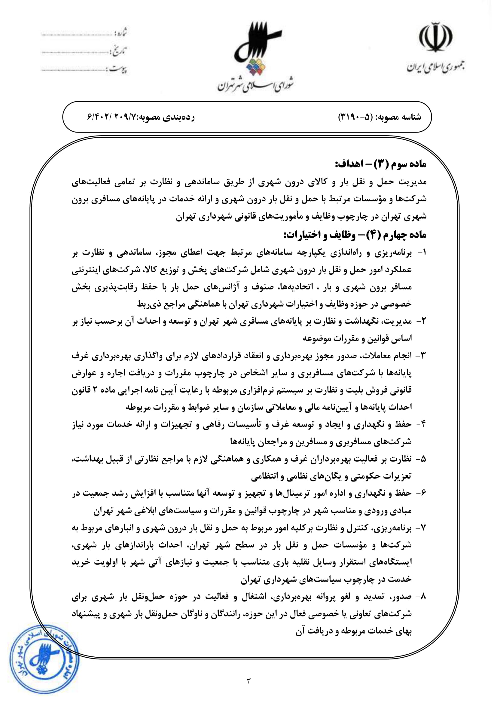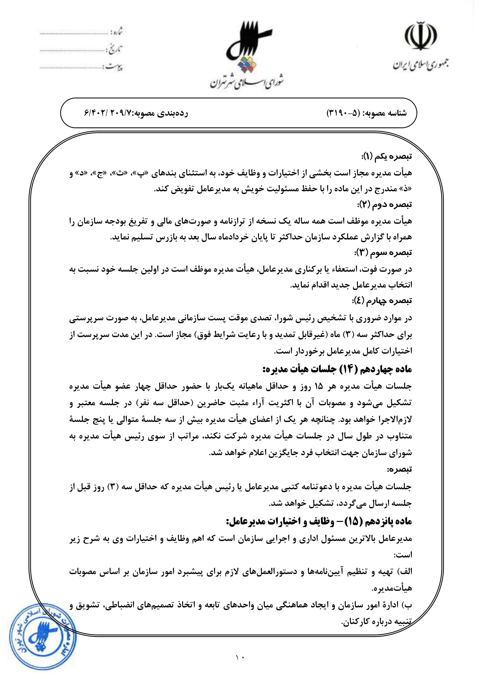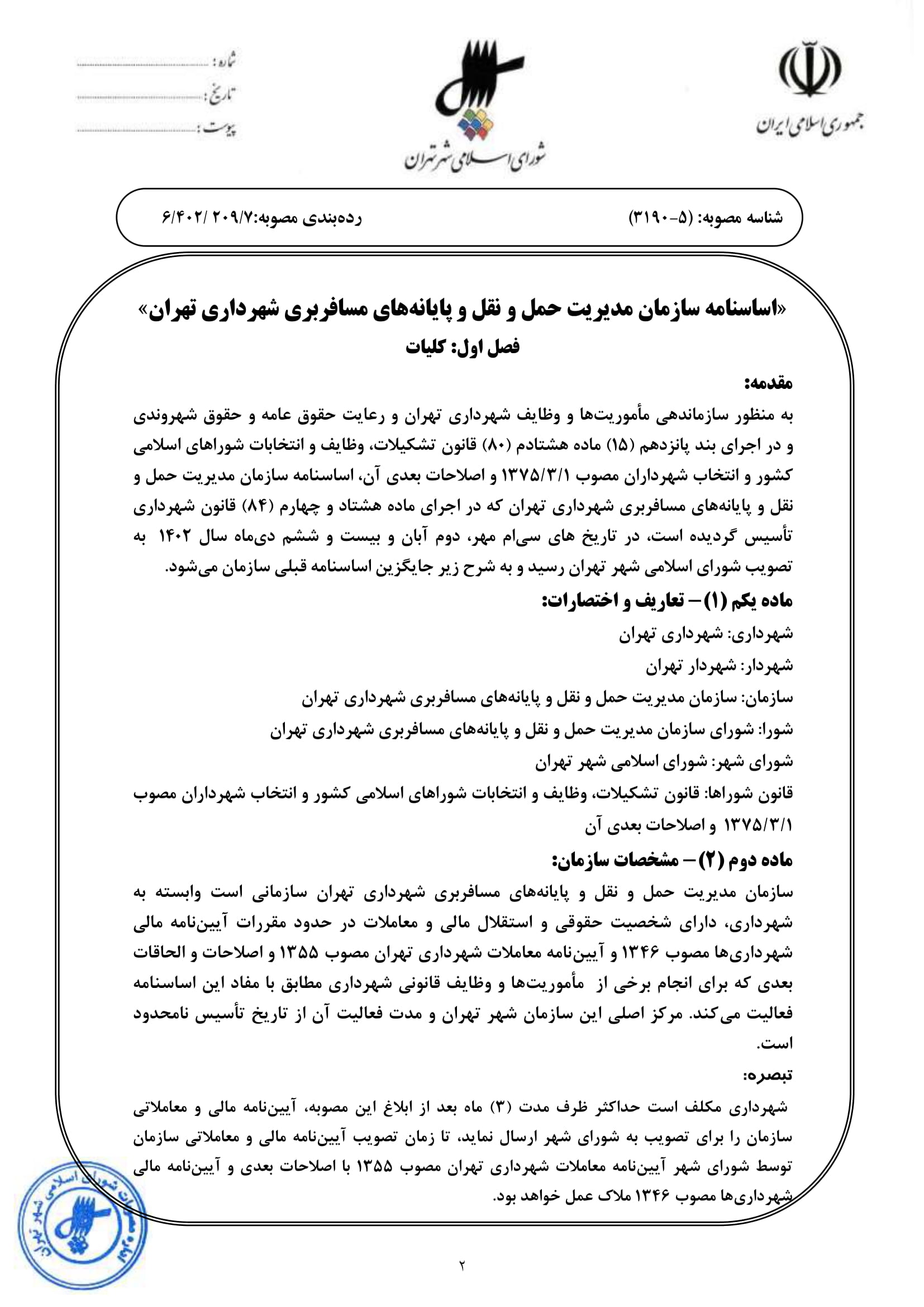 جوابيه شوراي اسلامي شهر تهران به اعتراض هيأت تطبيق فرمانداري تهران به متن مصوبه «حمايت و خدماترساني ويژه به شهروندان تهراني در (6) حوزه مأموريتي در شرايط اضطراري ناشي از وقوع جنگ تحميلي» ـ ابلاغي به شماره 160/4290/2/61720 مورخ 1404/04/21 مصوب 1404/05/14