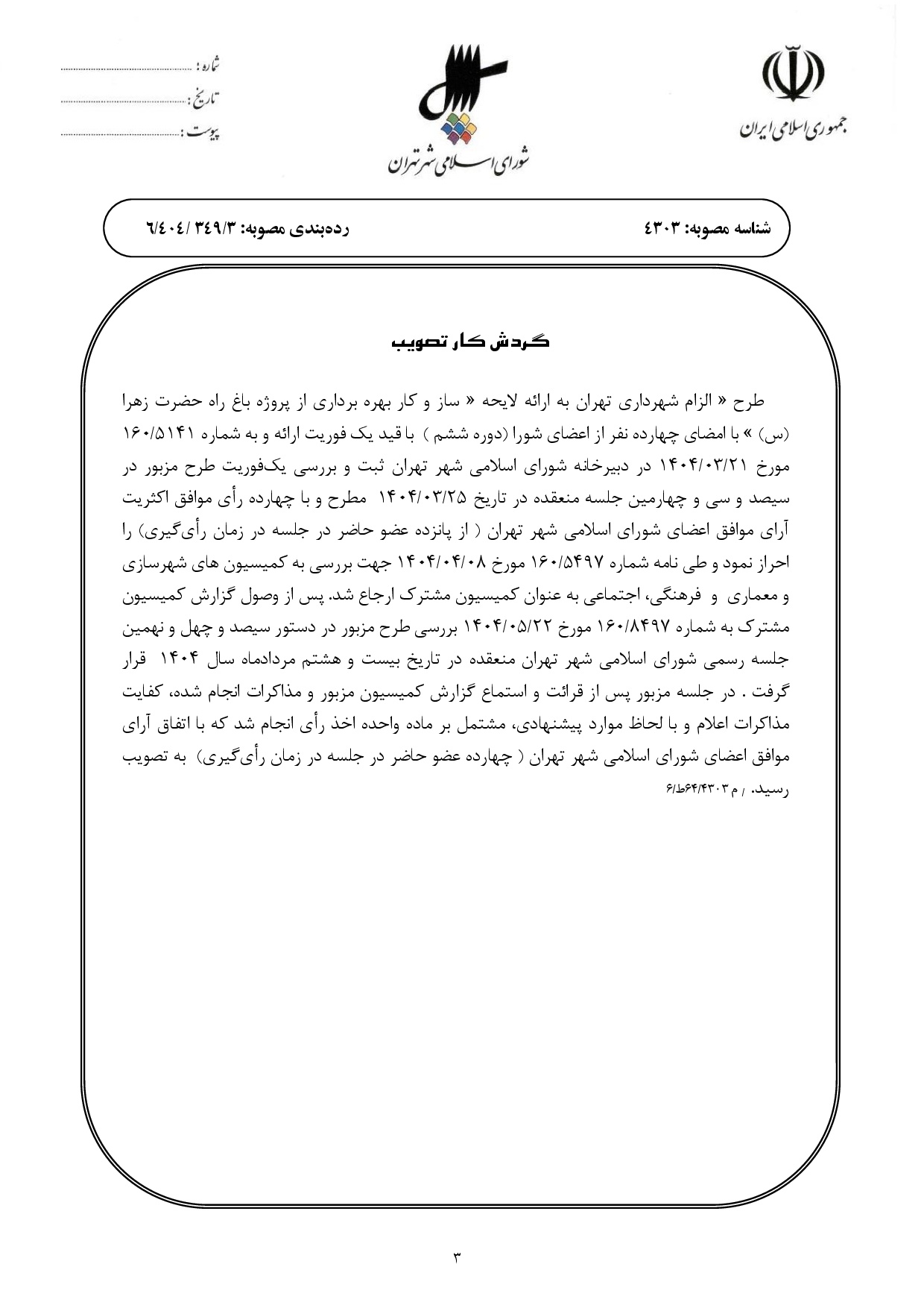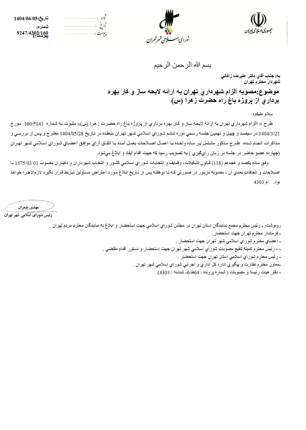 الزام شهرداري تهران به ارائه لايحه سازوكار بهرهبرداري از پروژه باغراه حضرت زهرا (س)