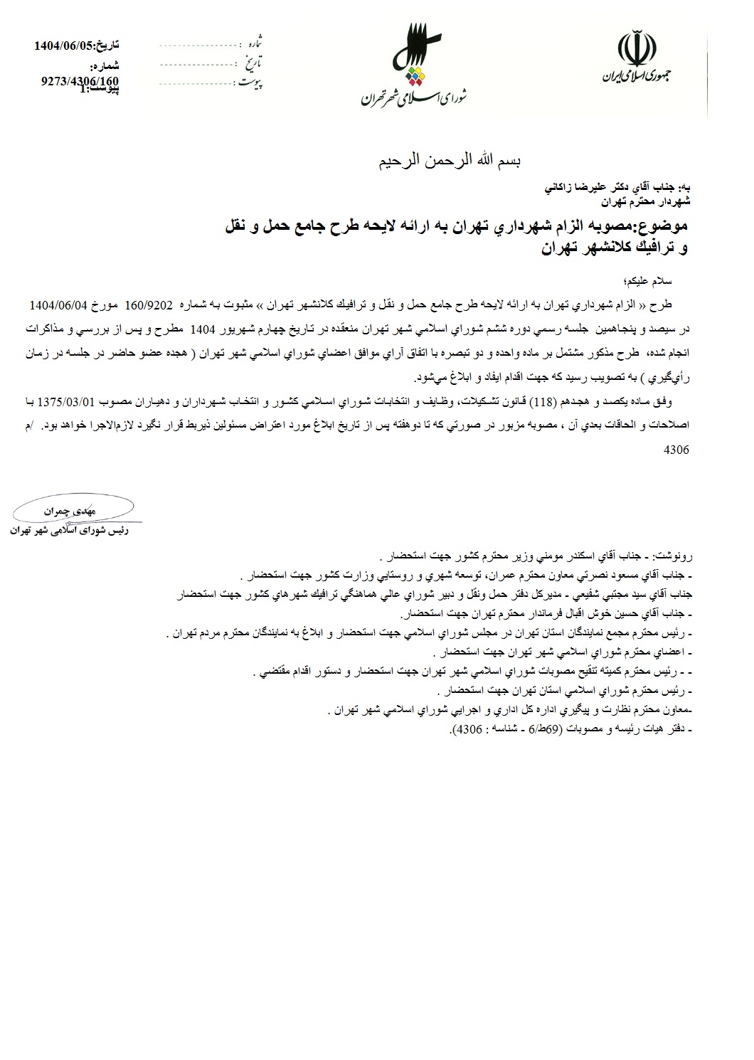 الزام شهرداري تهران به ارائه لايحه طرح جامع حمل و نقل و ترافيك كلانشهر تهران
