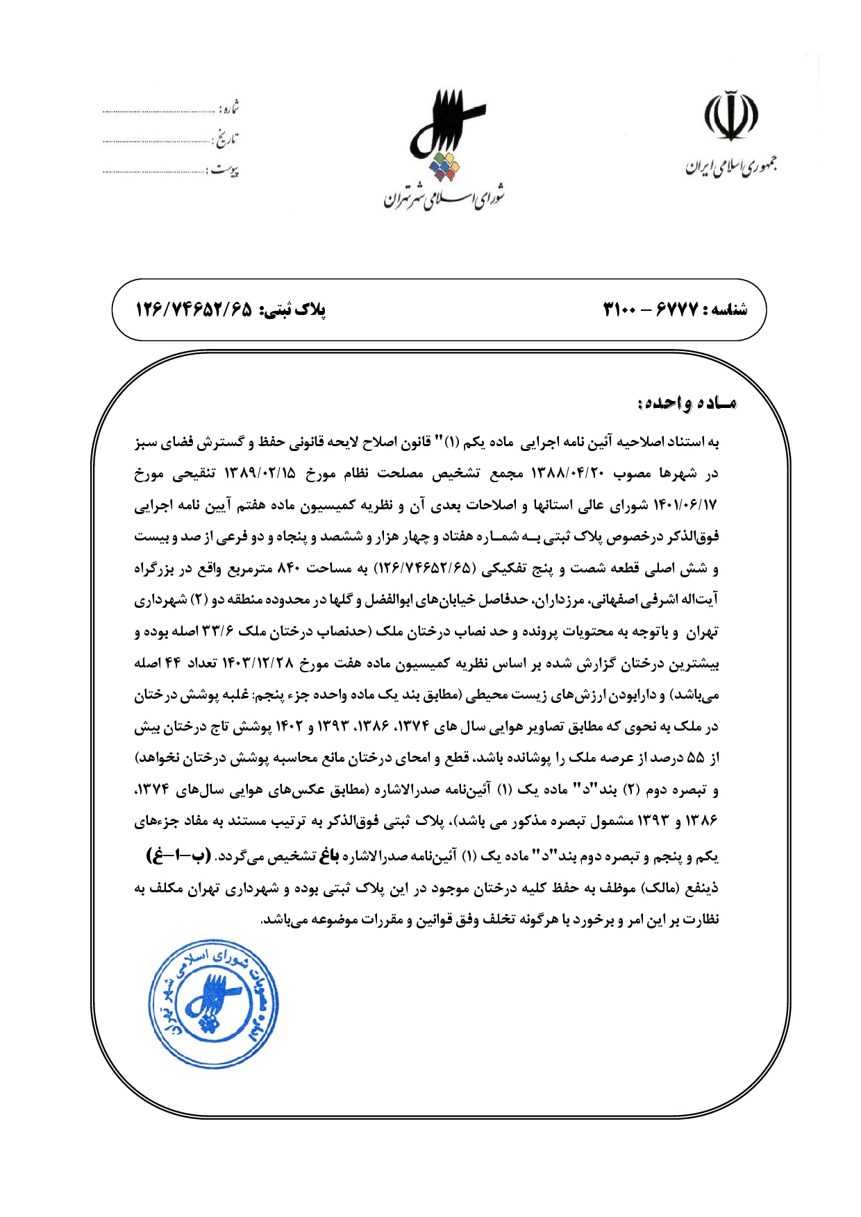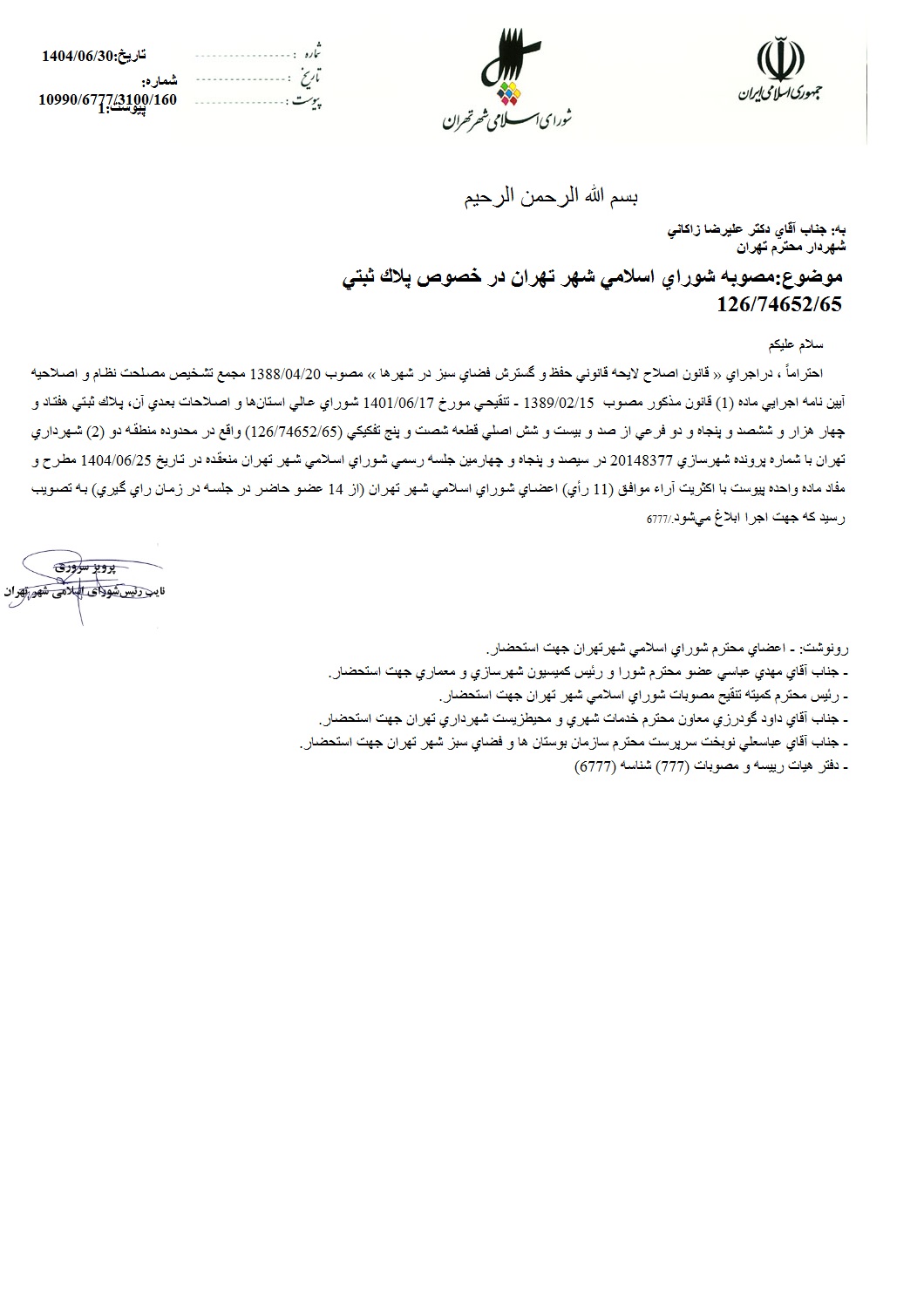 مصوبه شوراي اسلامي شهر تهران در خصوص پلاك ثبتي به شماره هفتاد و چهار هزار و ششصد و پنجاه و دو فرعي از صد و بيست و شش اصلي قطعه شصت و پنج تفكيكي (126/74652/65) واقع در محدوده منطقه دو (2) شهرداري تهران