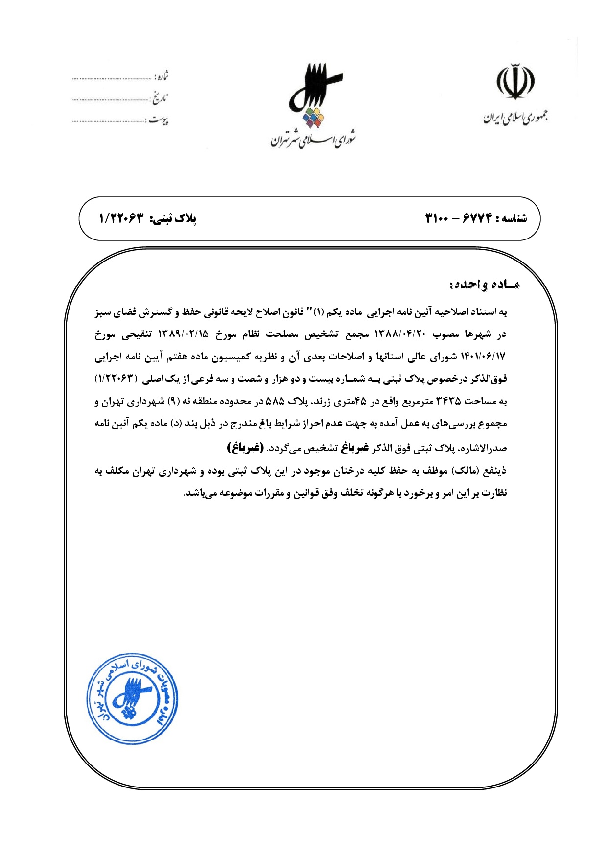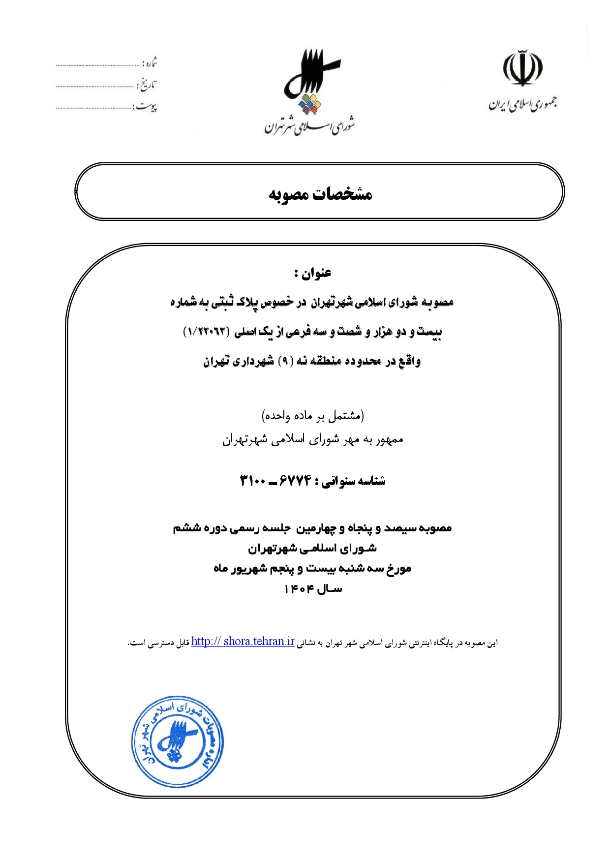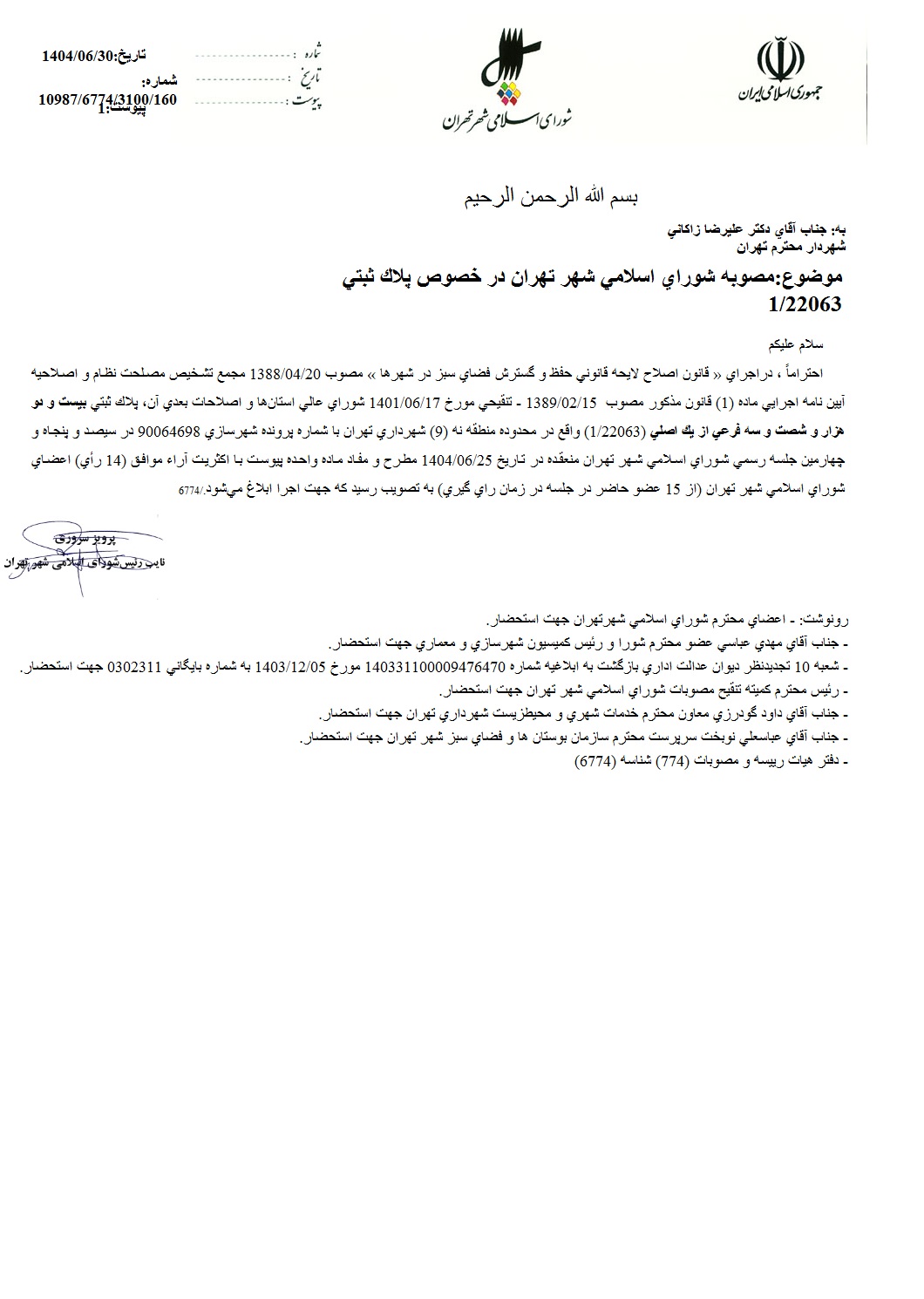 مصوبه شوراي اسلامي شهر تهران در خصوص پلاك ثبتي به شماره بيست و دو هزار و شصت و سه فرعي از يك اصلي (1/22063) واقع در محدوده منطقه نه (9) شهرداري تهران