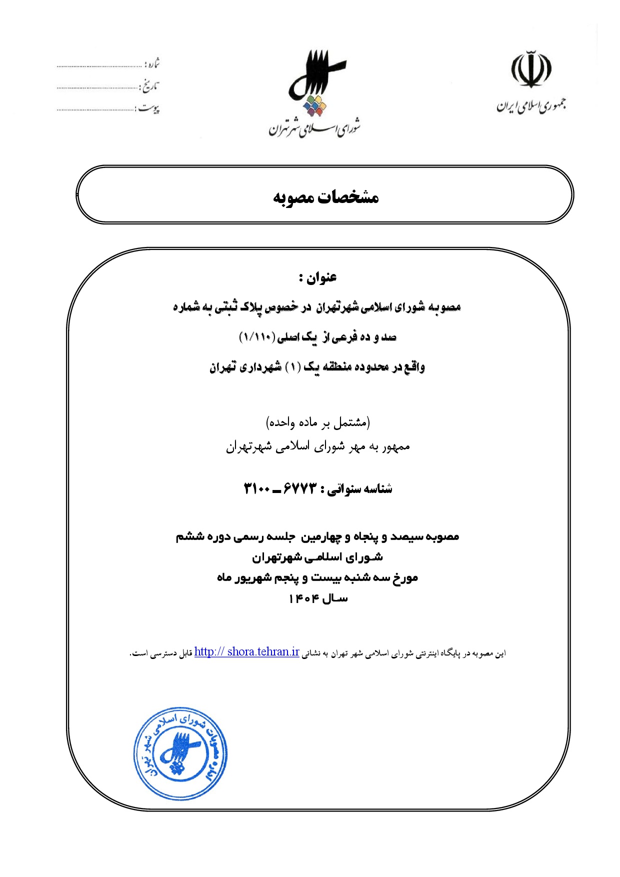 مصوبه شوراي اسلامي شهر تهران در خصوص پلاك ثبتي به شماره صد و ده فرعي از يك اصلي (1/110) واقع در محدوده منطقه يك (1) شهرداري تهران