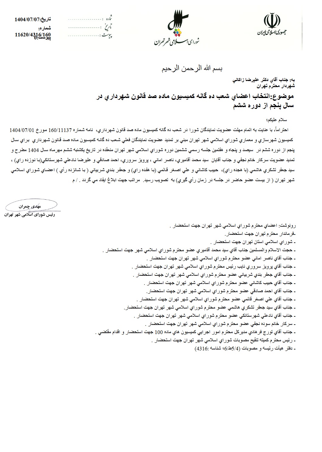انتخاب اعضاي شعب دهگانه كميسيون ماده صد قانون شهرداري در سال پنجم از دوره ششم