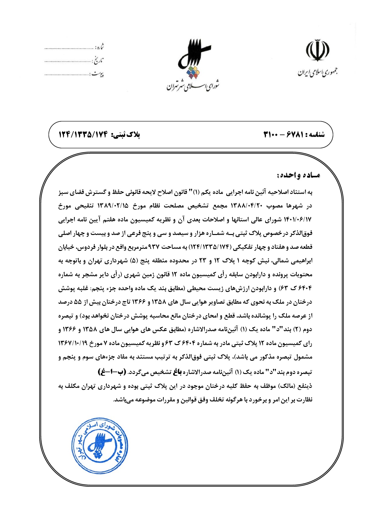مصوبه شوراي اسلامي شهر تهران در خصوص پلاك ثبتي به شماره هزار و سيصد و سي و پنج فرعي از صد و بيست و چهار اصلي قطعه صد و هفتاد و چهار تفكيكي (124/1335/174) واقع در محدوده منطقه پنج (5) شهرداري تهران