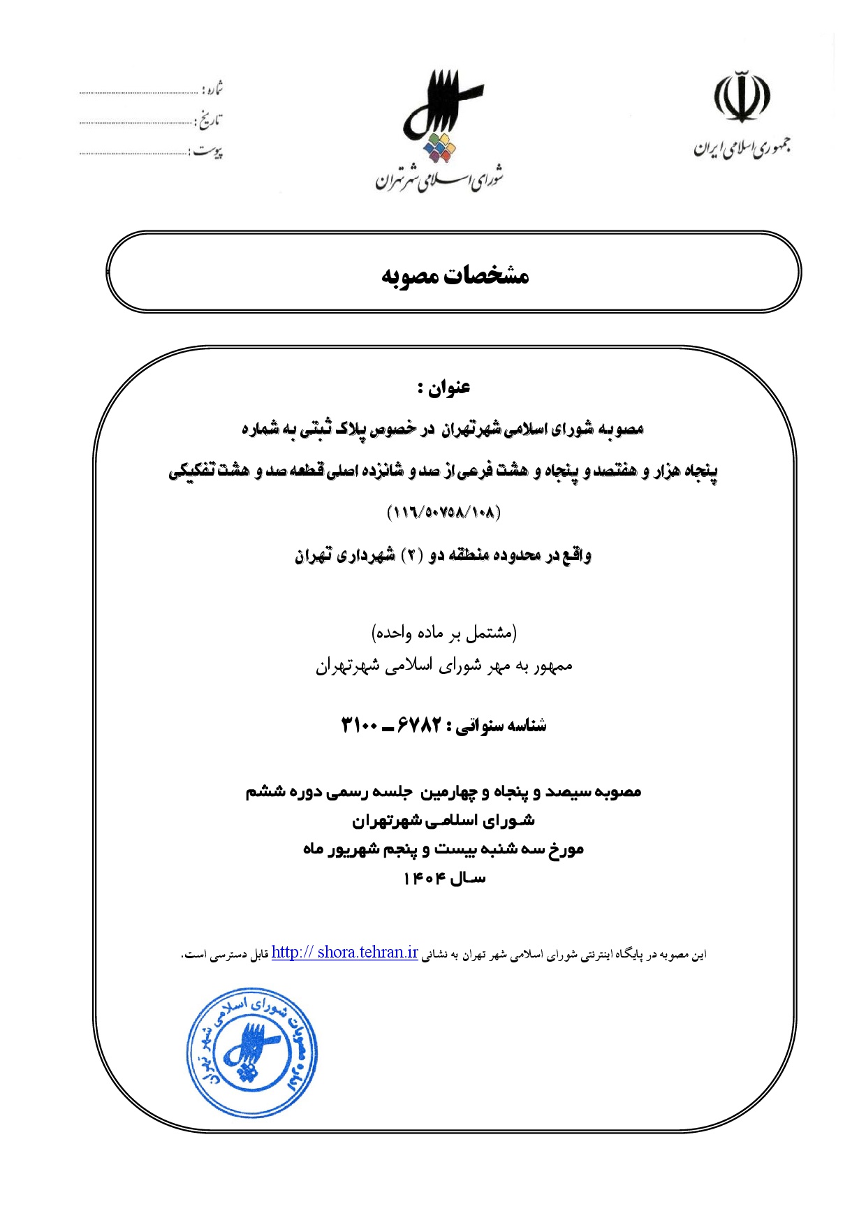 مصوبه شوراي اسلامي شهر تهران در خصوص پلاك ثبتي به شماره پنجاه هزار و هفتصد و پنجاه و هشت فرعي از صد و شانزده اصلي قطعه صد و هشت تفكيكي (116/50758/108) واقع در محدوده منطقه دو (2) شهرداري تهران