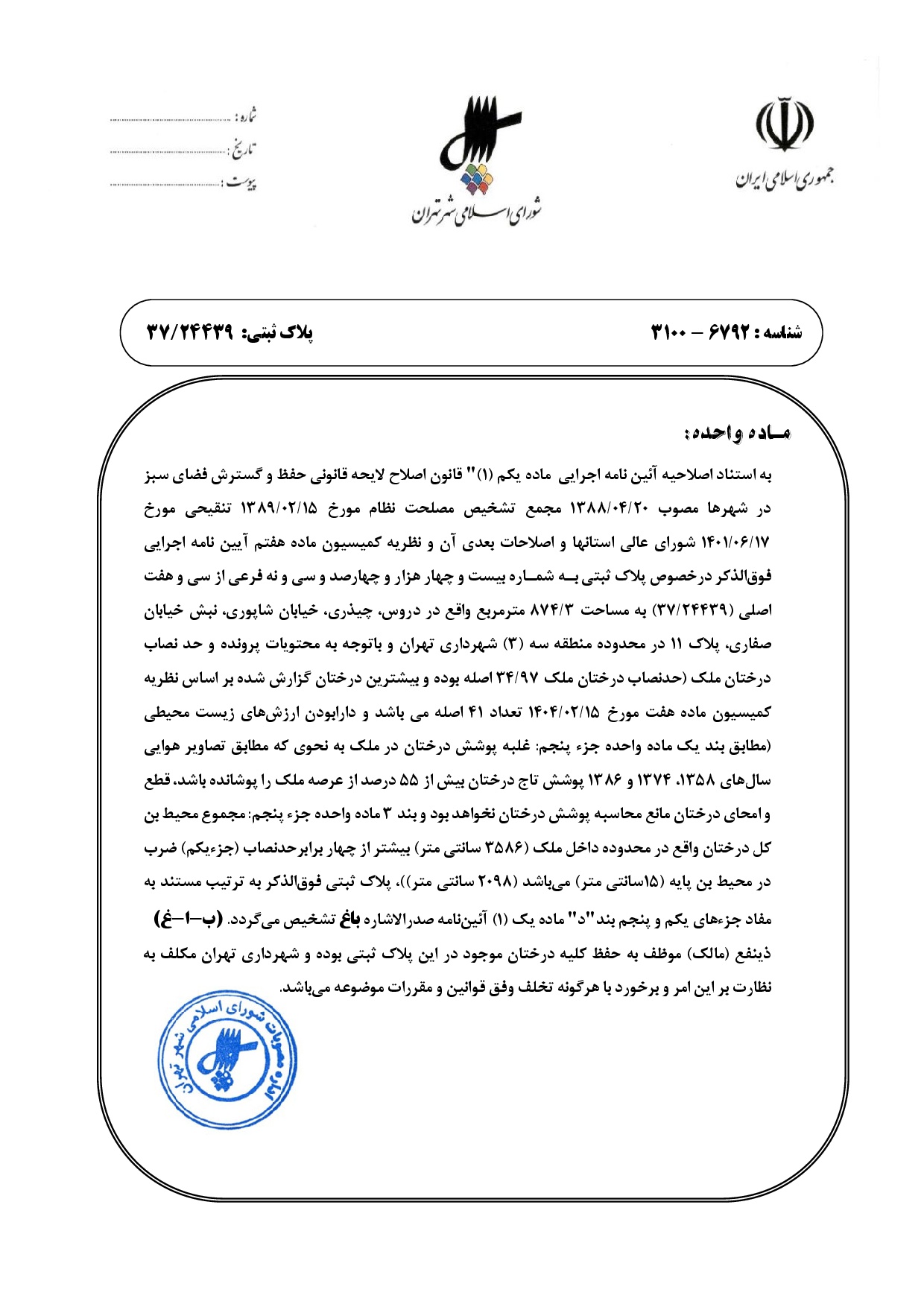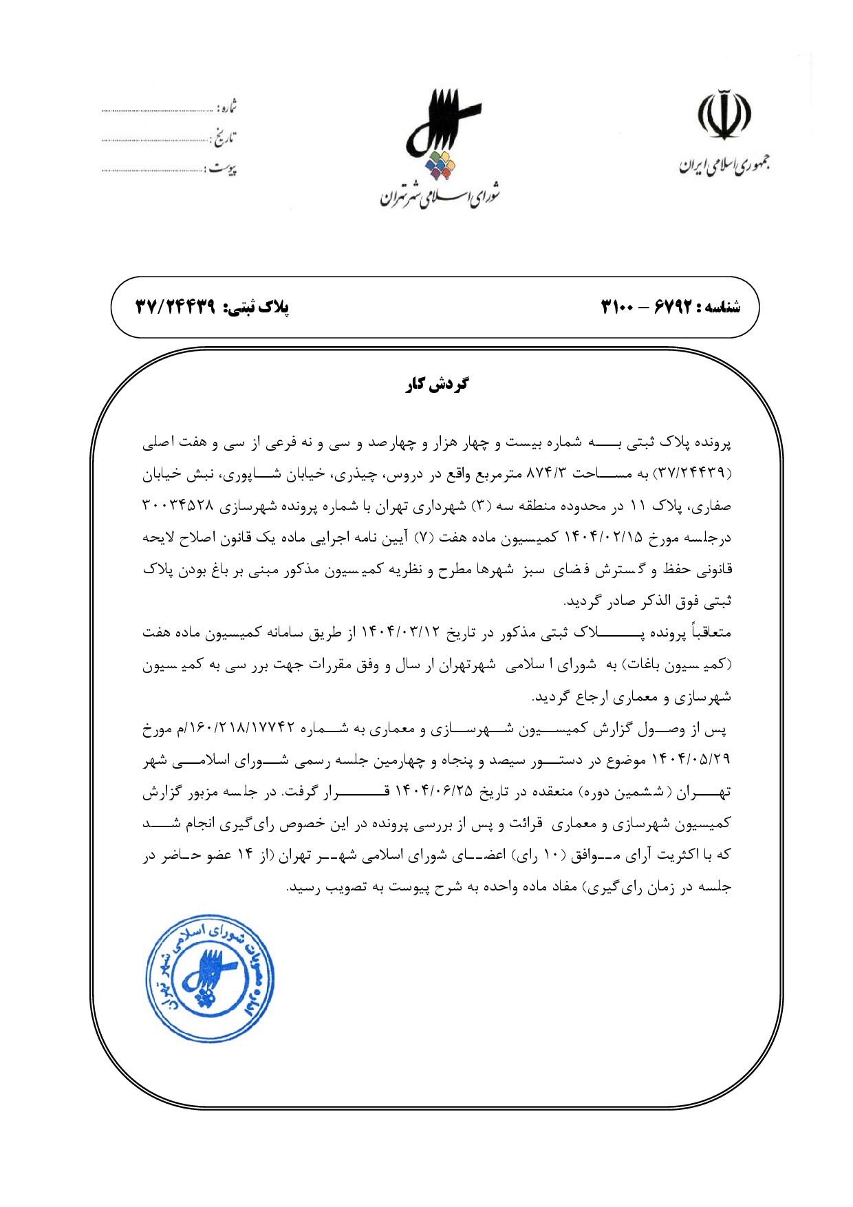 مصوبه شوراي اسلامي شهر تهران در خصوص پلاك ثبتي به شماره بيست و چهار هزار و چهارصد و سي و نه فرعي از سي و هفت اصلي (37/24439) واقع در محدوده منطقه سه (3) شهرداري تهران
