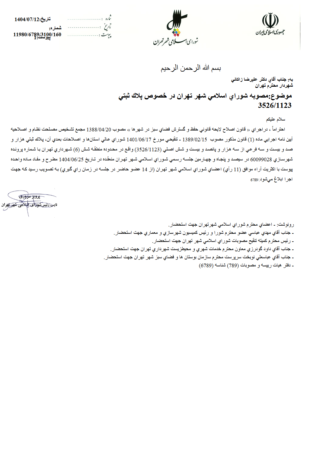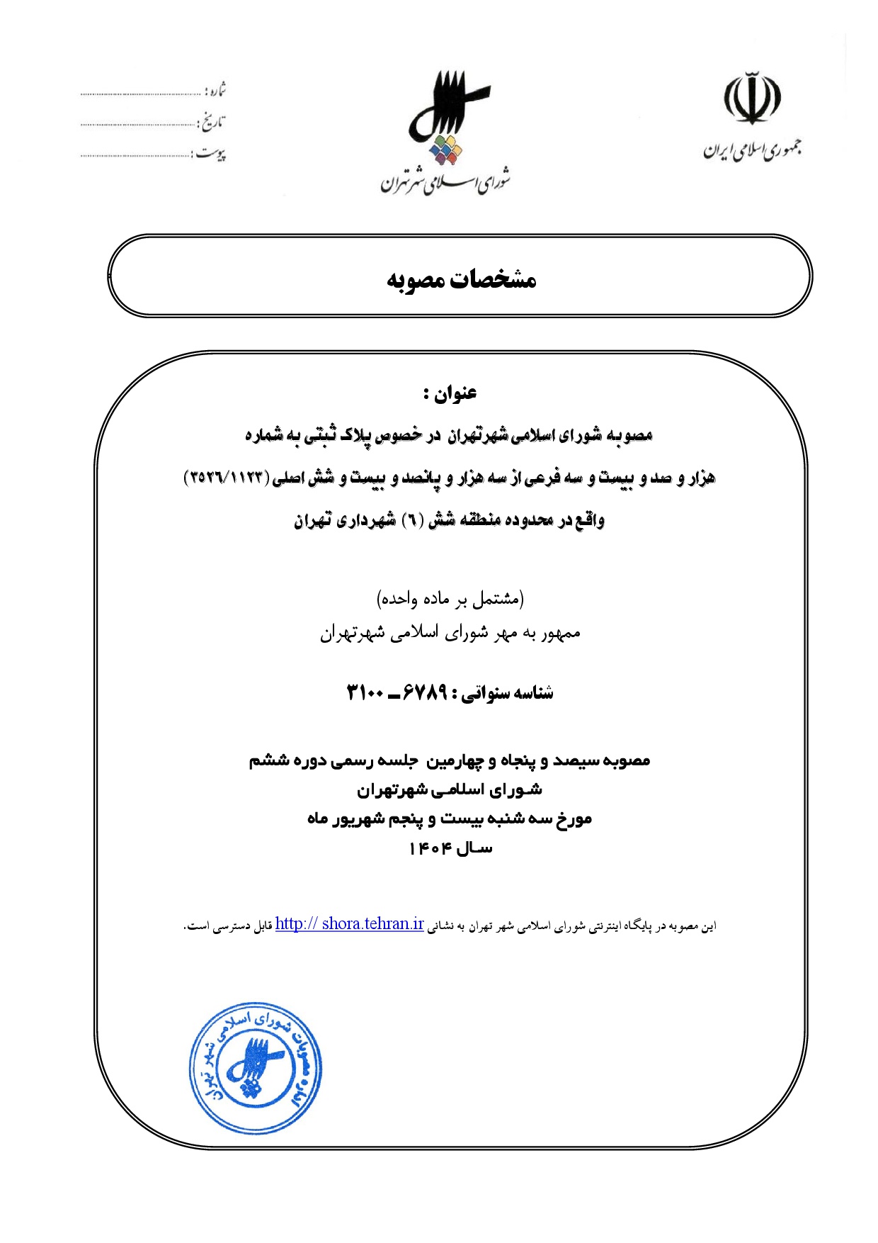 مصوبه شوراي اسلامي شهر تهران در خصوص پلاك ثبتي به شماره هزار و صد و بيست و سه فرعي از سه هزار و پانصد و بيست و شش اصلي (3526/1123) واقع در محدوده منطقه شش (6) شهرداري تهران
