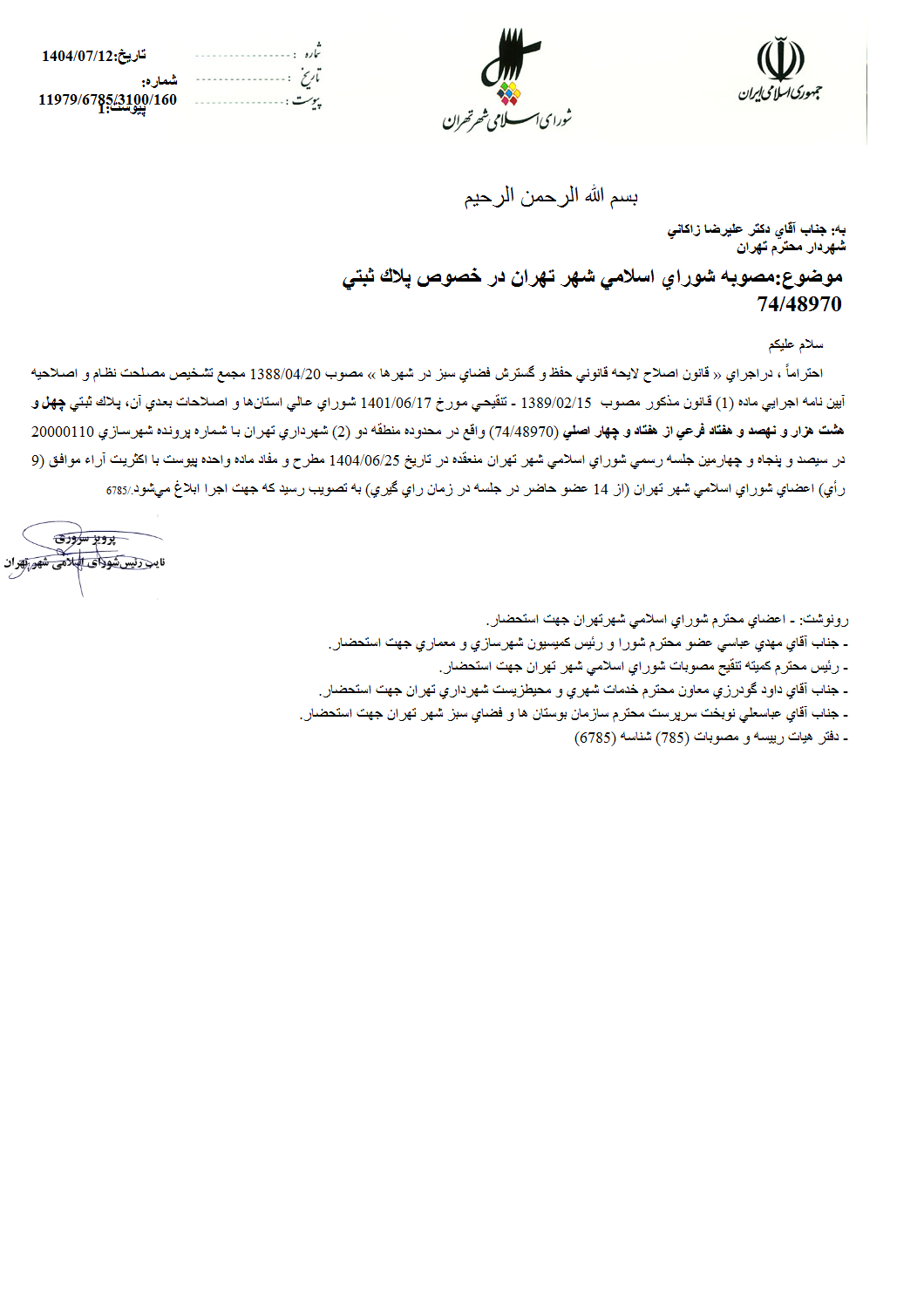 مصوبه شوراي اسلامي شهر تهران در خصوص پلاك ثبتي به شماره چهل و هشت هزار و نهصد و هفتاد فرعي از هفتاد و چهار اصلي (74/48970) واقع در محدوده منطقه دو (2) شهرداري تهران