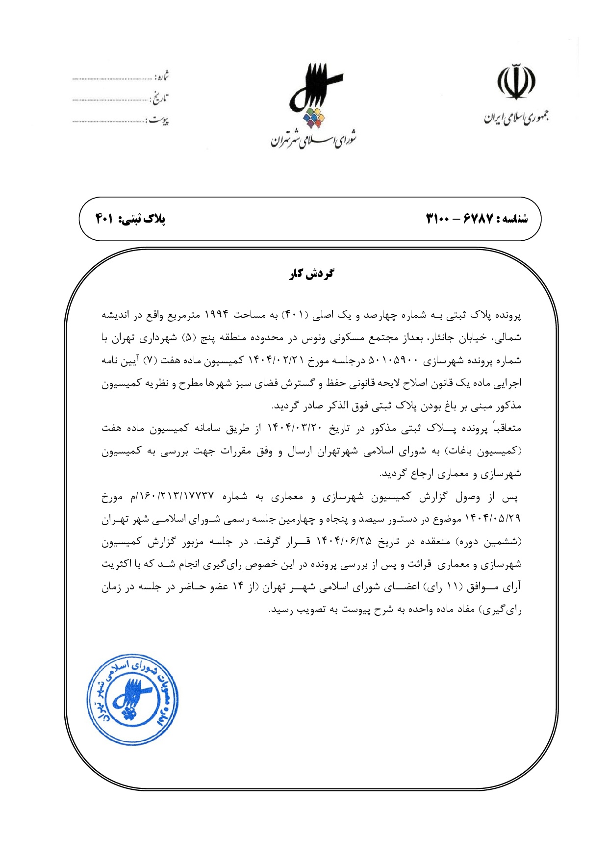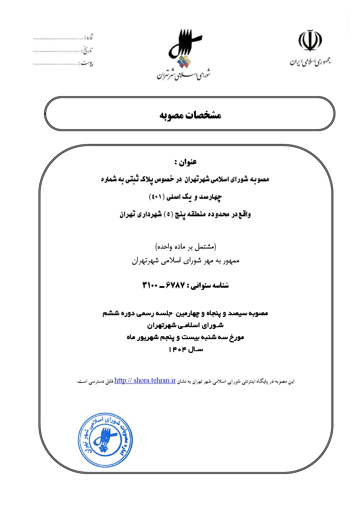 مصوبه شوراي اسلامي شهر تهران در خصوص پلاك ثبتي به شماره چهارصد و يك اصلي (401) واقع در محدوده منطقه پنج (5) شهرداري تهران