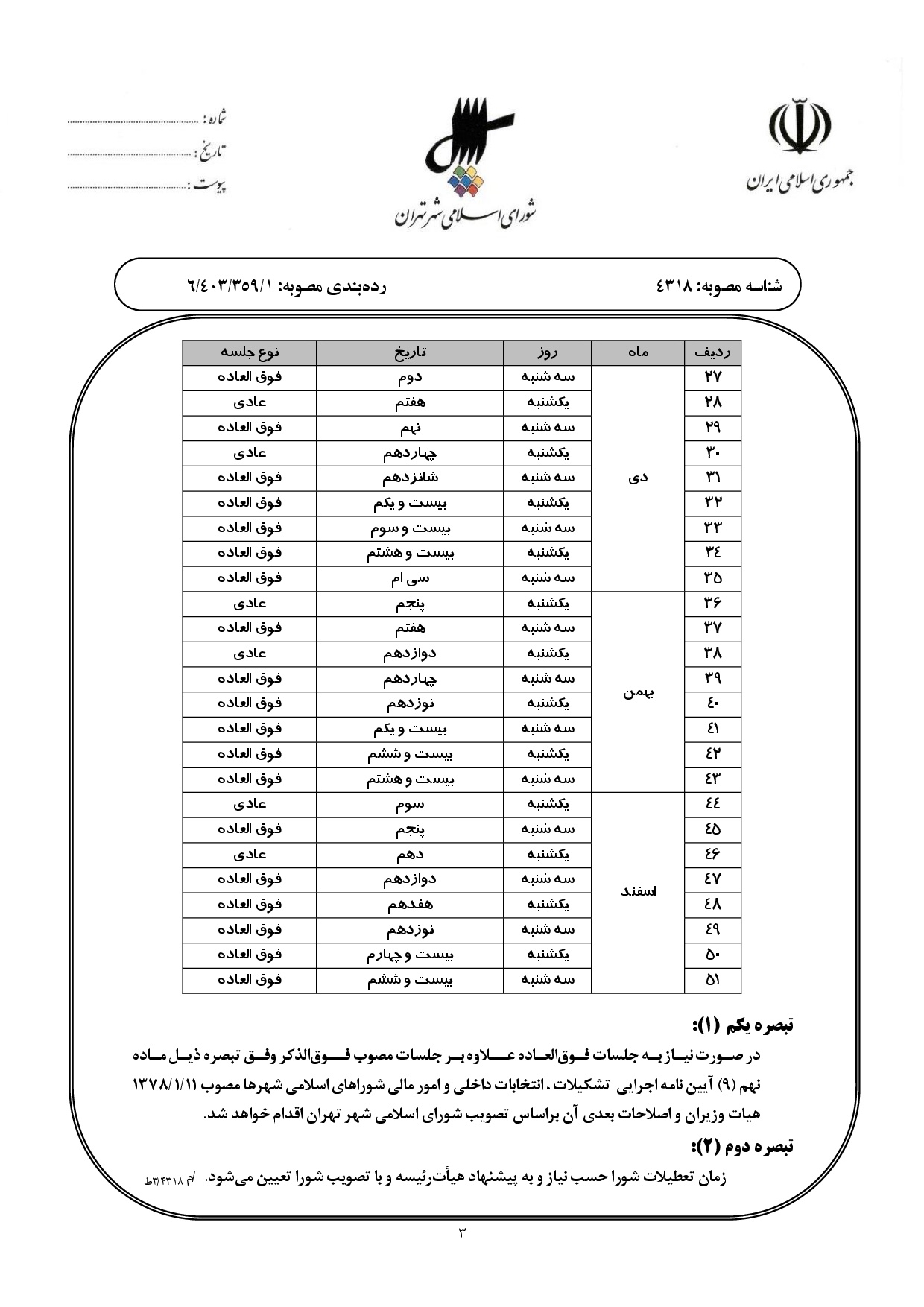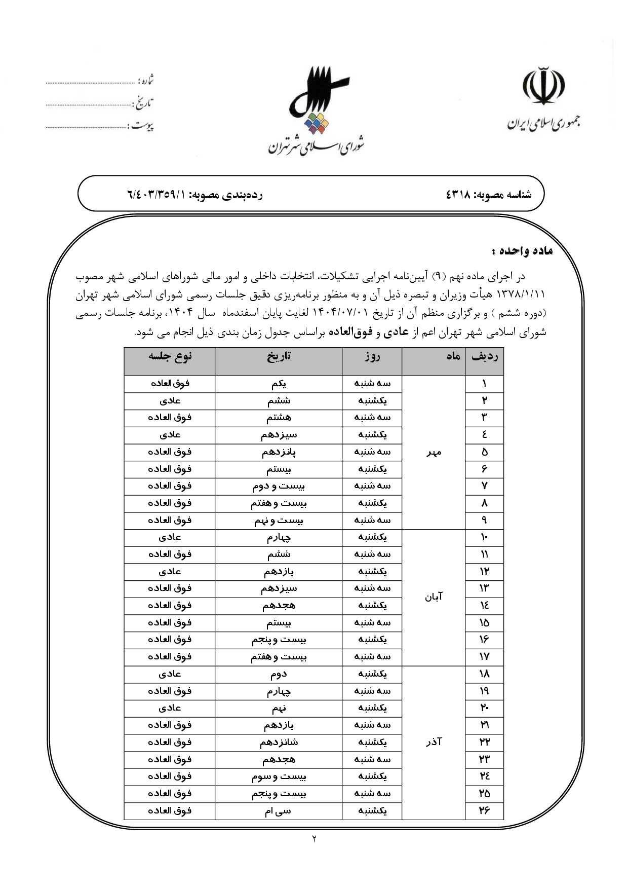 زمان برگزاري جلسات عادي و فوقالعاده شوراي اسلامي شهر تهران (ششمين دوره) در نيمه دوم سال 1404