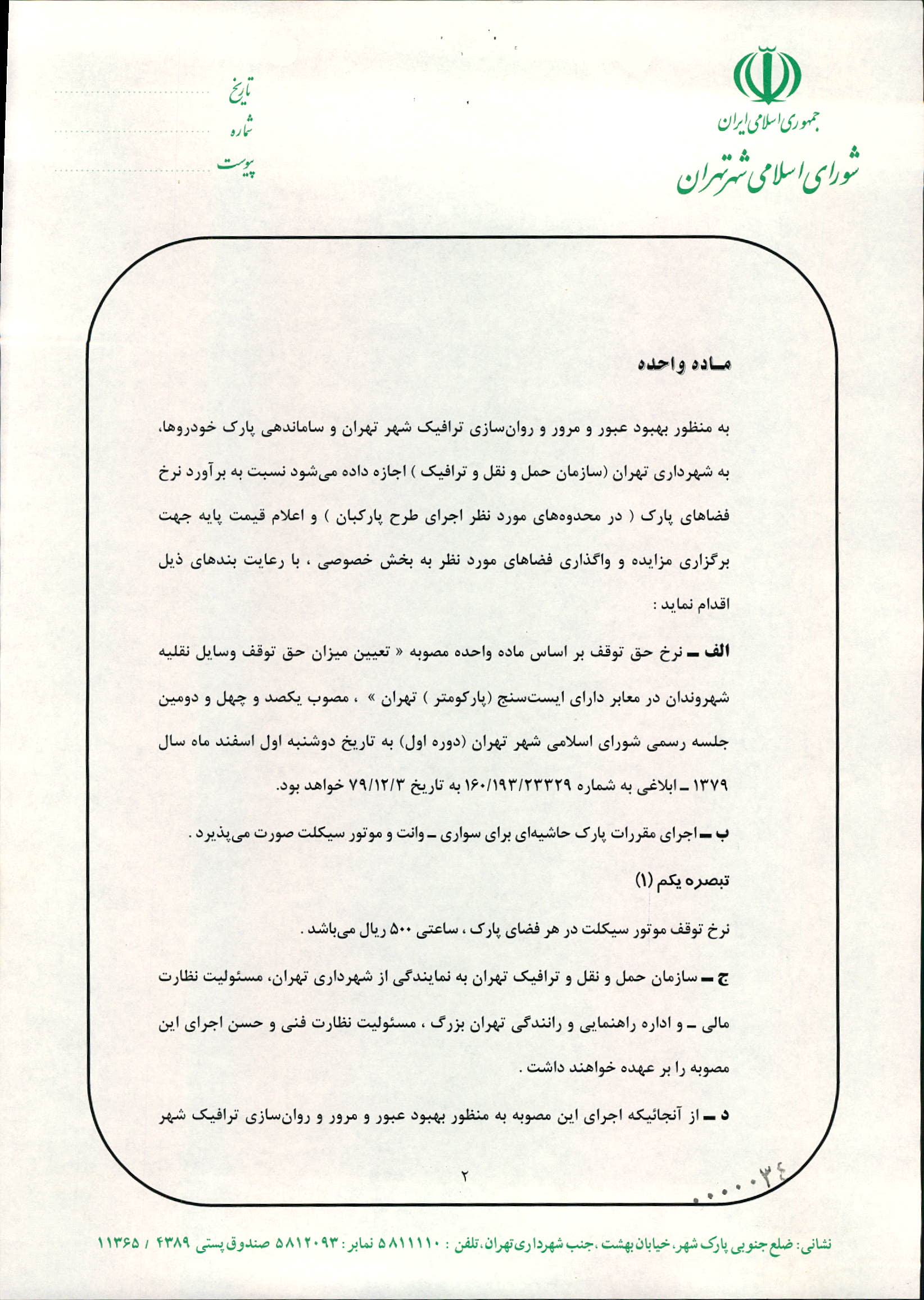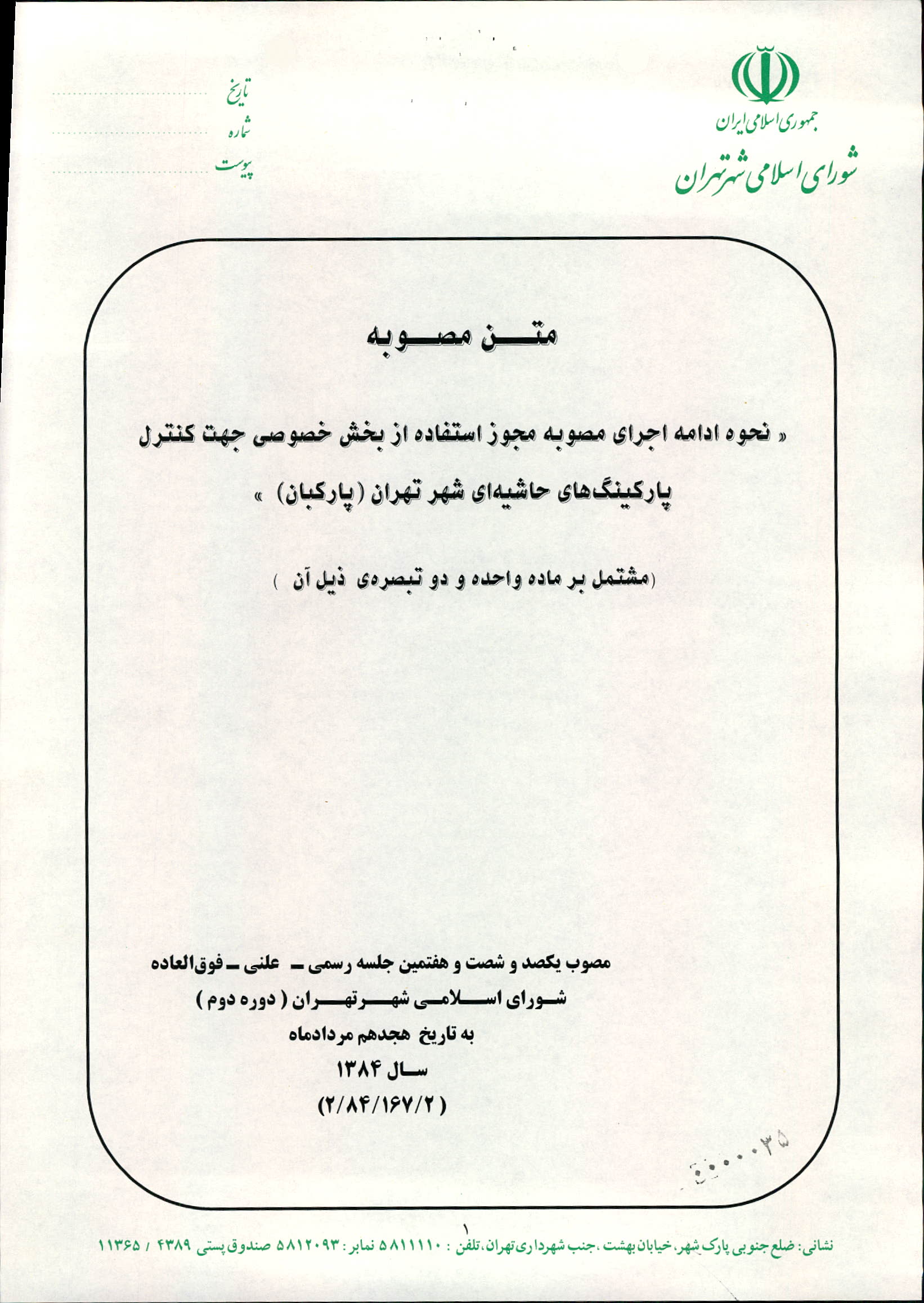 نحوه ادامه اجراي مصوبه مجوز استفاده از بخش خصوصي جهت كنترل پاركينگهاي حاشيهاي شهر تهران (پاركبان)
