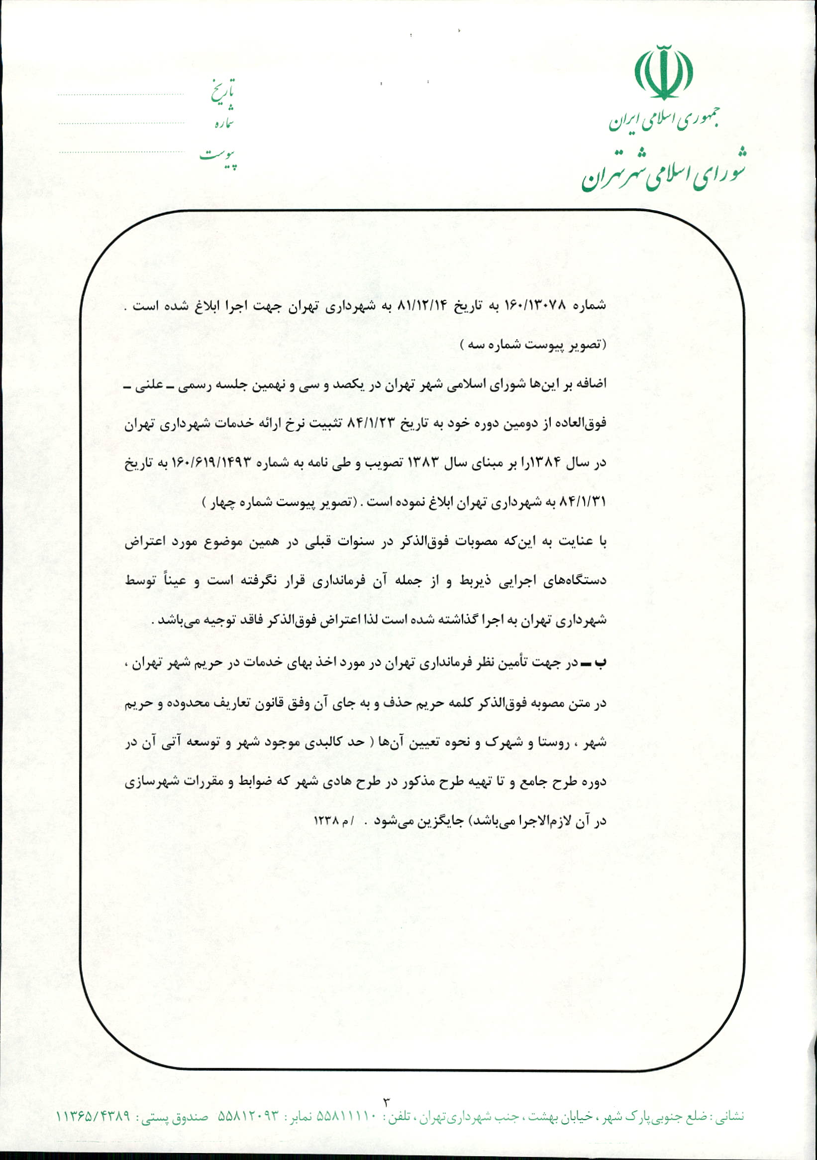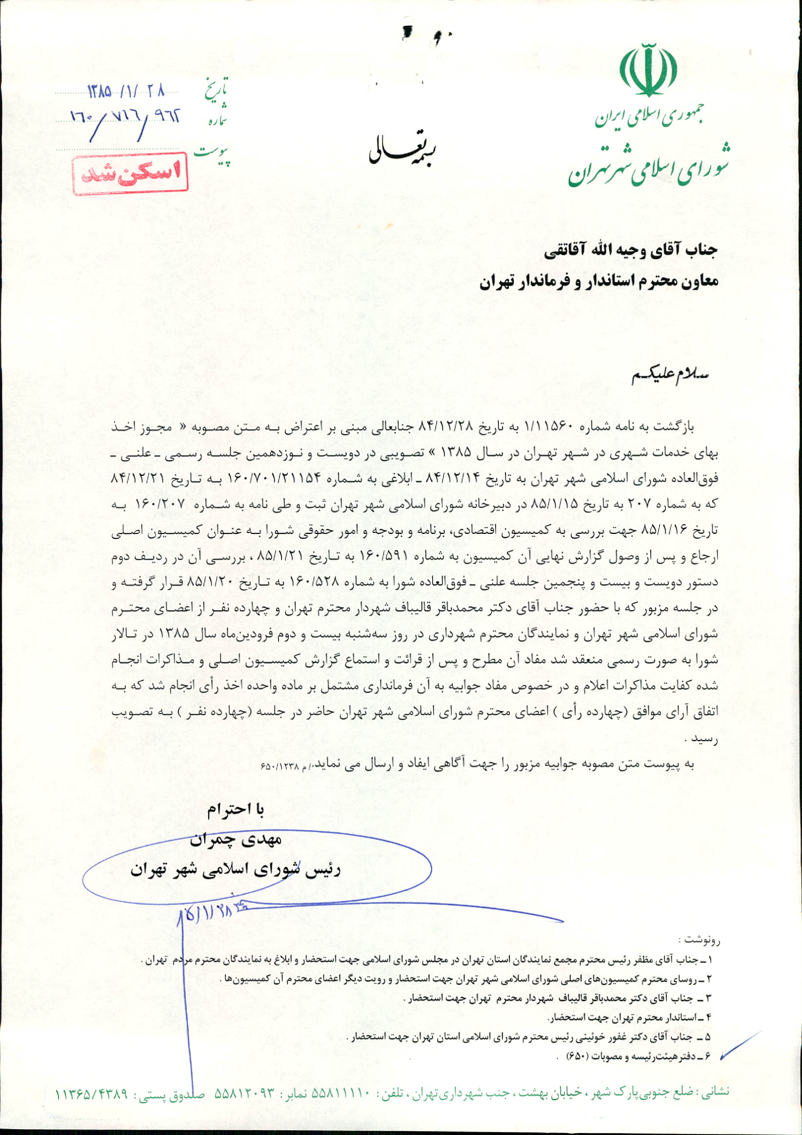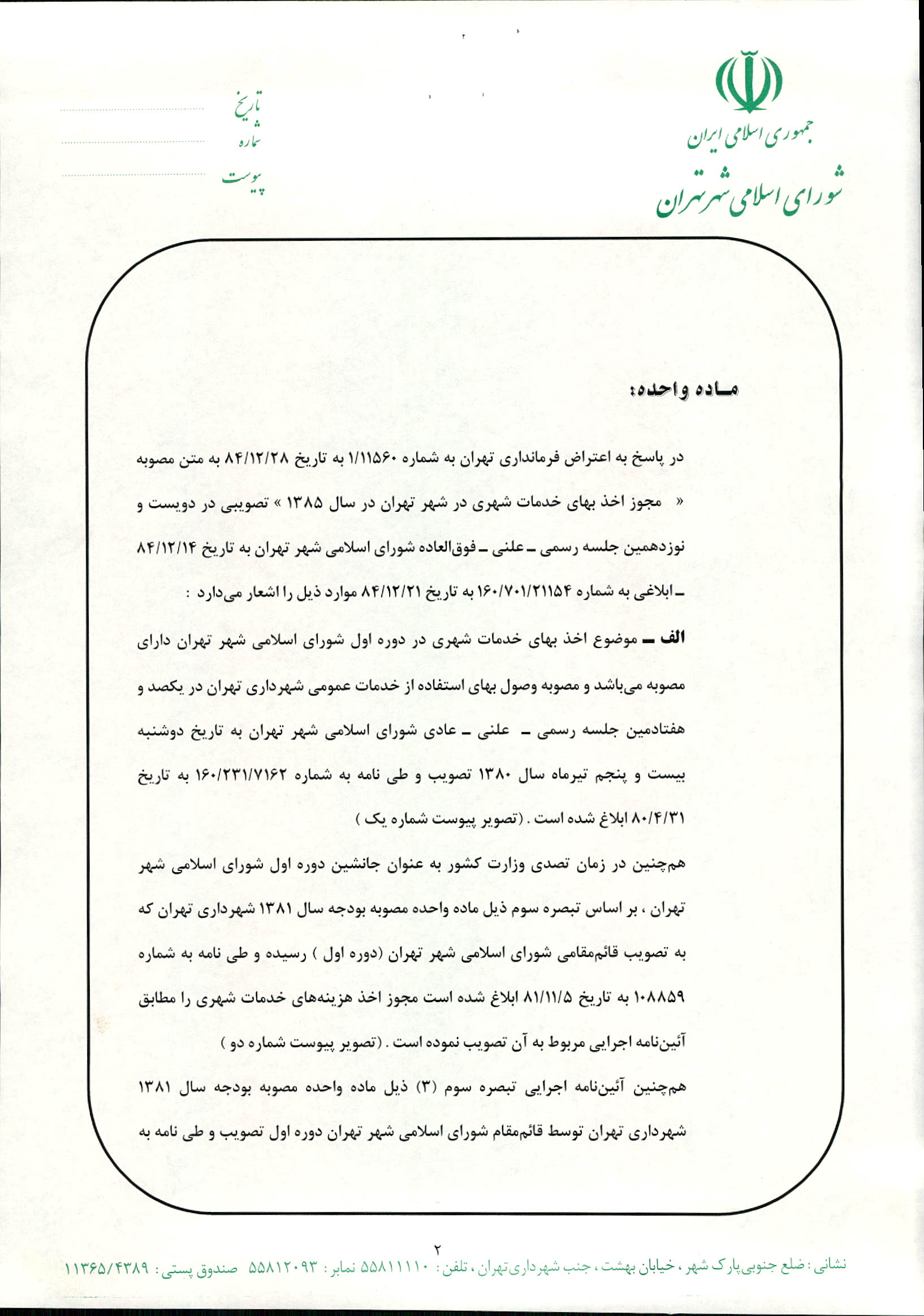 جوابيه شوراي اسلامي شهر تهران به اعتراض شماره 1/11560 به تاريخ 84/12/28 فرمانداري تهران به متن مصوبه «مجوز اخذ بهاي خدمات شهري در شهر تهران در سال 1385» تصويبي در دويست و نوزدهمين جلسه رسمي - علني – فوقالعاده شوراي اسلامي شهر تهران به تاريخ 84/12/14 - ابلاغي به شماره 160/701/21154 به تاريخ 84/12/21