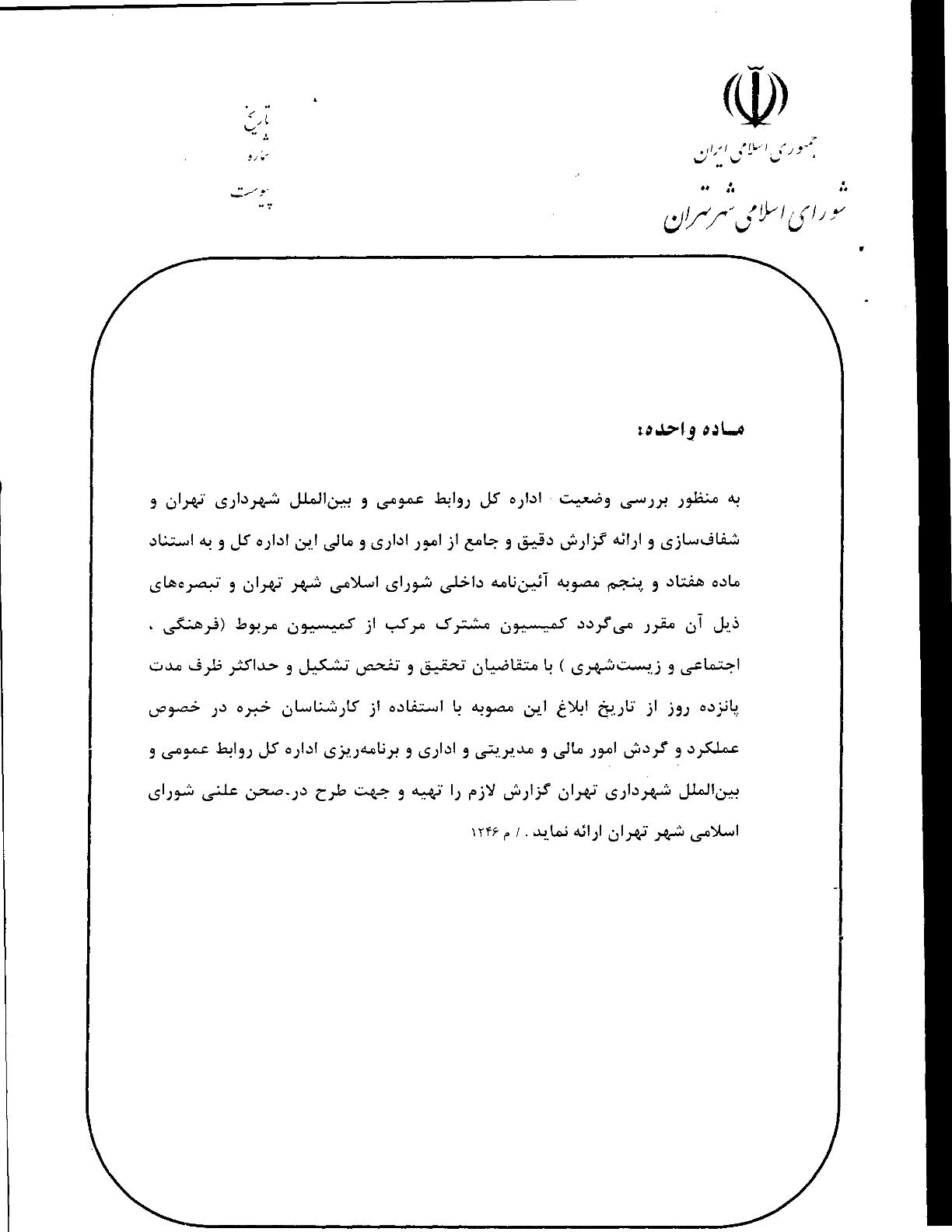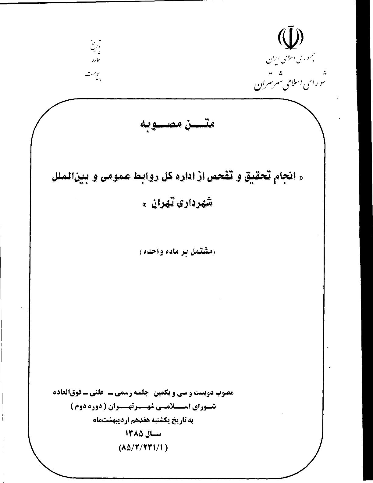 انجام تحقيق و تفحص از اداره كل روابط عمومي و بينالملل شهرداري تهران