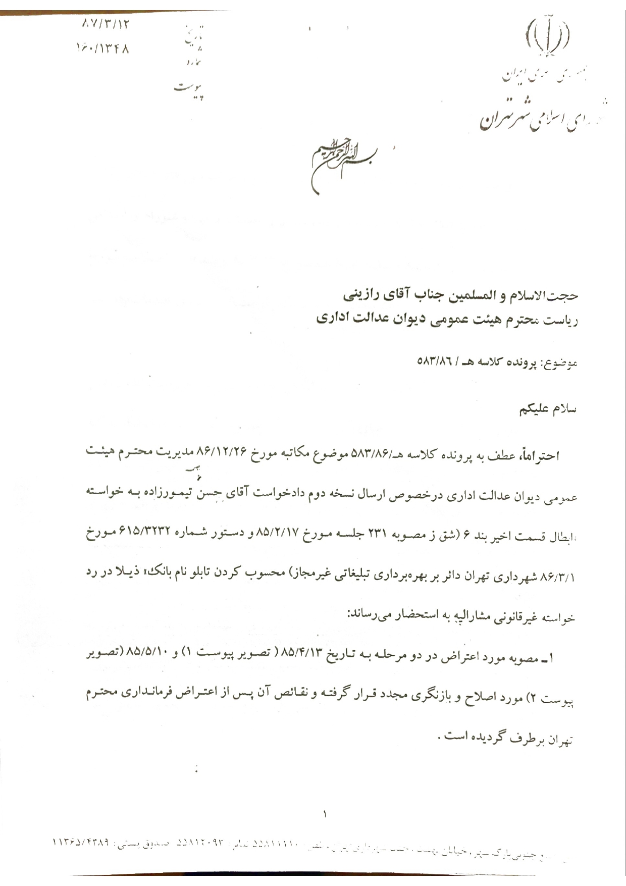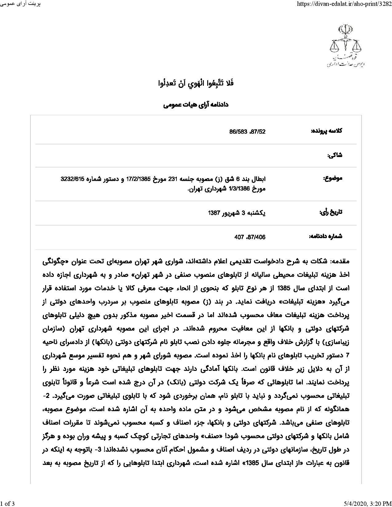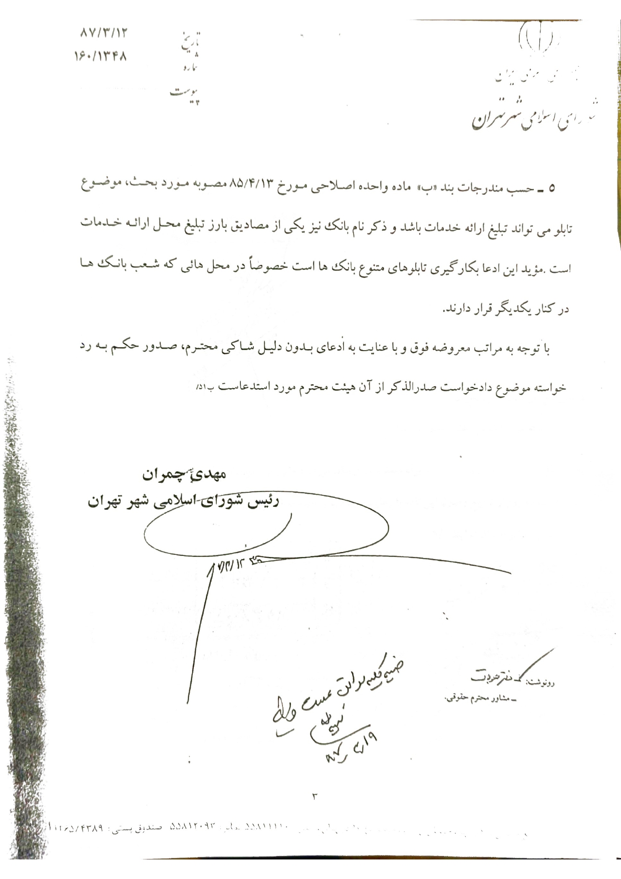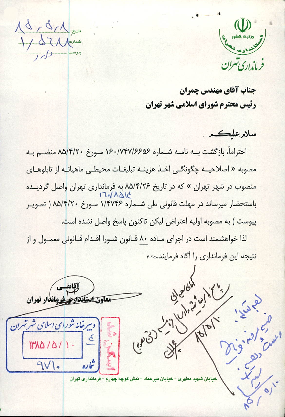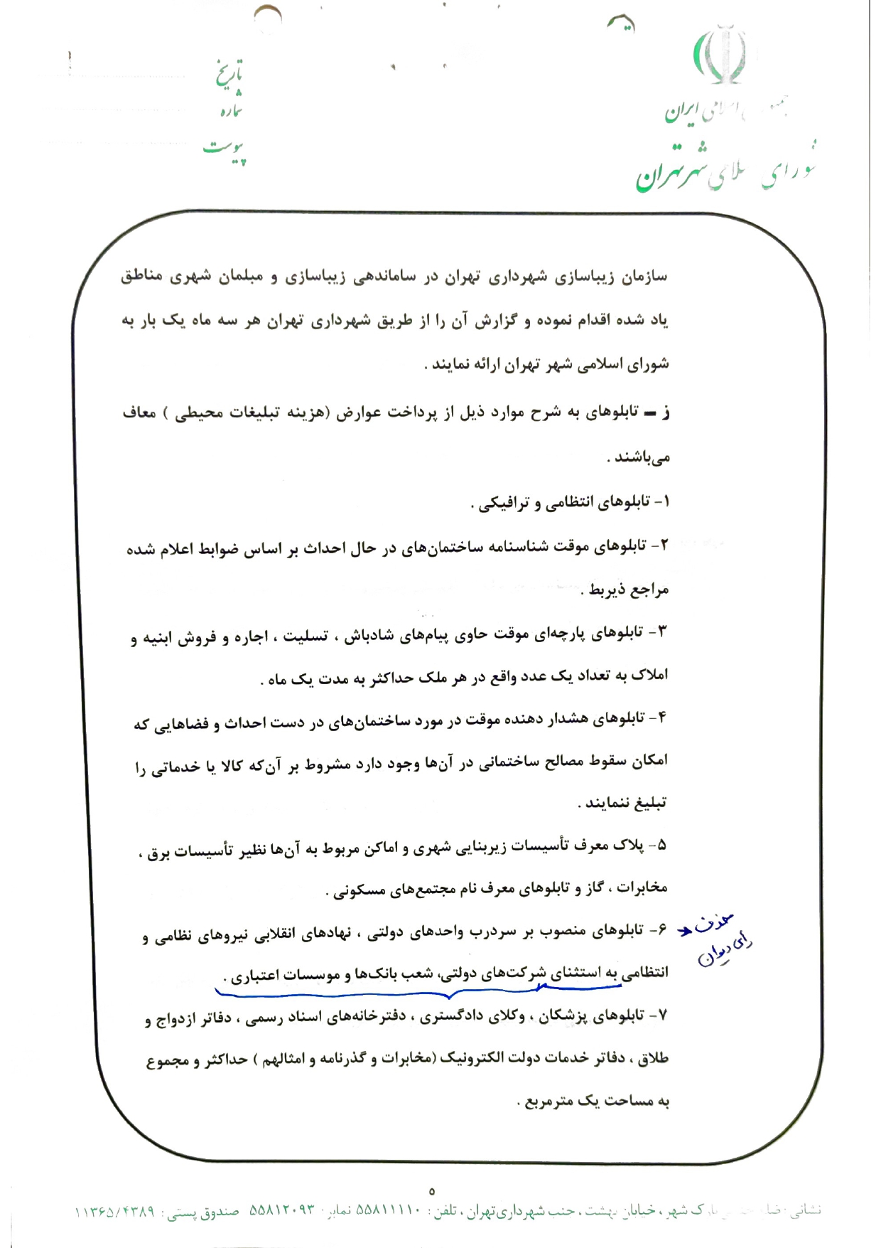 چگونگي اخذ هزينههاي تبليغات محيطي ماهيانه از تابلوهاي منصوب صنفي در شهر تهران