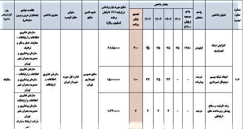 حكم 106- توسعه زيرساختهاي ارتباط ديجيتالي پايدار از قبيل؛ افزايش شبكه فيبر نوري به ميزان 300 كيلومتر، جايگزين نمودن ارتباطات راديويي در ساختمانهاي مهم وحساس شهرداري تهران، توسعه و تكميل شبكه مخابراتي بيسيم ديجيتال، ايجاد شبكه ارتباطي كمتوان گسترده (موسوم به lpwan) با همكاري بخش خصوصي و منطبق بر قوانين موضوعه، براي توسعه كاربرد اينترنت اشياء و حسگرها در سطح شهر تهران تا پايان برنامه
