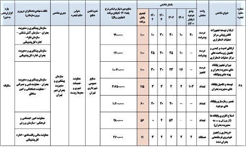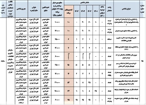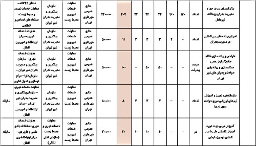 بخش 15: شهرداري تهران موظف است به منظور ارتقاي توان مديريت بحران، افزايش تابآوري شهر در حوادث و بلايا و همچنين ارتقاء ايمني شهر، نسبت به اجراي احكام ذيل اقدام نمايد: